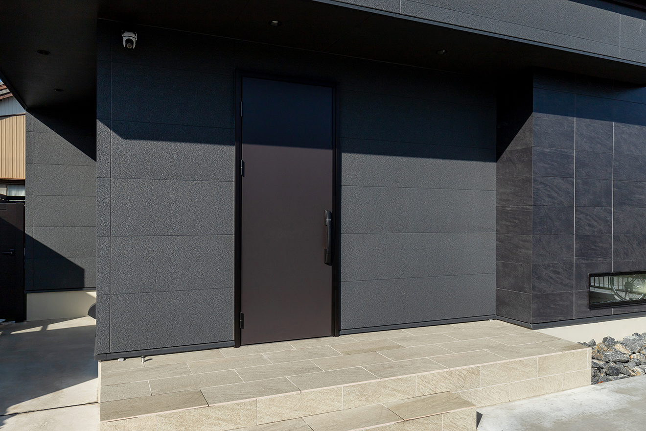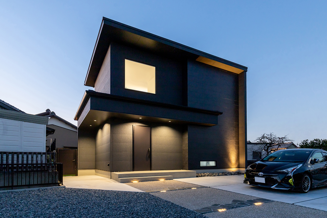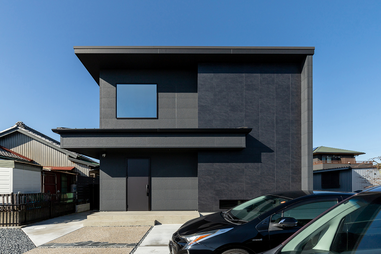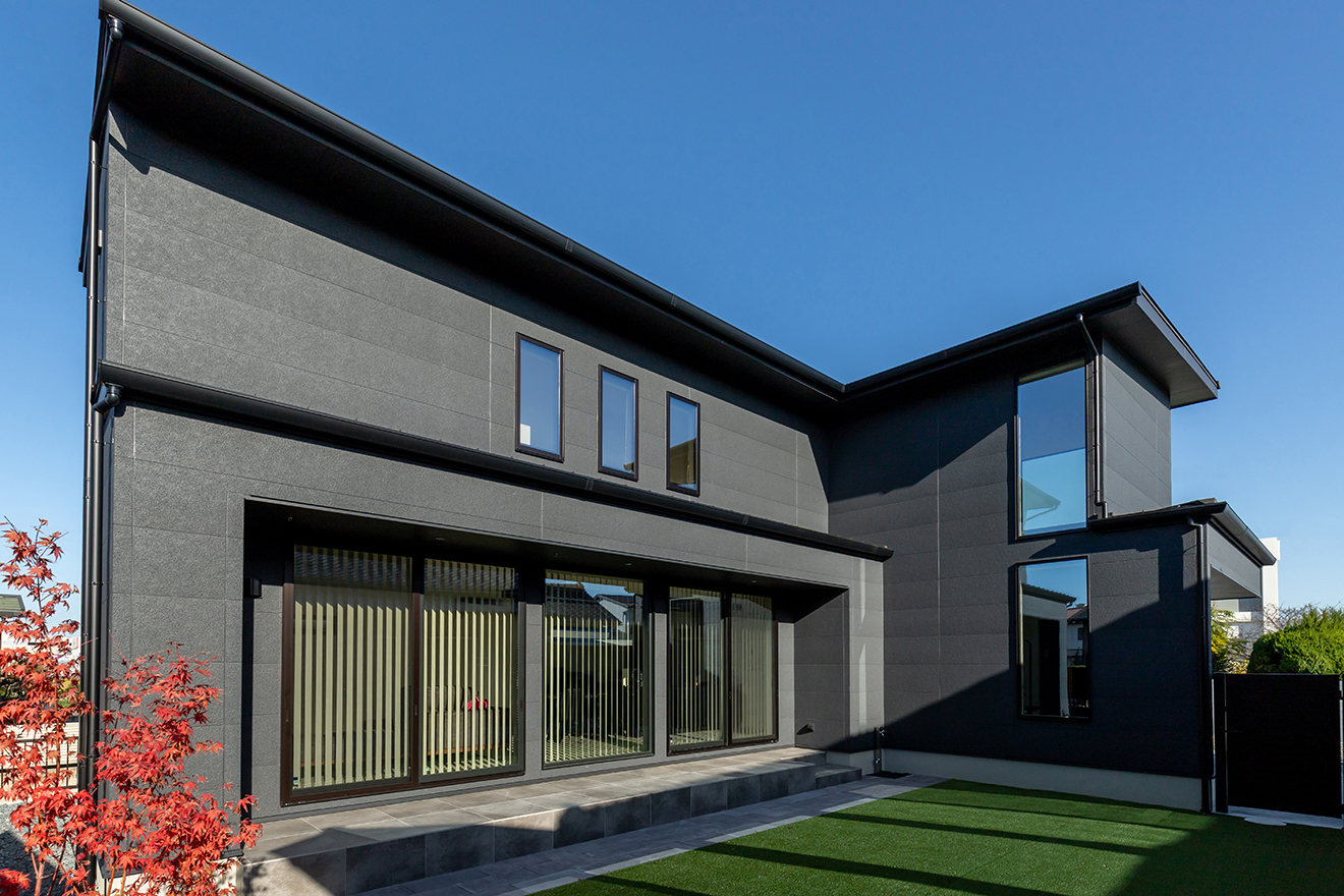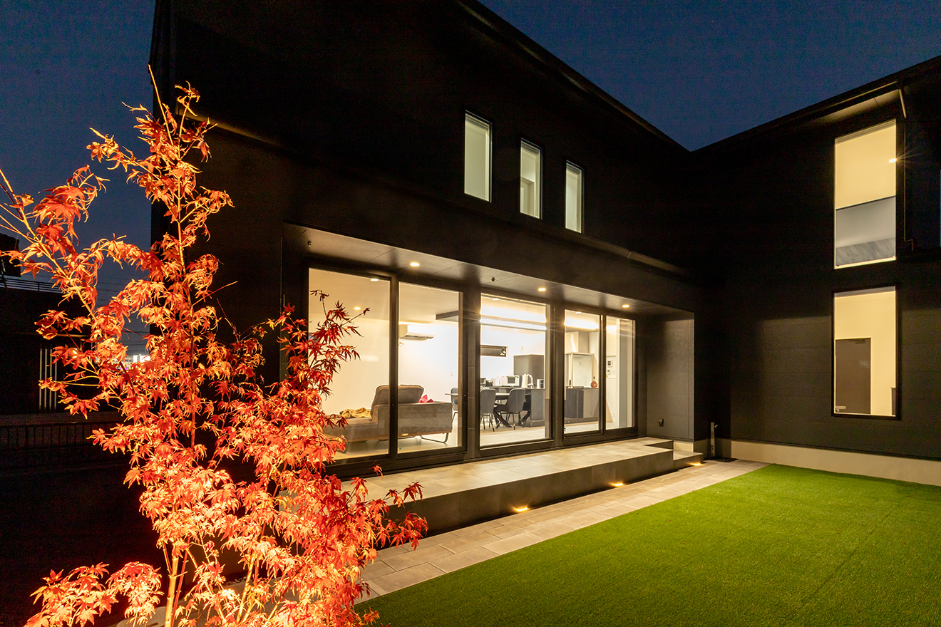 【中庭】外からの視線を気にせず過ごせるL字型の中庭で、家族との団らんを心置きなく楽しめます。【外観】水平に伸びる軒と吹き抜けの大きな窓が織りなす端正な佇まい。漆喰の質感と漆黒のタイルがコントラストを描くファサードは、街並みに調和しながらも重厚感が漂います。