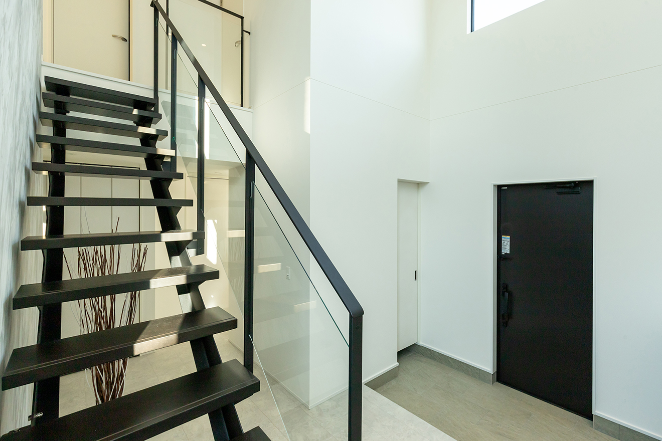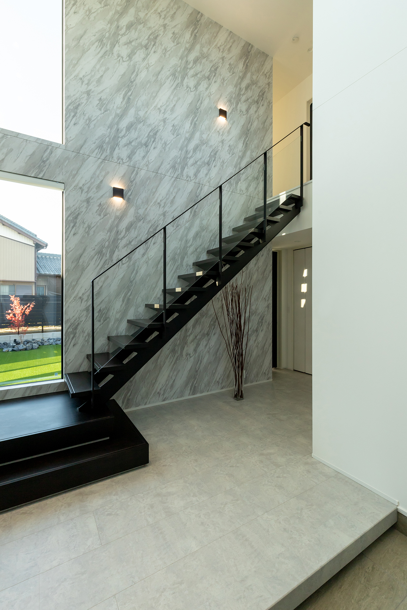 【玄関】この家最大のこだわりである鉄骨のストリップ階段。玄関に入って目に飛び込むその佇まいは、住まいの顔として圧倒的な高級感を放ちます。5m超の吹抜けと大きな窓から見える中庭の開放感は、正面のアクセントクロスを一層美しく際立たせます。また、ストリップ階段の視線の抜けにより、のびやかな広がりが感じられる仕上がりに。