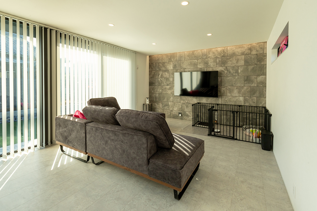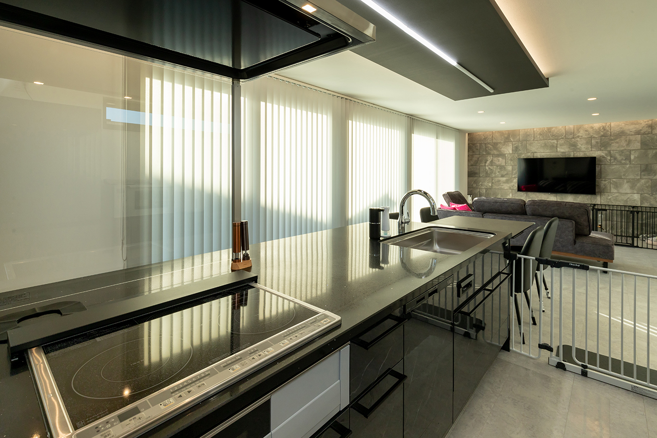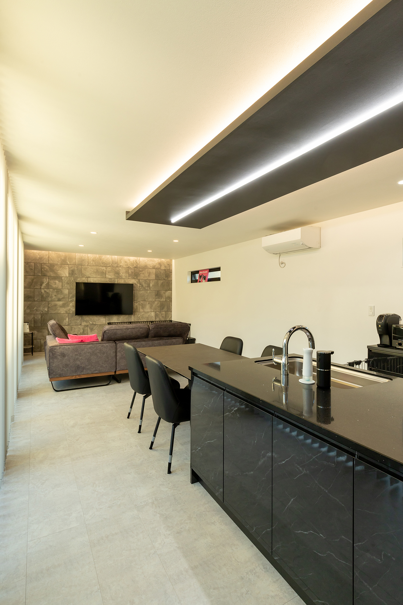 【LDK】テレビ背面はエコカラットを採用。石目調の重厚感に間接照明が溶け込み、上質なホテルライクな空間に。【キッチン】キッチン上部は折り下げ天井を採用。設備や家具と合わせたブラックのクロスで仕上げ、統一感をもたらしました。