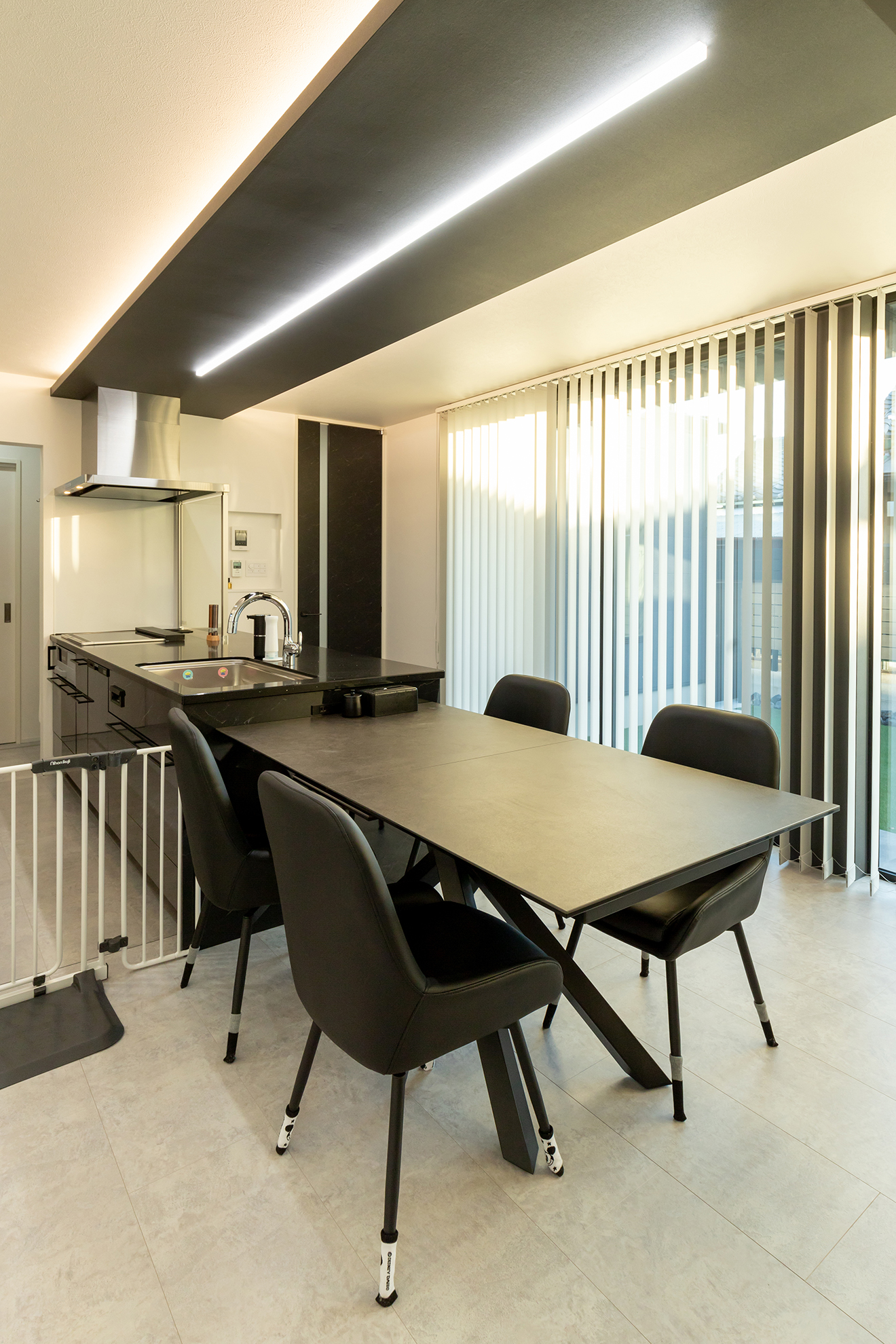 【キッチン】ダイニングは照明の存在感を抑えるため、埋め込み型のライン照明を採用。キッチンから一続きに伸びる光のラインは、空間を洗練された印象に引き立てます。中庭に面した3つの大開口の窓からは温かな光が差し込み、家族と過ごす時間に安らぎを添えてくれます。