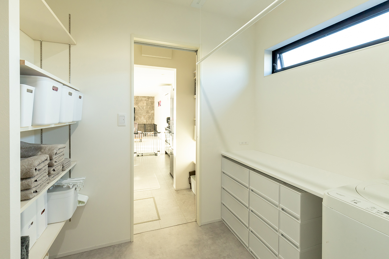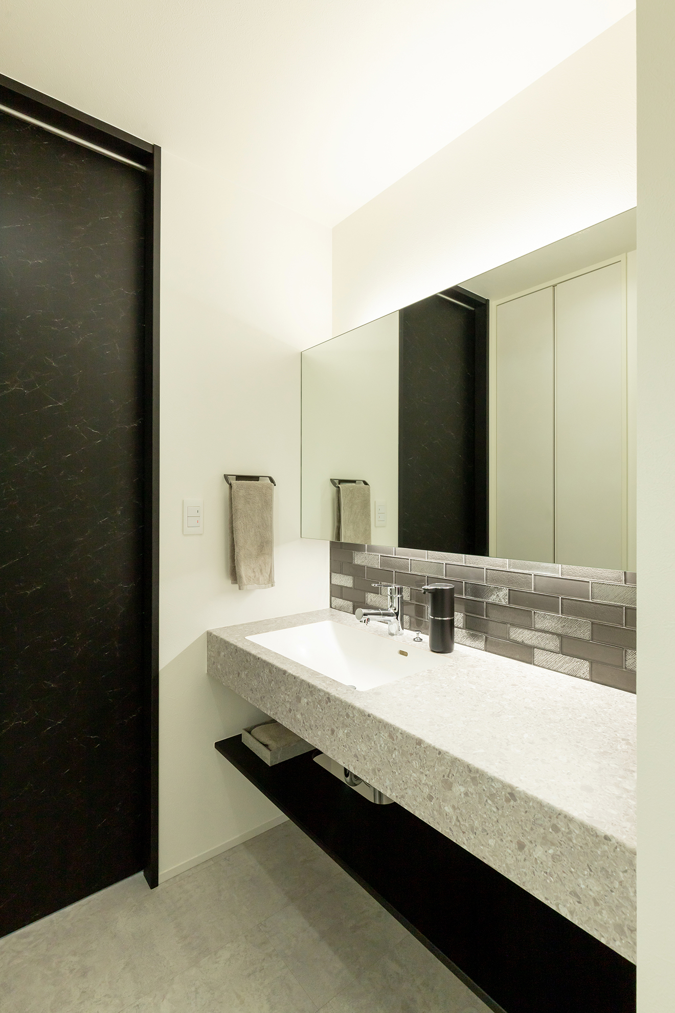 【脱衣室】白で統一された清潔感あふれるランドリールーム。十分な収納とアイロンスペースを確保した、ゆとりある設計です。【洗面】ガラスタイルと間接照明を採用したホテルライクな洗面スペース。窓のない間取りは計算された照明で外光に頼らない明るさと開放感を生み出しました。