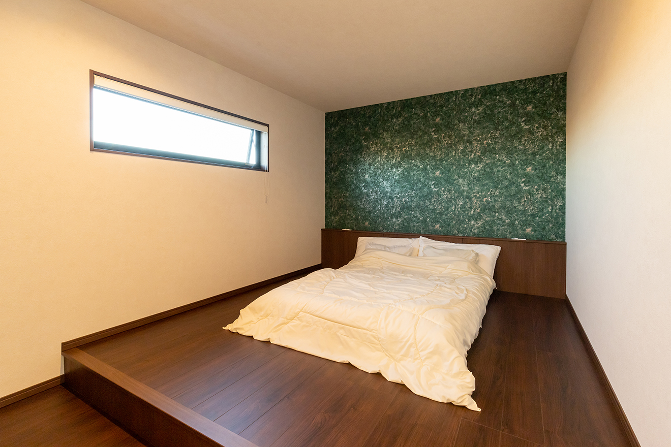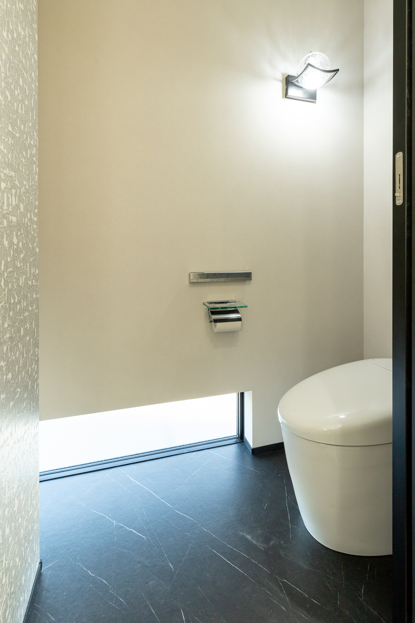 【トイレ】足元の地窓からこぼれる柔らかな光が、心地よい落ち着きをもたらすモダンなトイレ。【主寝室】一階のホテルライクな装いとは趣を変えた、落ち着いた主寝室。奥様お気に入りのアクセントクロスが映える、小上がりを採用した一室です。照明は足元のダウンライト3灯のみに抑え、雰囲気豊かな空間に仕上げました。