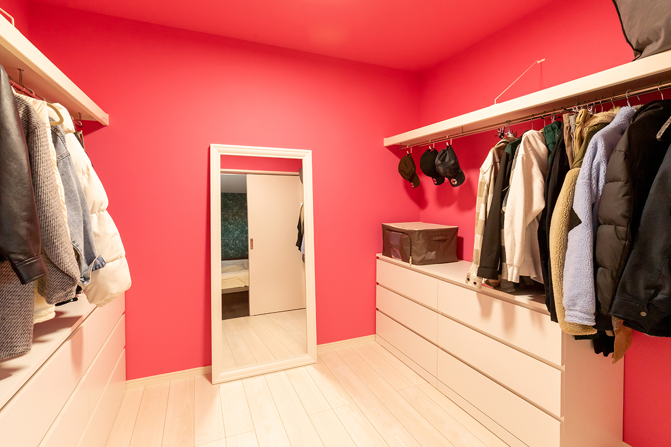 【ウォークインクローゼット】奥様お気に入りのショッキングピンクのクロスを採用したウォークインクローゼット。扉を開けるたびに、毎日の気分を華やかに盛り上げてくれます。