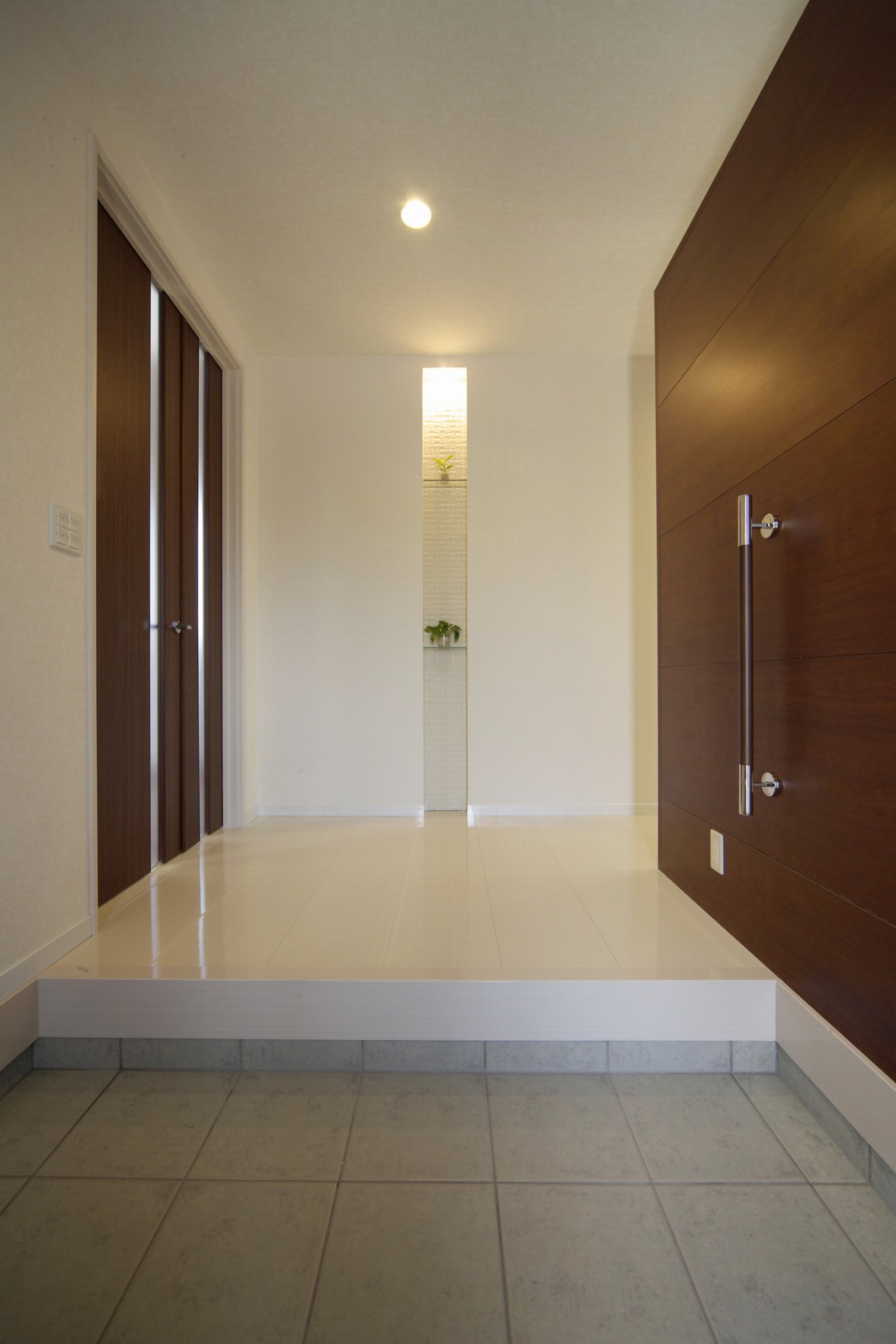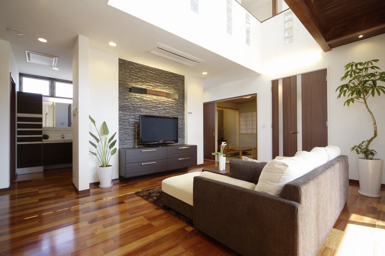 【玄関ホール】ホワイト系の石目調床材で、明るく高級感あるホテルライクな玄関ホール 【リビング】ウォールナットをベースにまとめたお洒落なLDK空間。縦に伸びる吹き抜けが更なる広がりを生み出します。アクセントウォールが室内に新鮮な変化をもたらします。ホワイトとブラウンを基調とした落ち着いた配色もポイントです。