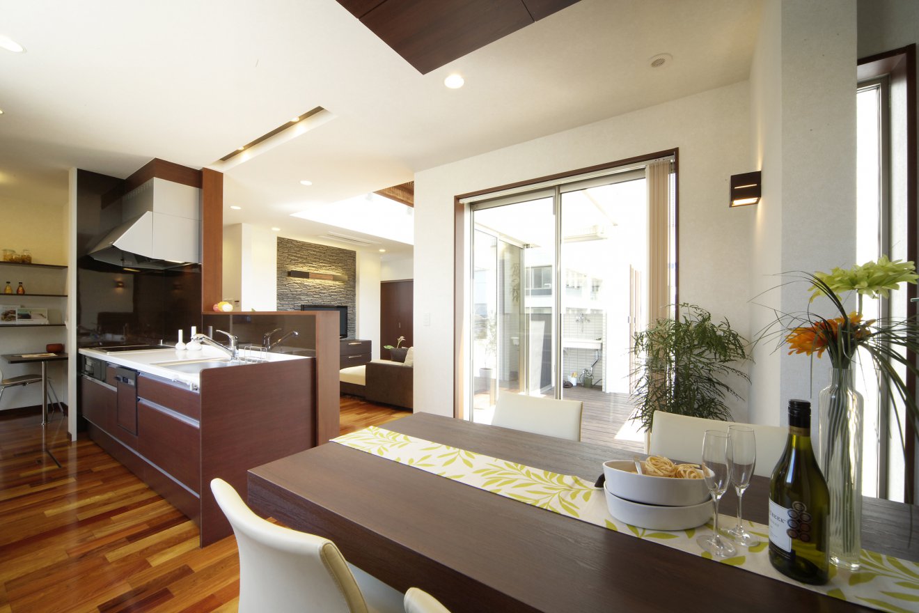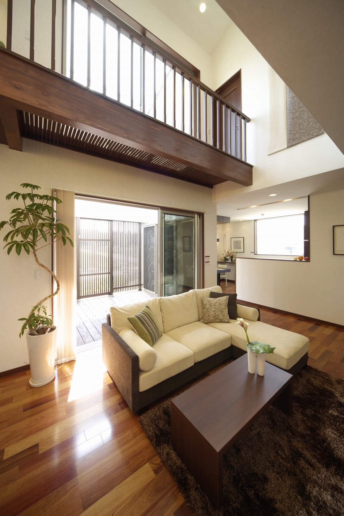 【DK】L字型レイアウトのLDK。リビング・ダイニングがそれぞれウッドデッキに面しているため、屋外とのつながりがある開放的な間取りです。 【吹き抜け】吹き抜けがリビングに高さ方向の広がりをもたらしています。リビングの隅々にまで光が差し込むように、キャットウォークの床と壁を格子にしました。