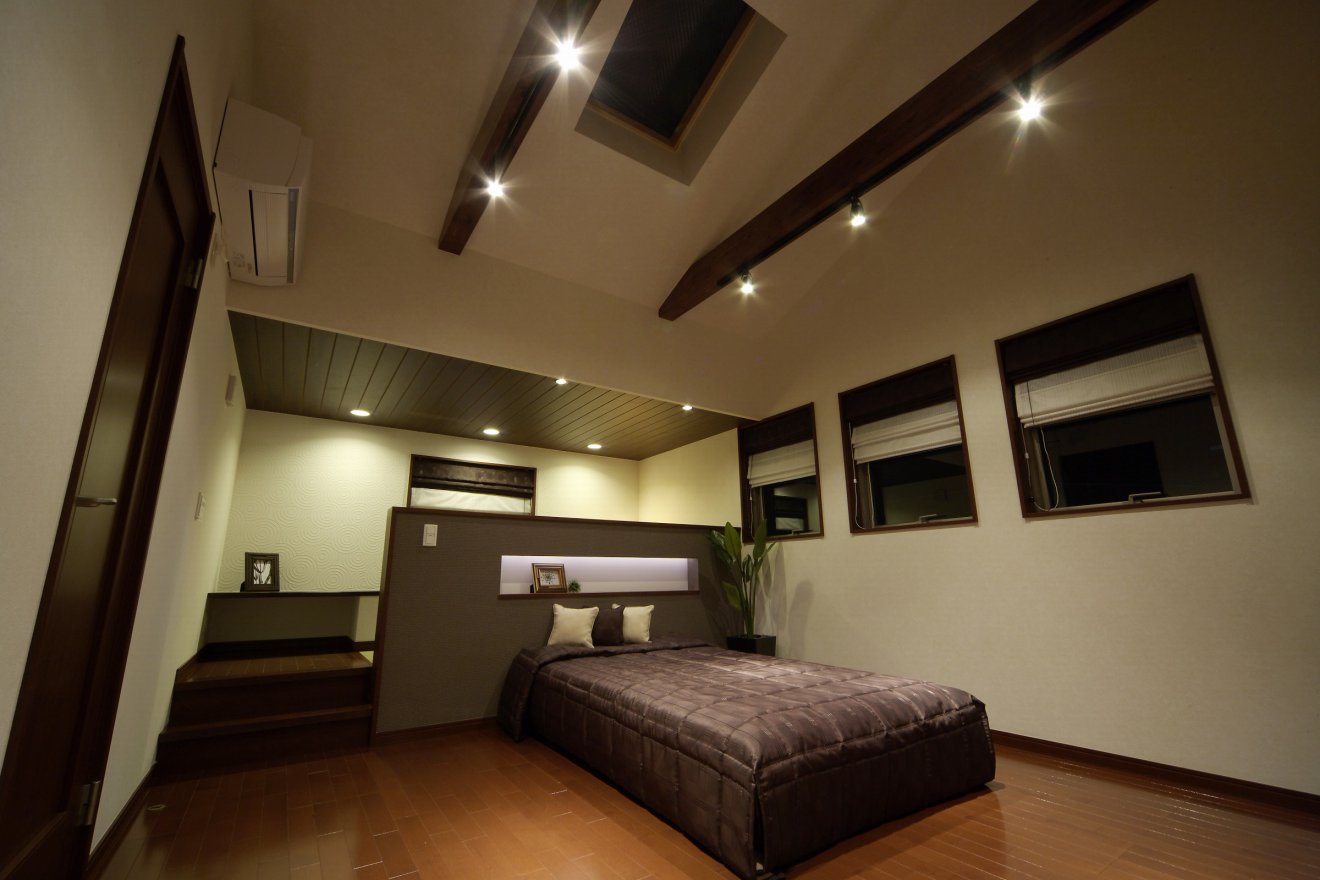 【主寝室】主寝室は、開放感のある勾配天井とアクセントの梁でワンランク上の仕上げになりました。 【書斎】床上げした書斎スペースを設けました。ほどよい『こもり感』で、とても落ち着ける居心地のいい空間になっています。
