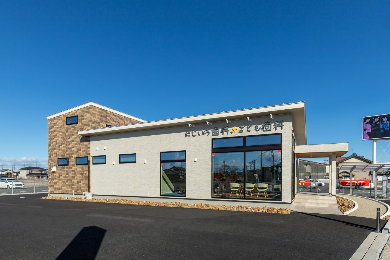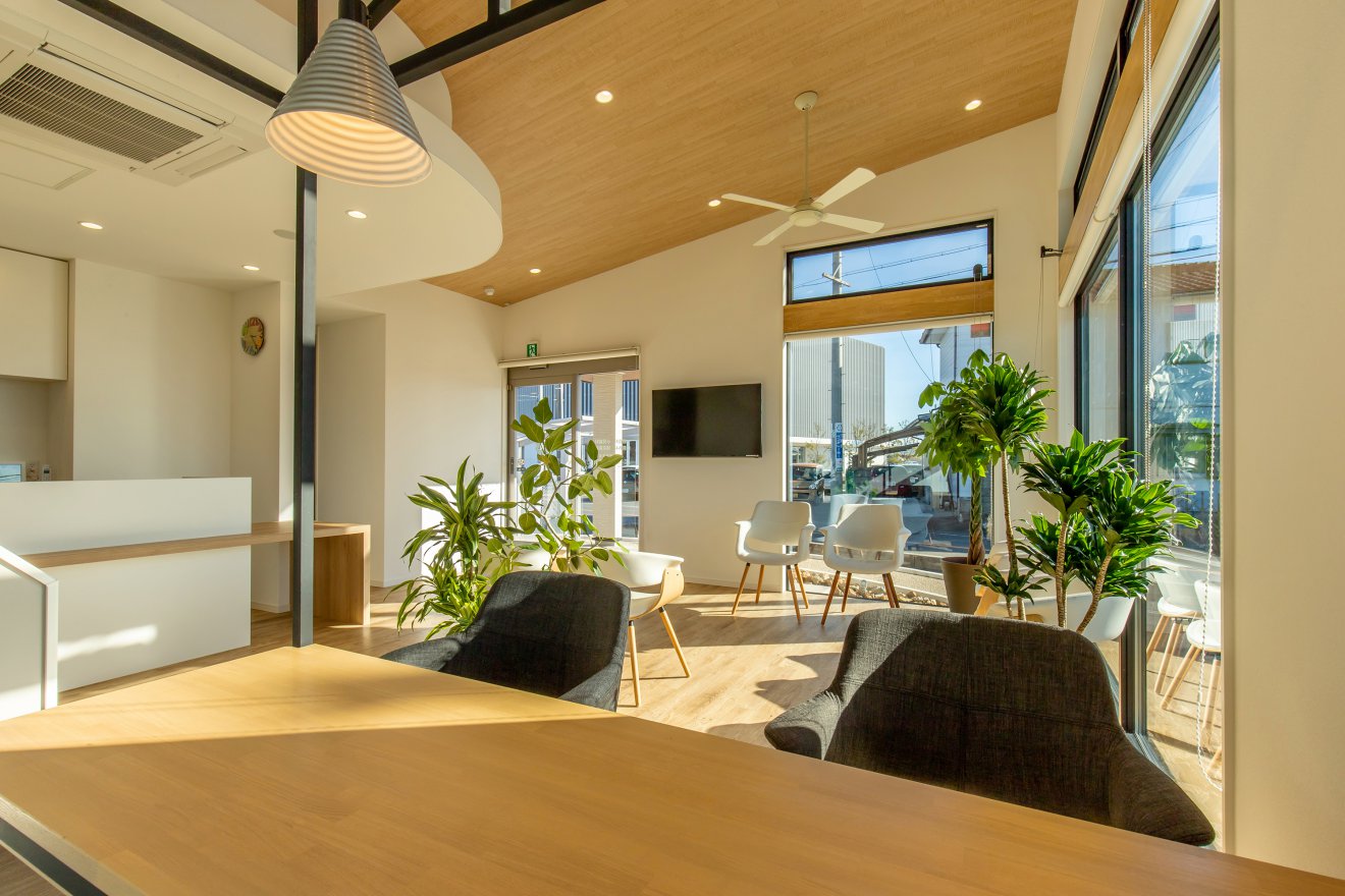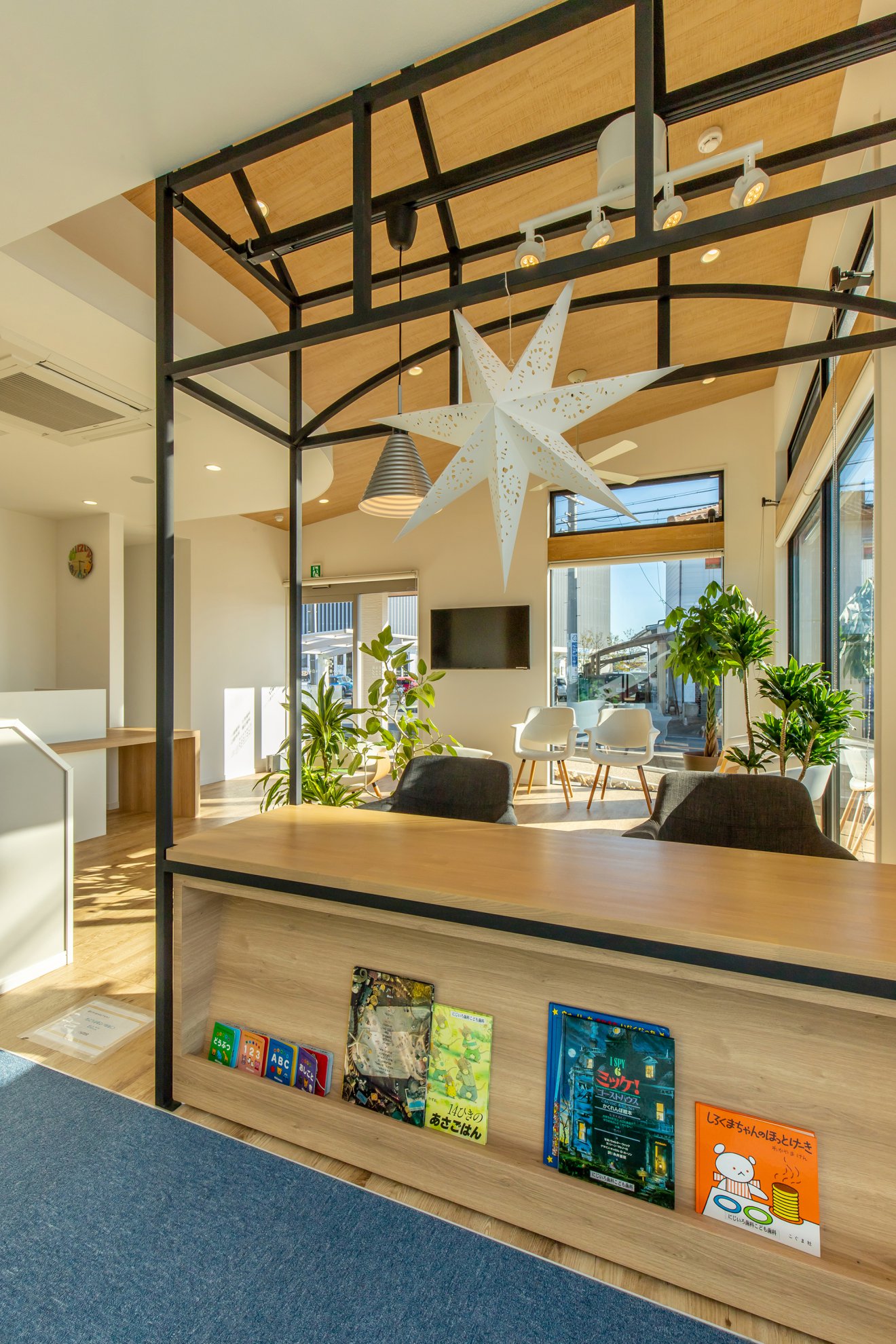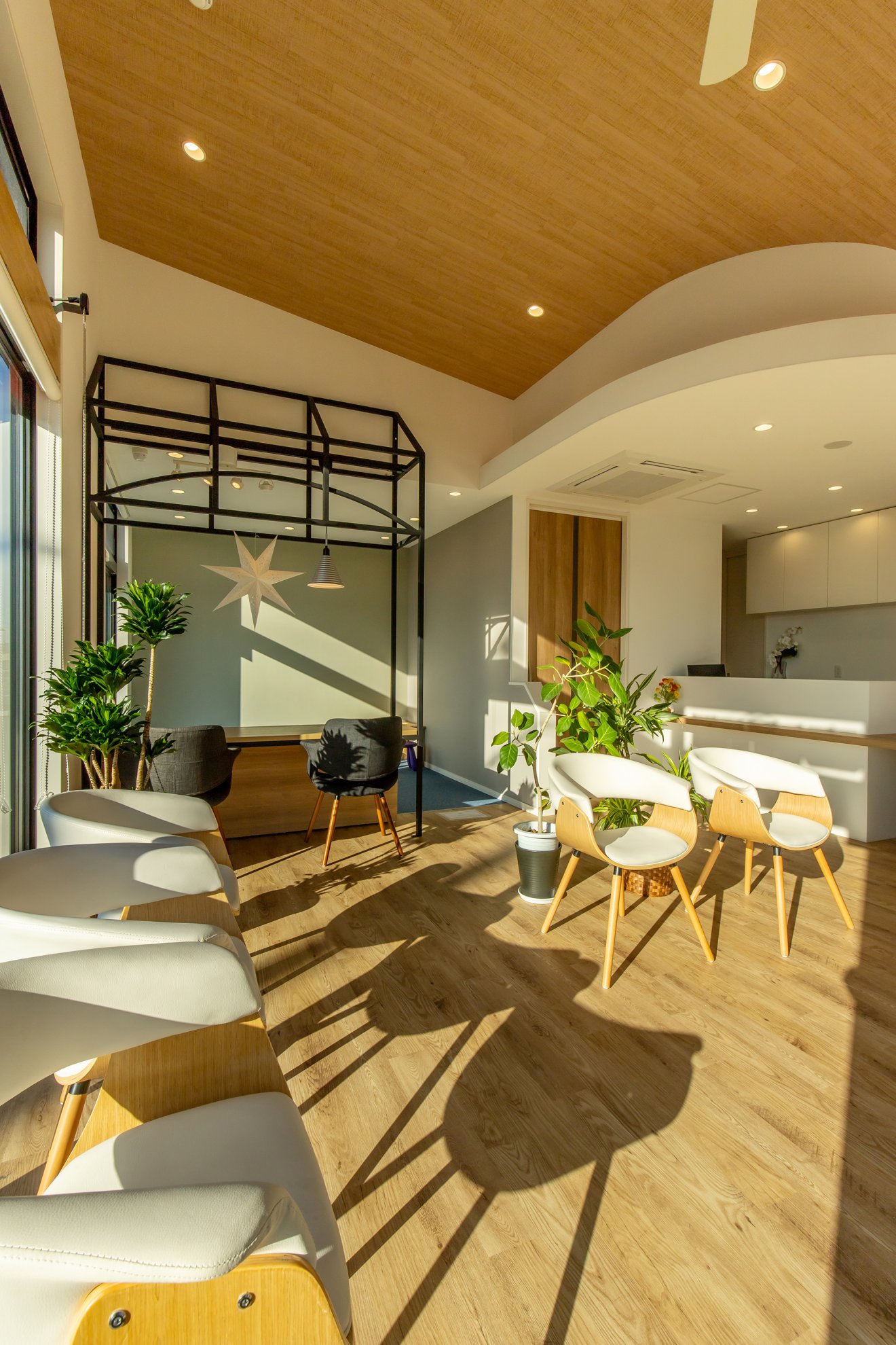 地域に馴染むスタイリッシュな外観は、アプローチしやすくデザイン性に優れています。待合い室はナチュラルな木目と陽光に包まれ、勾配天井でより開放的に。キッズルームを完備し、診療室はお子様がリラックスできるように落ち着いた色調でコーディネートしました。
