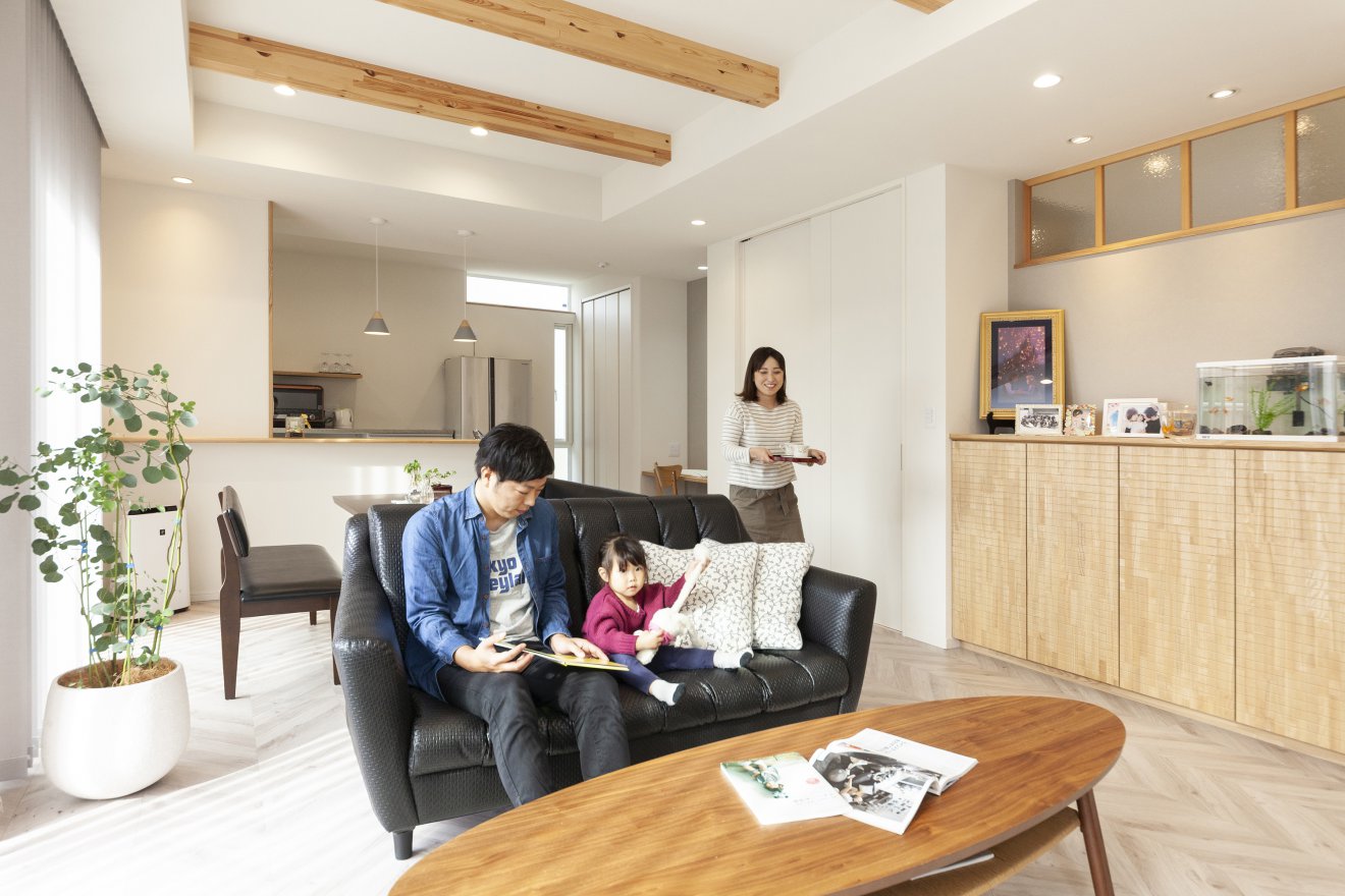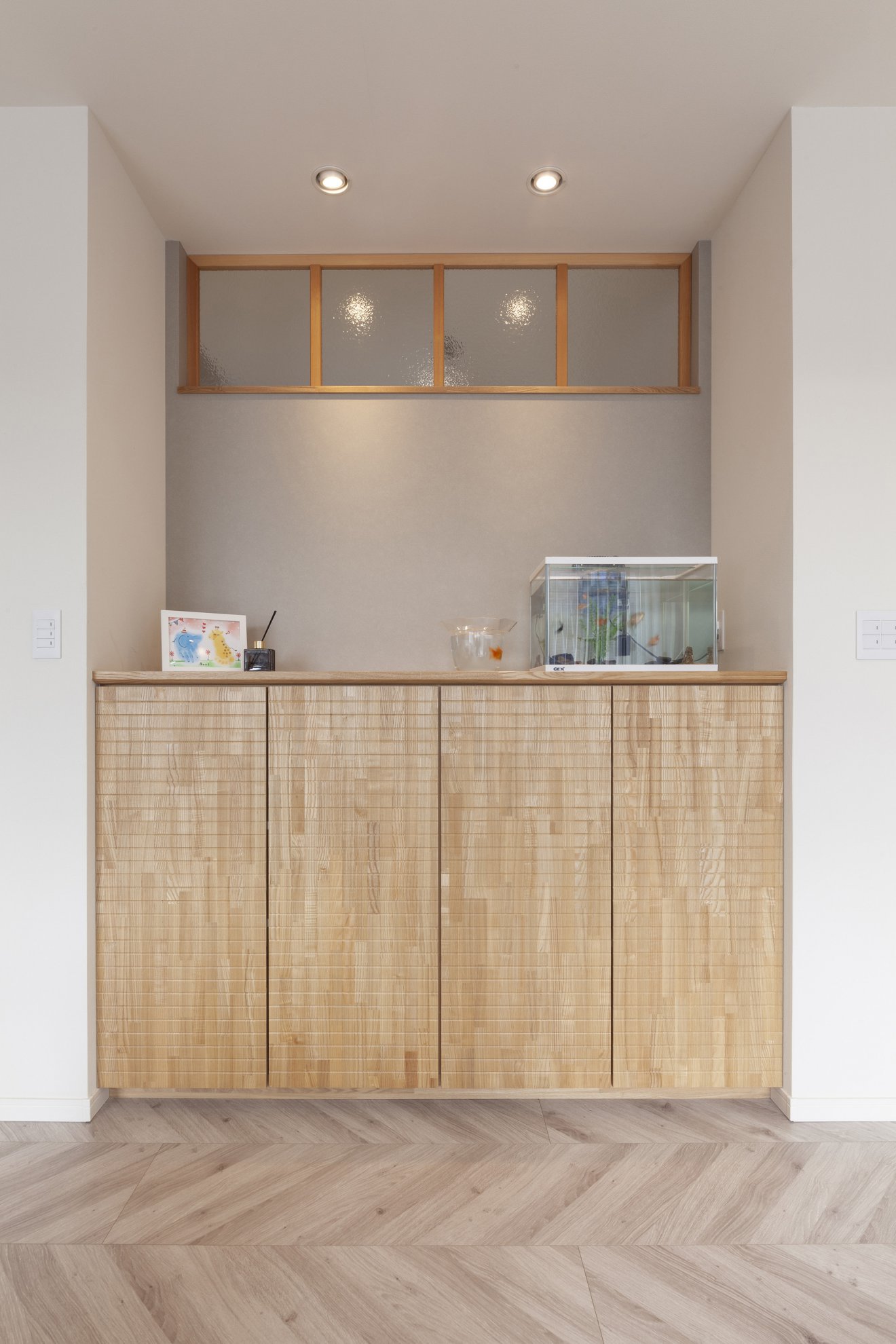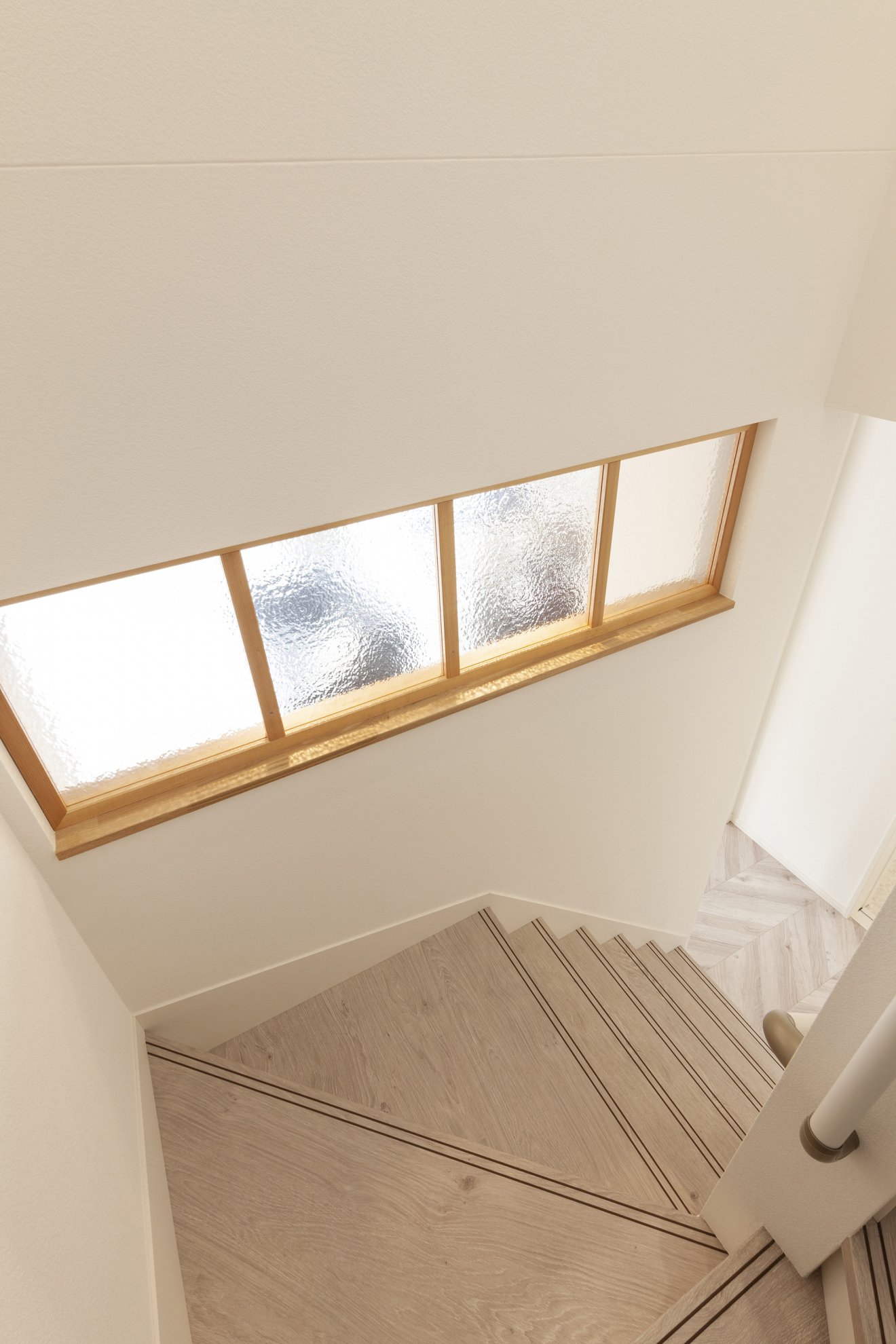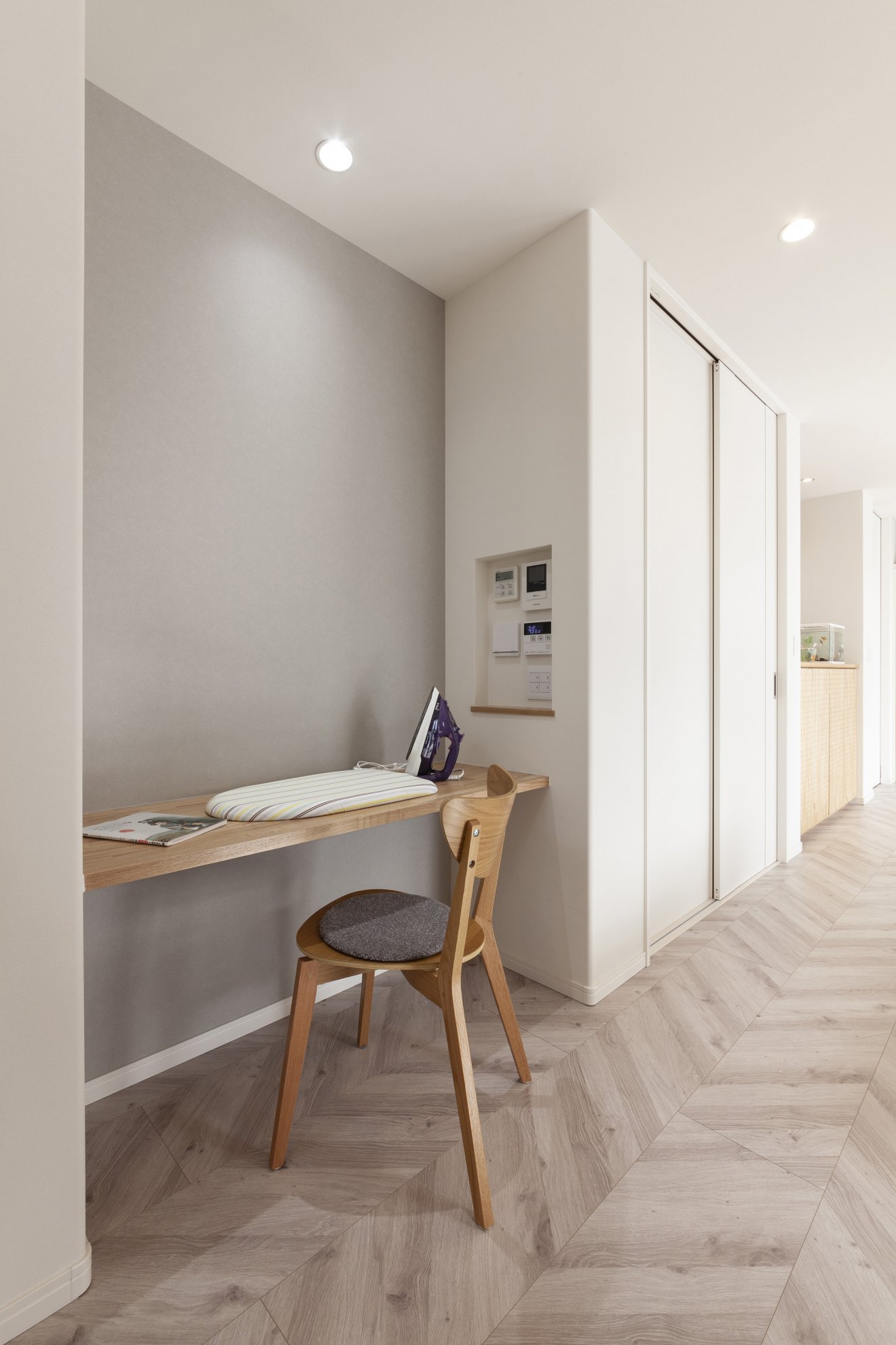 クラシカルな印象を与える、ヘリンボーン調フローリングを採用。床材のホワイトオーク色に合わせて、壁紙や照明器具はライトグレーに統一しました。リビングは、収納と壁の面を揃えてスッキリとした印象に。キッチン横のカウンターはアイロンやミシンがけなど、多目的に利用できます。暗くなりがちな階段には、陽の光が効果的に差し込むよう室内窓を設置。家中が明るく落ち着きのある雰囲気にまとまりました。