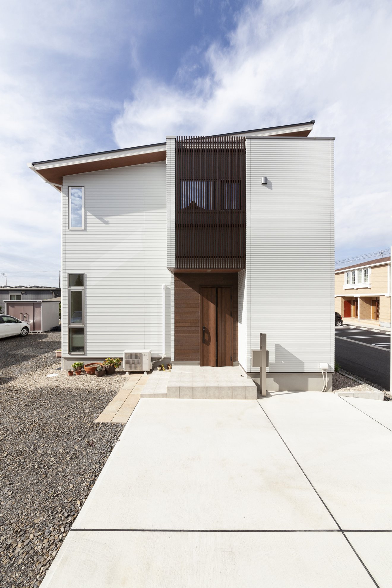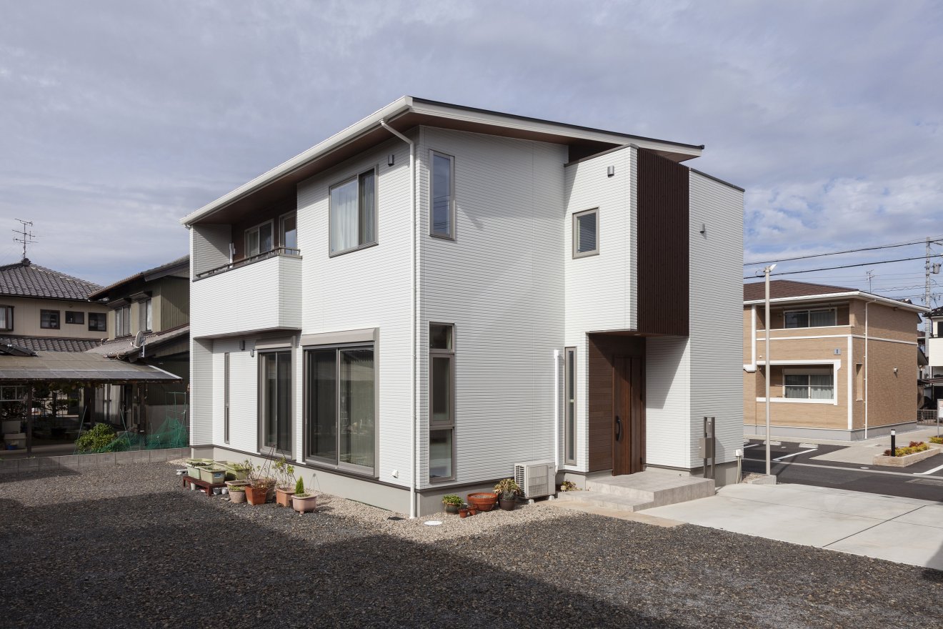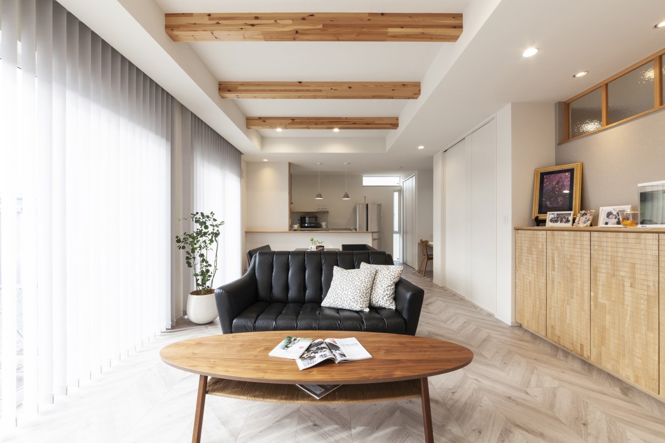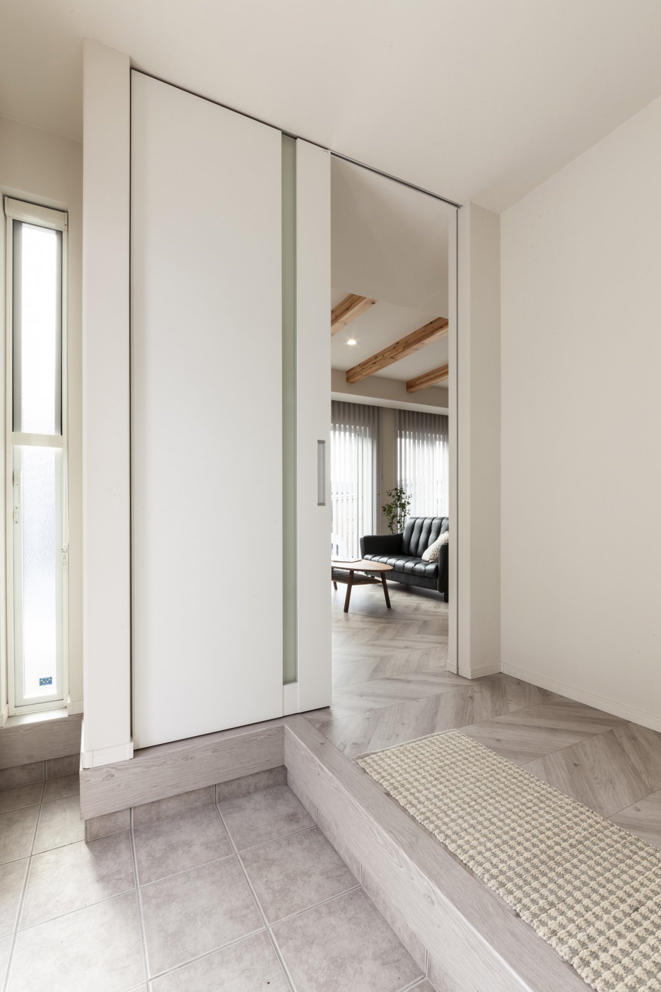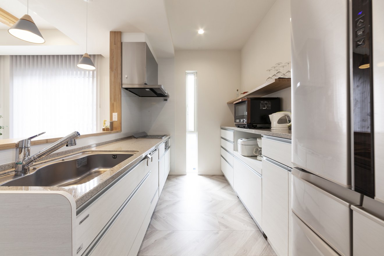 クラシカルな印象を与える、ヘリンボーン調フローリングを採用。床材のホワイトオーク色に合わせて、壁紙や照明器具はライトグレーに統一しました。リビングは、収納と壁の面を揃えてスッキリとした印象に。キッチン横のカウンターはアイロンやミシンがけなど、多目的に利用できます。暗くなりがちな階段には、陽の光が効果的に差し込むよう室内窓を設置。家中が明るく落ち着きのある雰囲気にまとまりました。