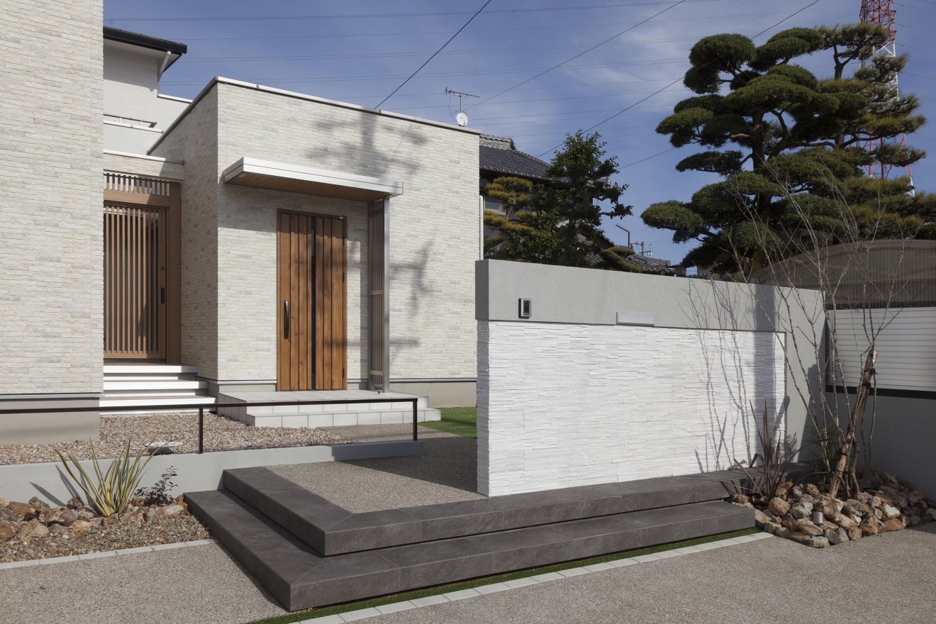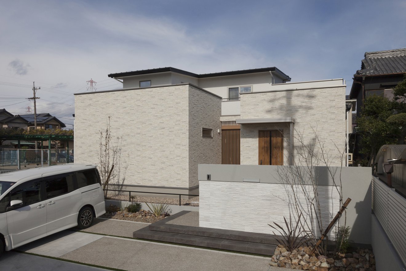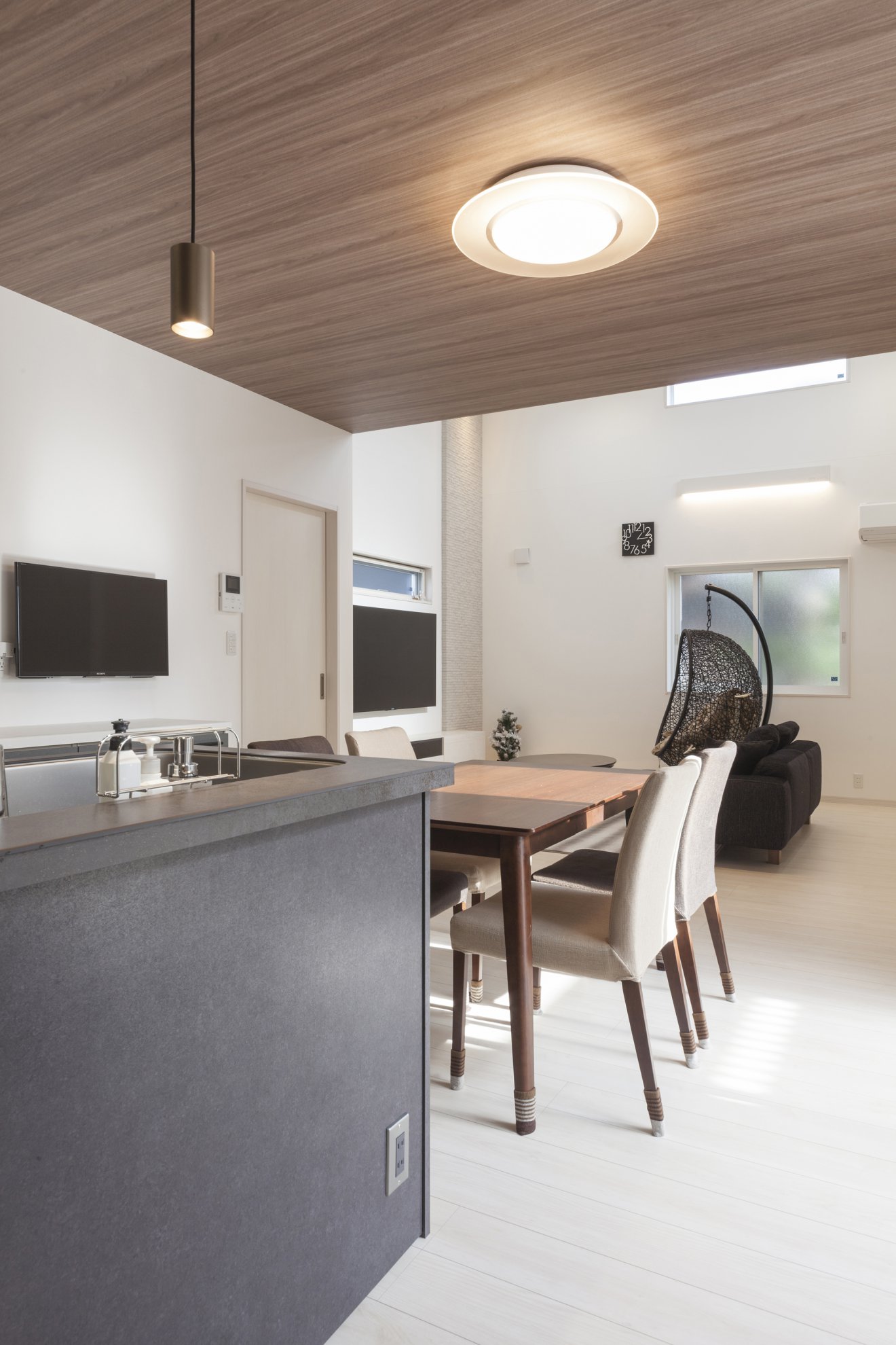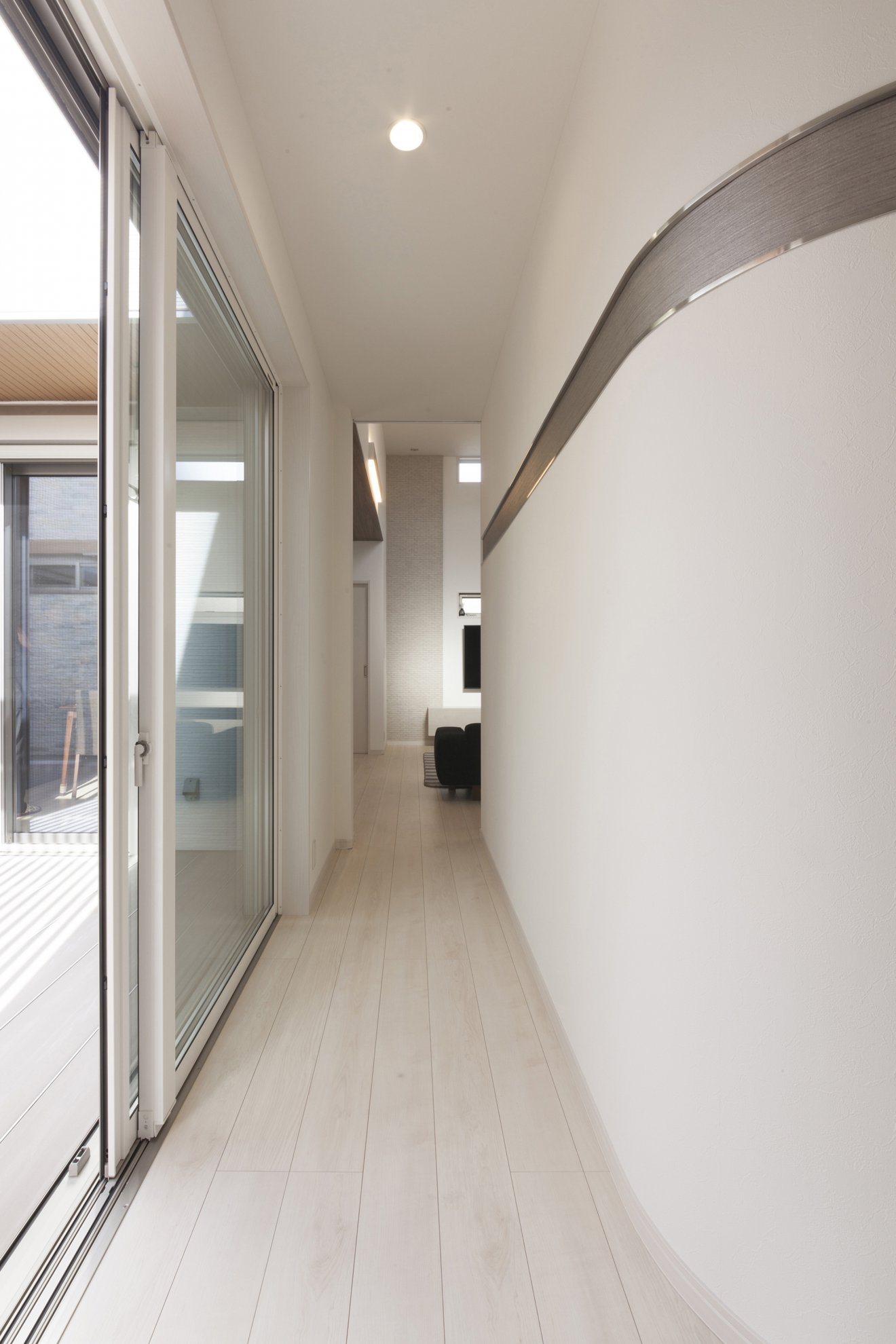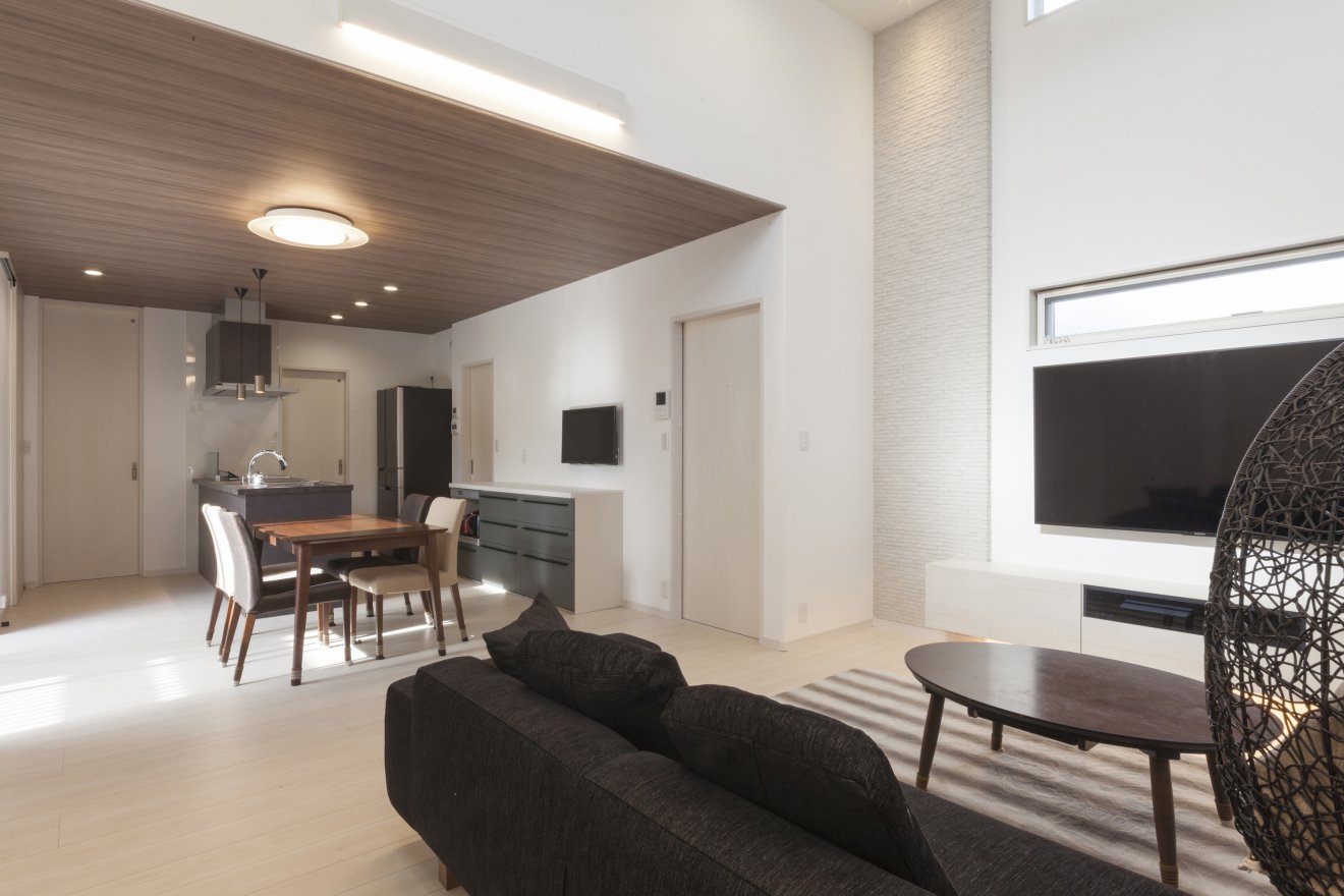 約10帖のウッドデッキを住まいの中心に配置し、建物全体に光と風を取り込む空間提案を行いました。外部からの視線はスクリーンで遮断し、プライバシーを確保。多目的に利用できるスペースとしました。玄関から続く廊下は、壁面を曲線にして柔らかな雰囲気に。天井高3.8mのリビングは開放感にあふれています。キッチンはセラミックトップのフラット型を採用。他の水回りとは回遊型の動線で結ばれ、家事のしやすい間取りとなっています。LDKには2帖のパントリーと3帖のファミリークローゼットが隣接しており、十分な収納力を備えています。