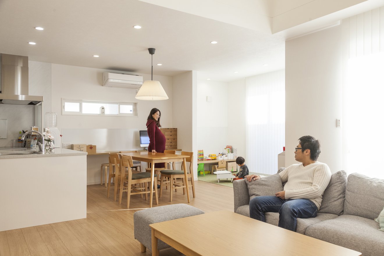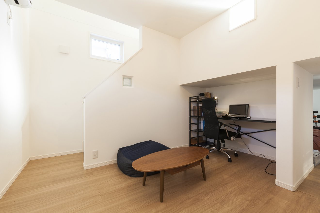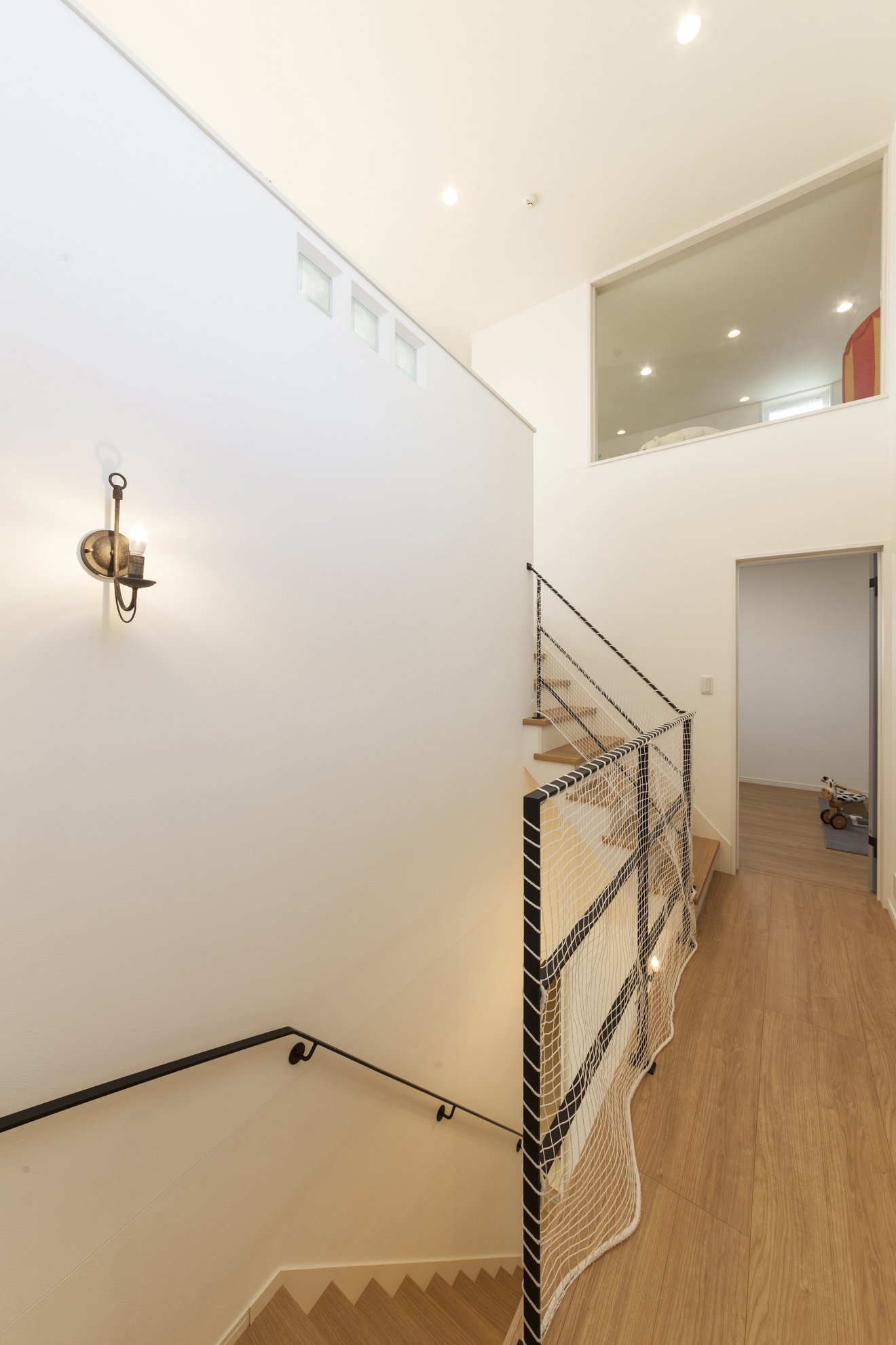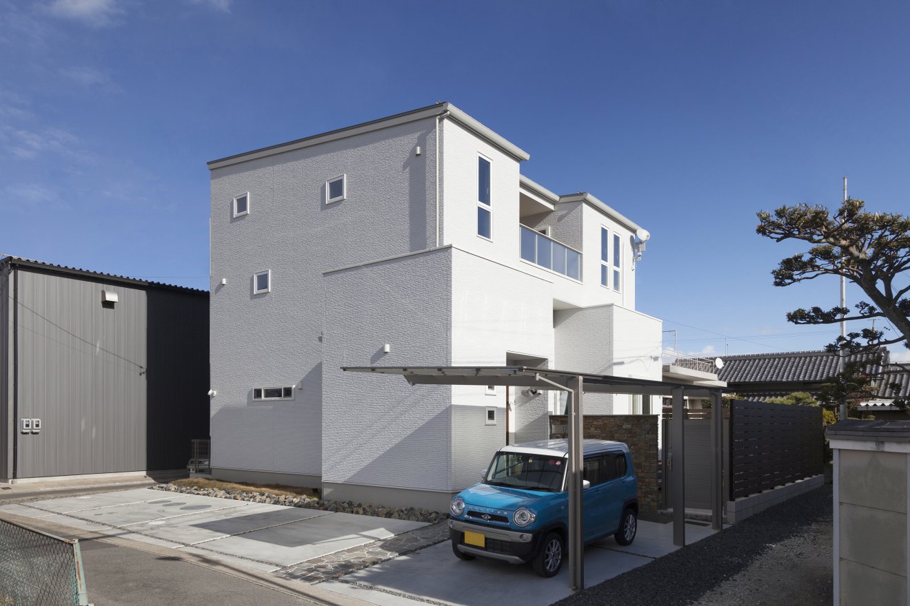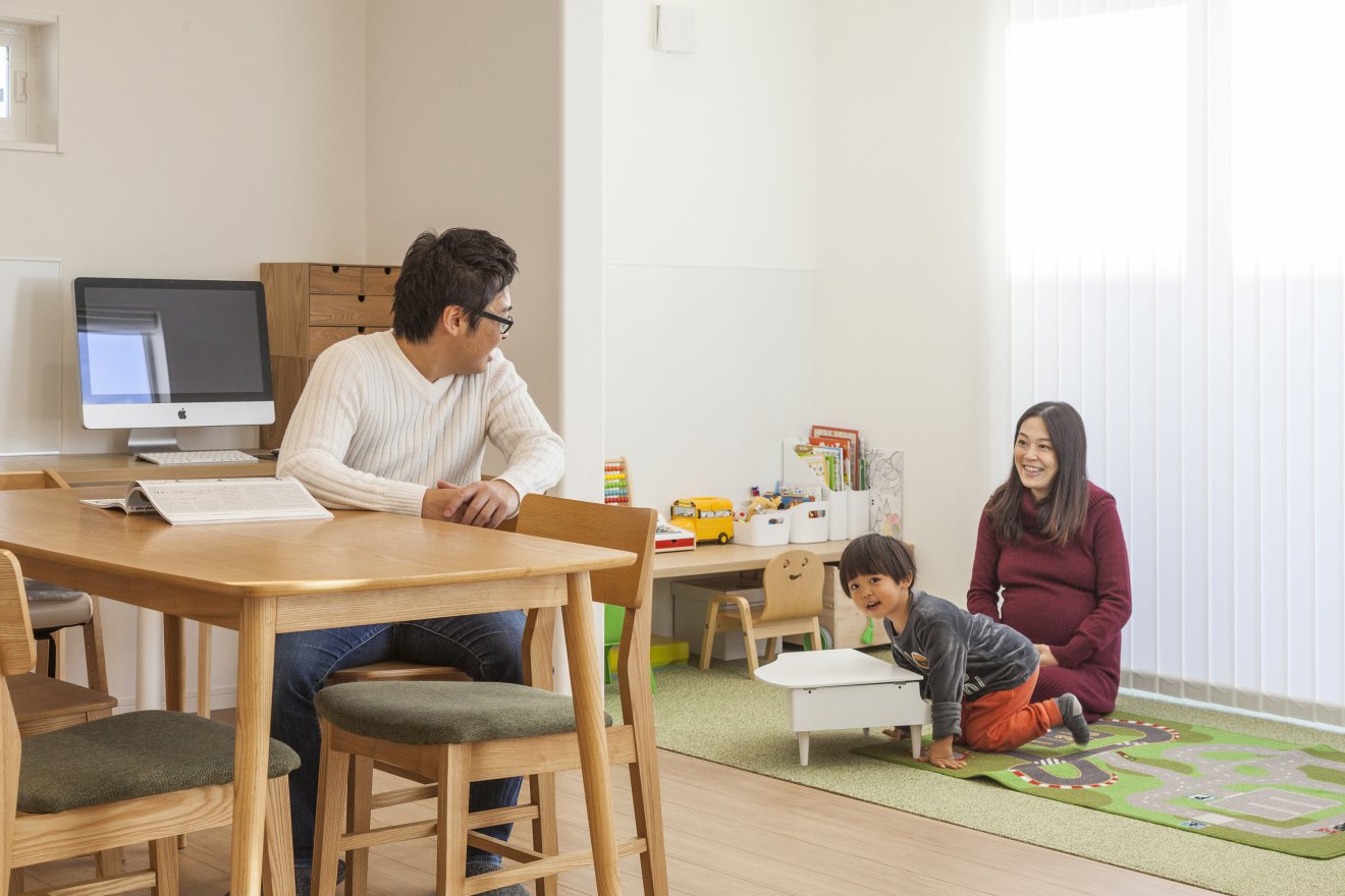 外観は白色を基調としてシンプルにまとめました。キッチンからリビング・ダイニング、和室、庭を見渡すことができる間取りは奥様目線を意識しています。スキップフロアの段差を活かして、秘密基地のような子供部屋や隠れ家風の書斎、奥様専用のロフトなど、家族それぞれに個のスペースを実現。楽しく遊び心あふれる住まいとなりました。2階ホールにはカウンターを設置して家族の寛ぎコーナーに。バルコニーの雰囲気を感じながら、家族で読書をしたり語らったりと、ちょっと一息入れたい時に活躍します。