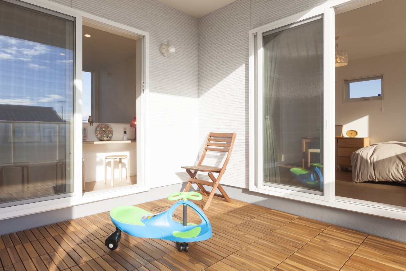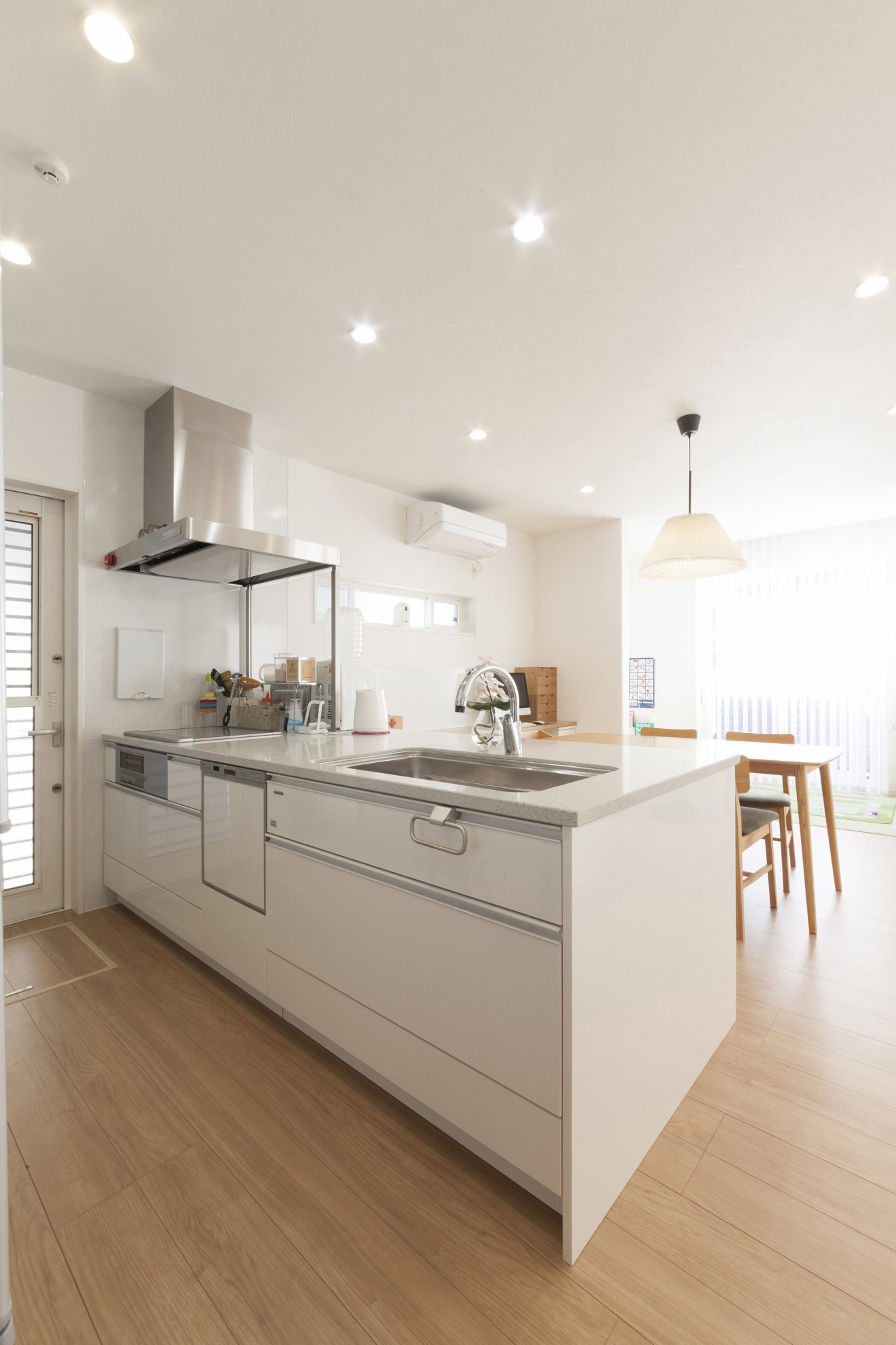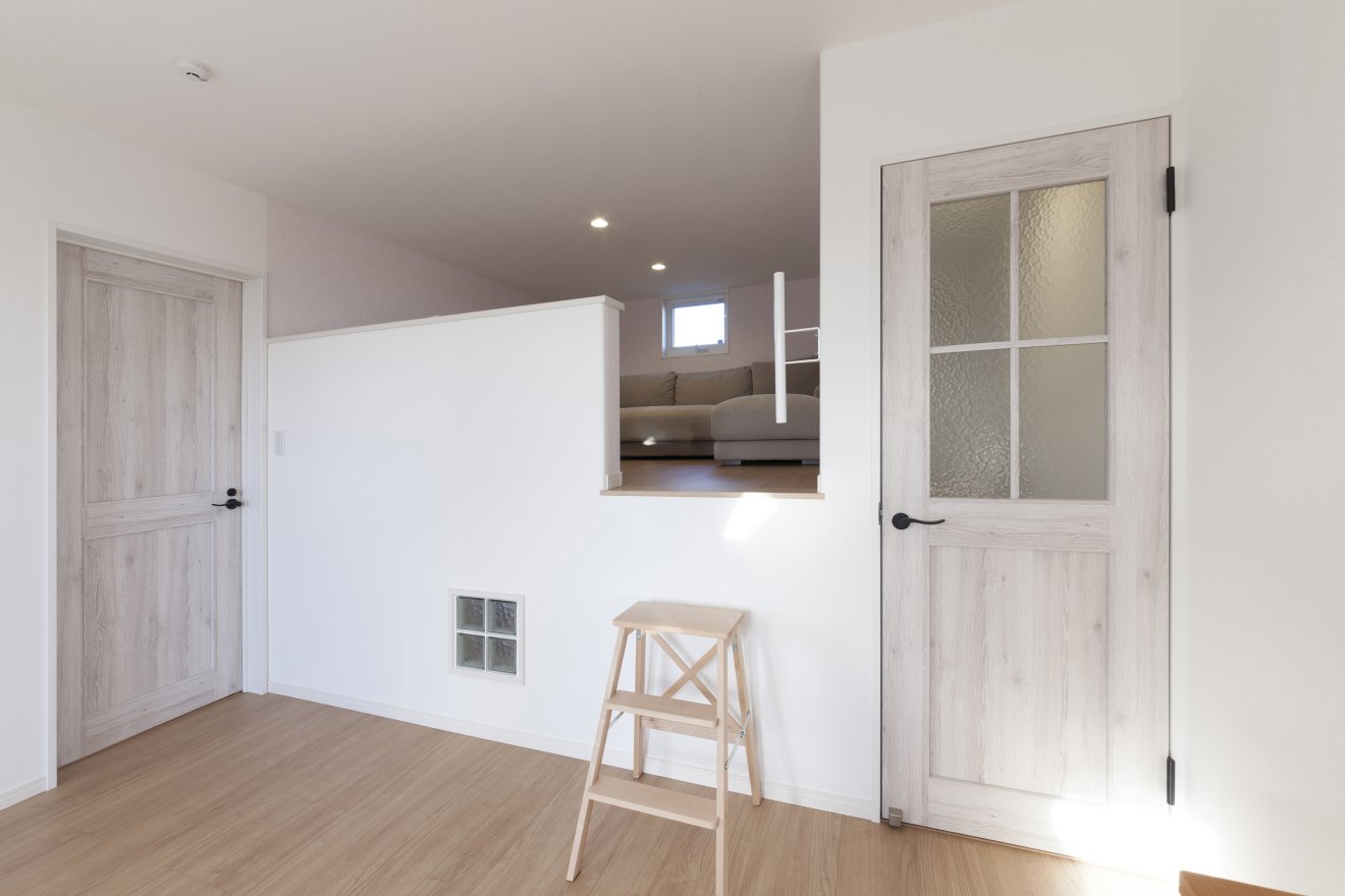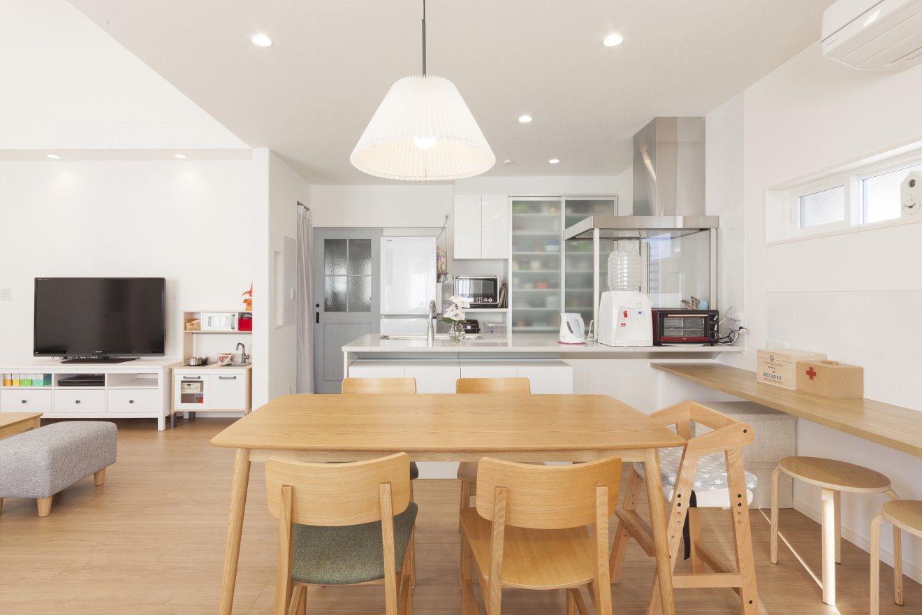 外観は白色を基調としてシンプルにまとめました。キッチンからリビング・ダイニング、和室、庭を見渡すことができる間取りは奥様目線を意識しています。スキップフロアの段差を活かして、秘密基地のような子供部屋や隠れ家風の書斎、奥様専用のロフトなど、家族それぞれに個のスペースを実現。楽しく遊び心あふれる住まいとなりました。2階ホールにはカウンターを設置して家族の寛ぎコーナーに。バルコニーの雰囲気を感じながら、家族で読書をしたり語らったりと、ちょっと一息入れたい時に活躍します。