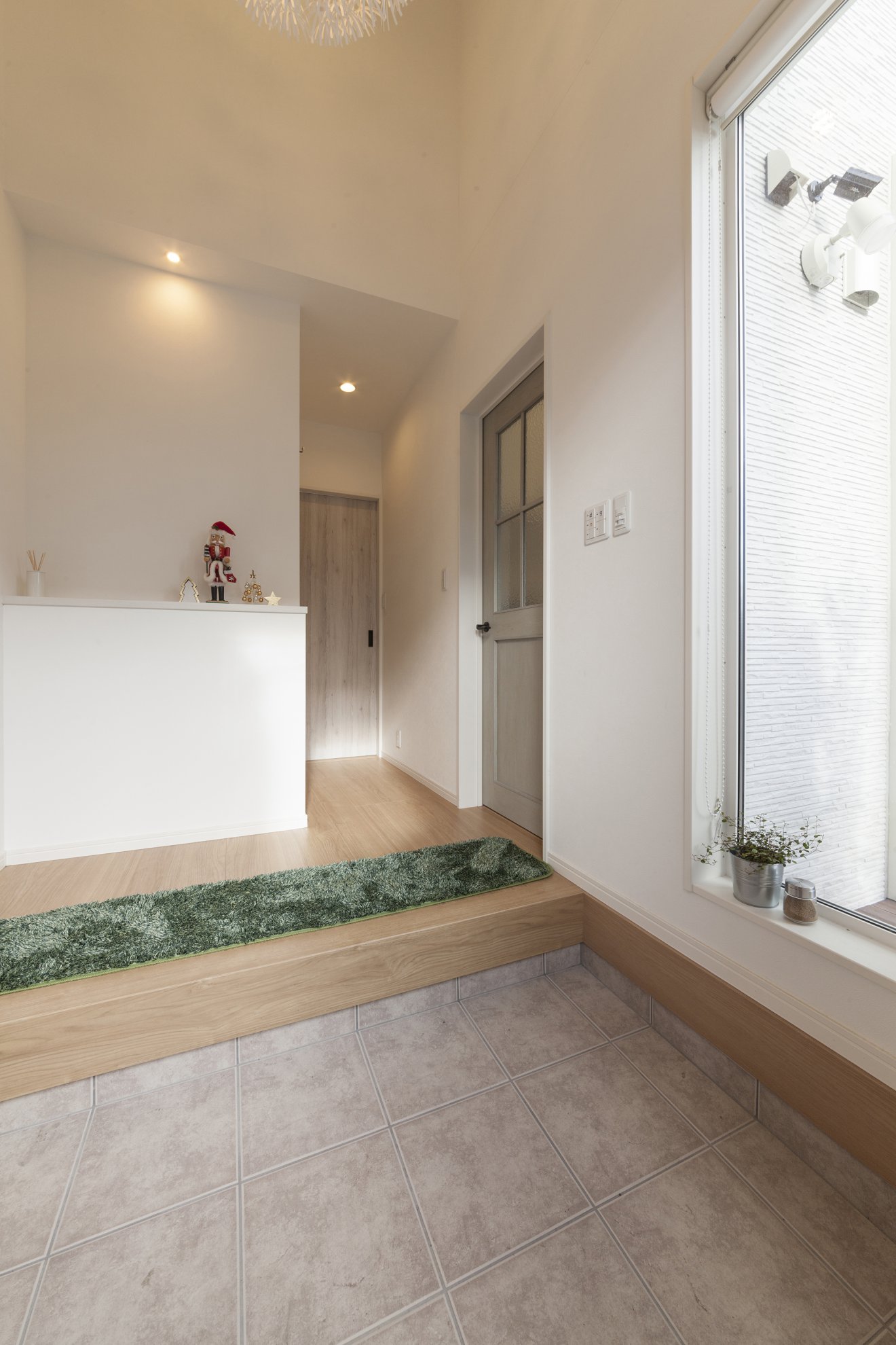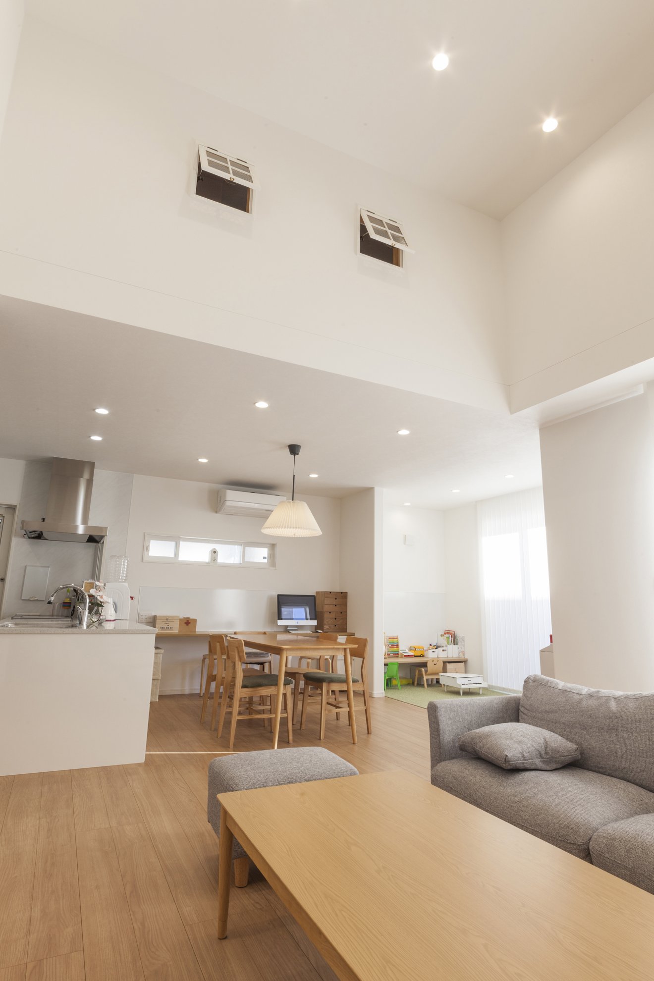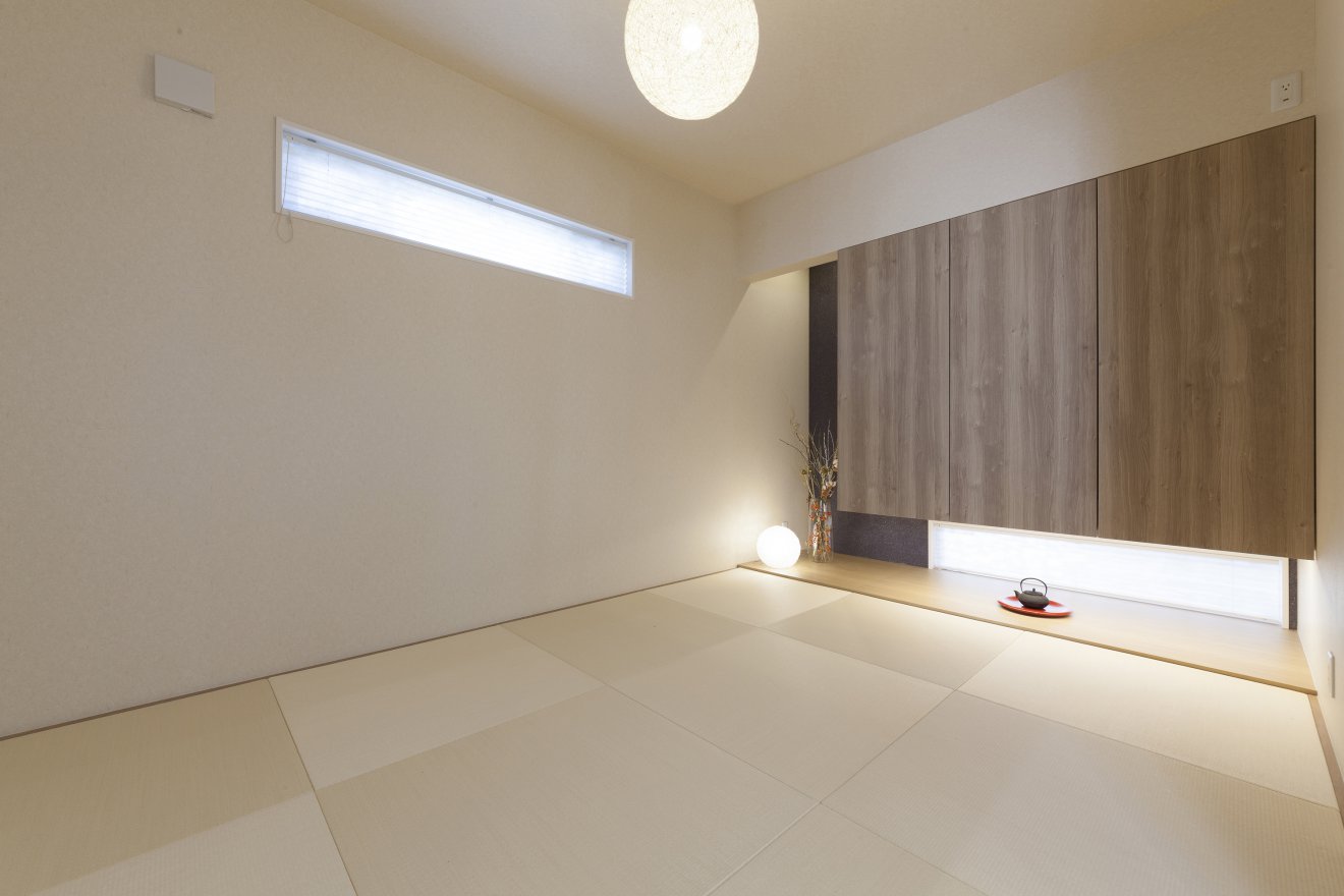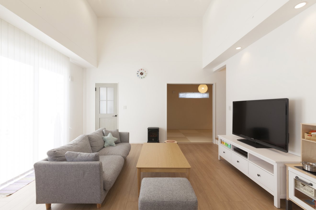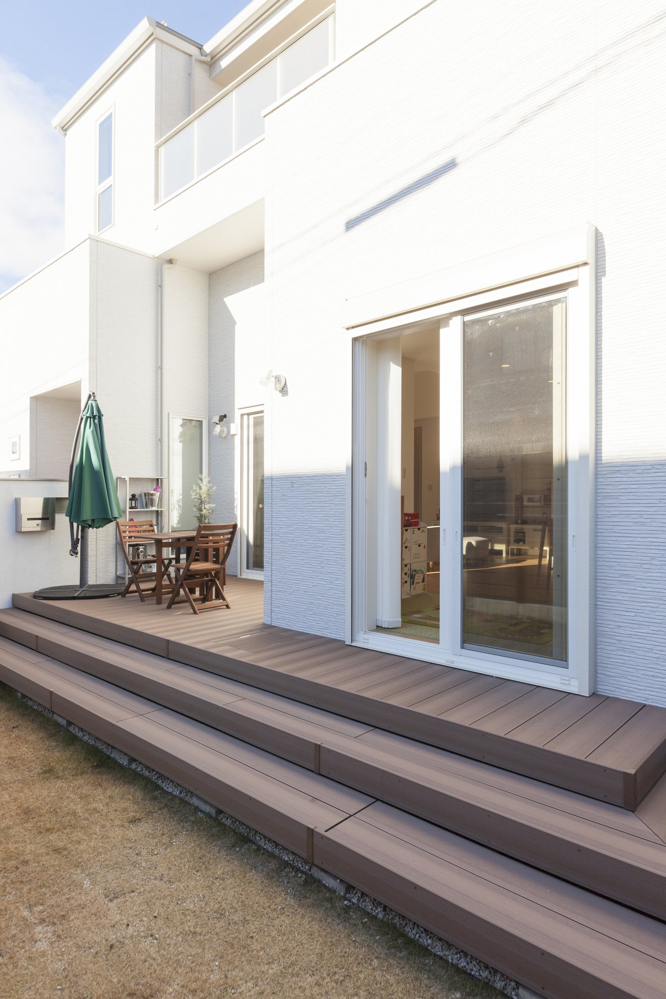 外観は白色を基調としてシンプルにまとめました。キッチンからリビング・ダイニング、和室、庭を見渡すことができる間取りは奥様目線を意識しています。スキップフロアの段差を活かして、秘密基地のような子供部屋や隠れ家風の書斎、奥様専用のロフトなど、家族それぞれに個のスペースを実現。楽しく遊び心あふれる住まいとなりました。2階ホールにはカウンターを設置して家族の寛ぎコーナーに。バルコニーの雰囲気を感じながら、家族で読書をしたり語らったりと、ちょっと一息入れたい時に活躍します。
