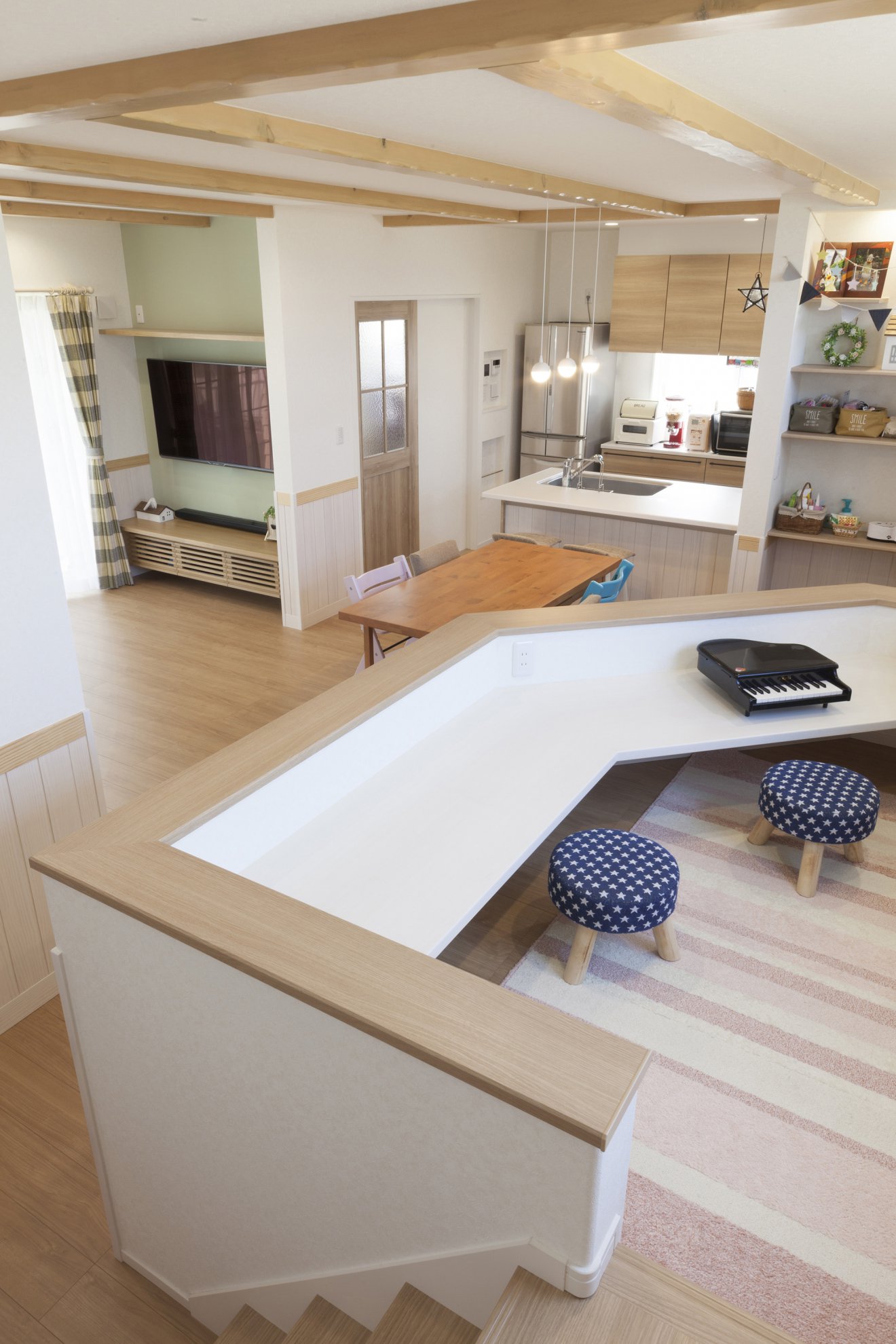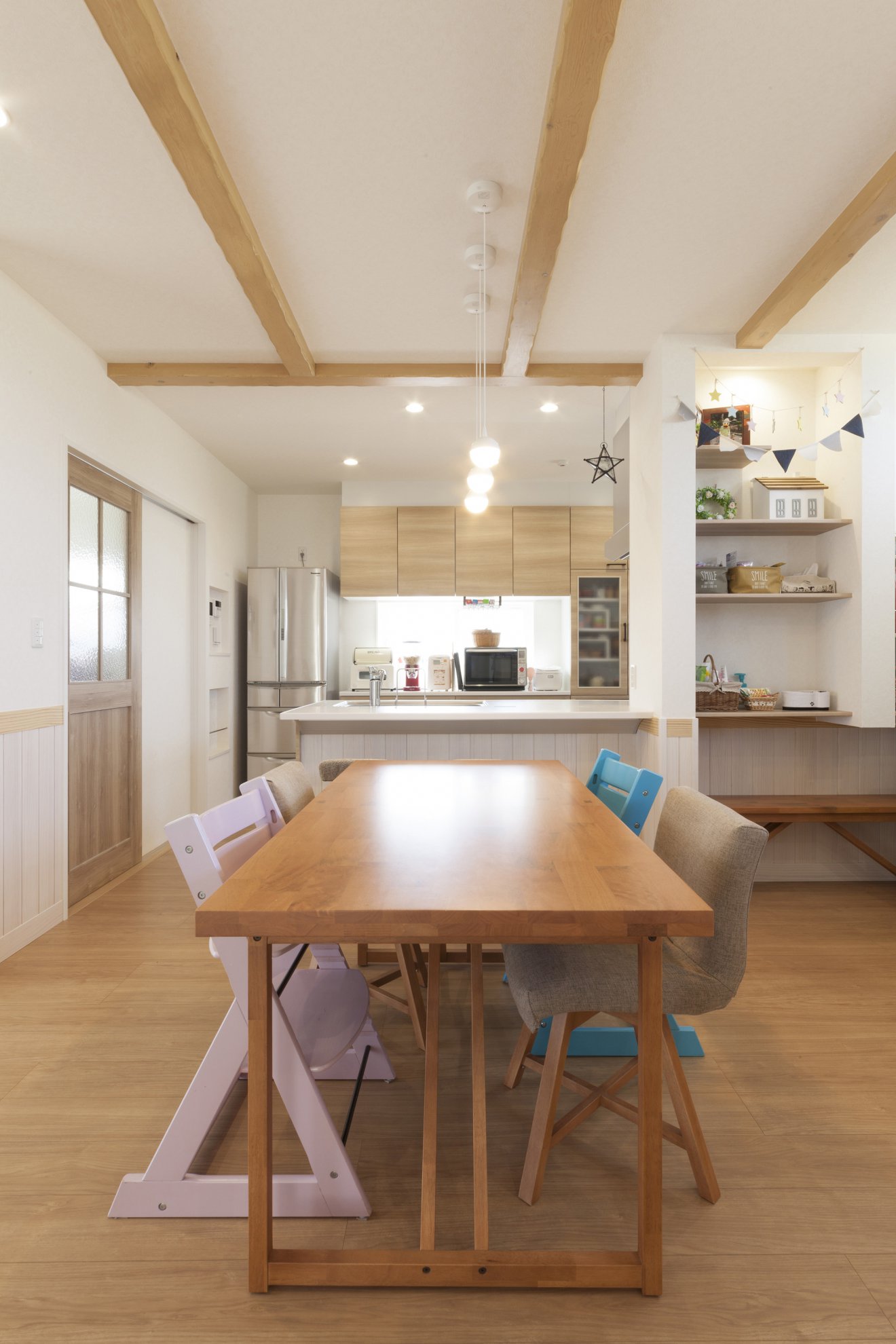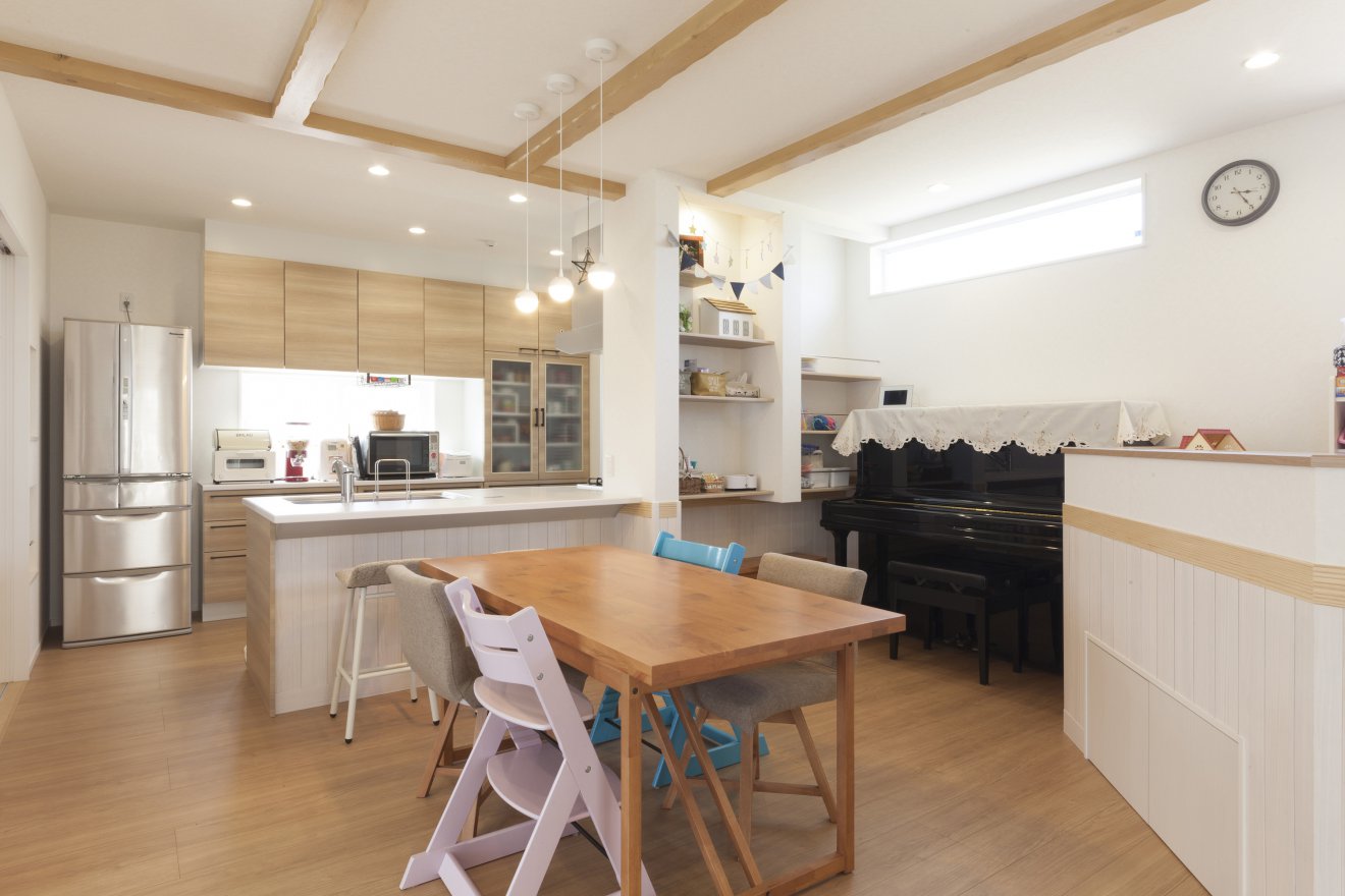 白い壁と赤い屋根が印象的なカントリースタイルの住まい。室内は無垢の羽目板と化粧梁を使用してナチュラルな雰囲気を演出しました。リビング階段の途中に設けたスキップフロアは、LDK全体を見渡せる家族のコミュニケーションスペースです。
