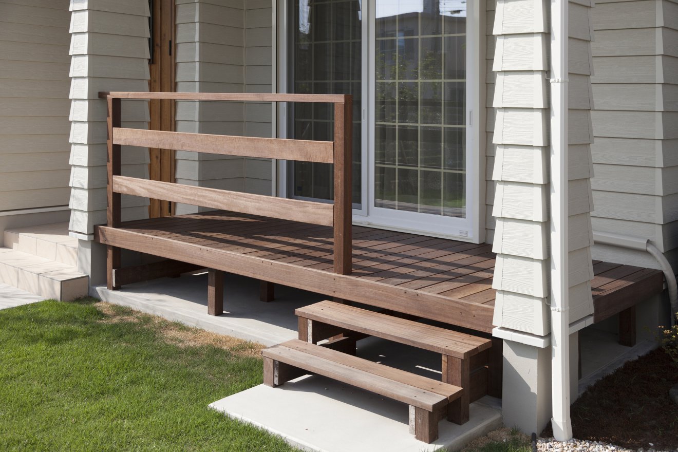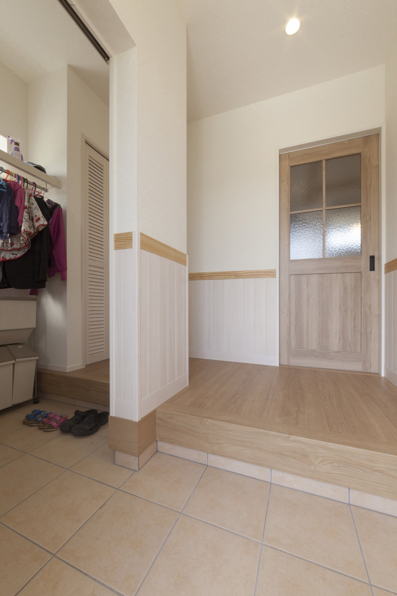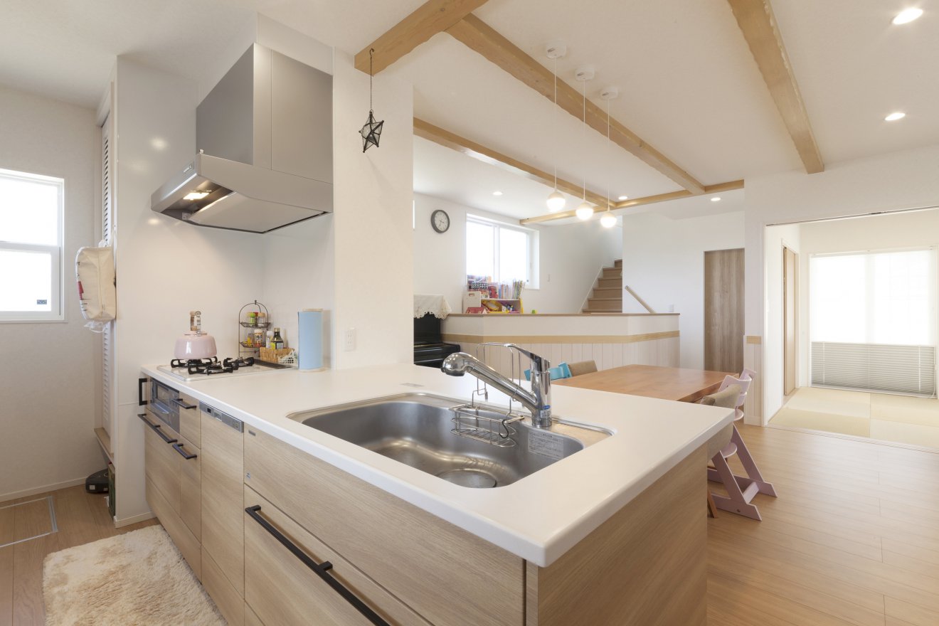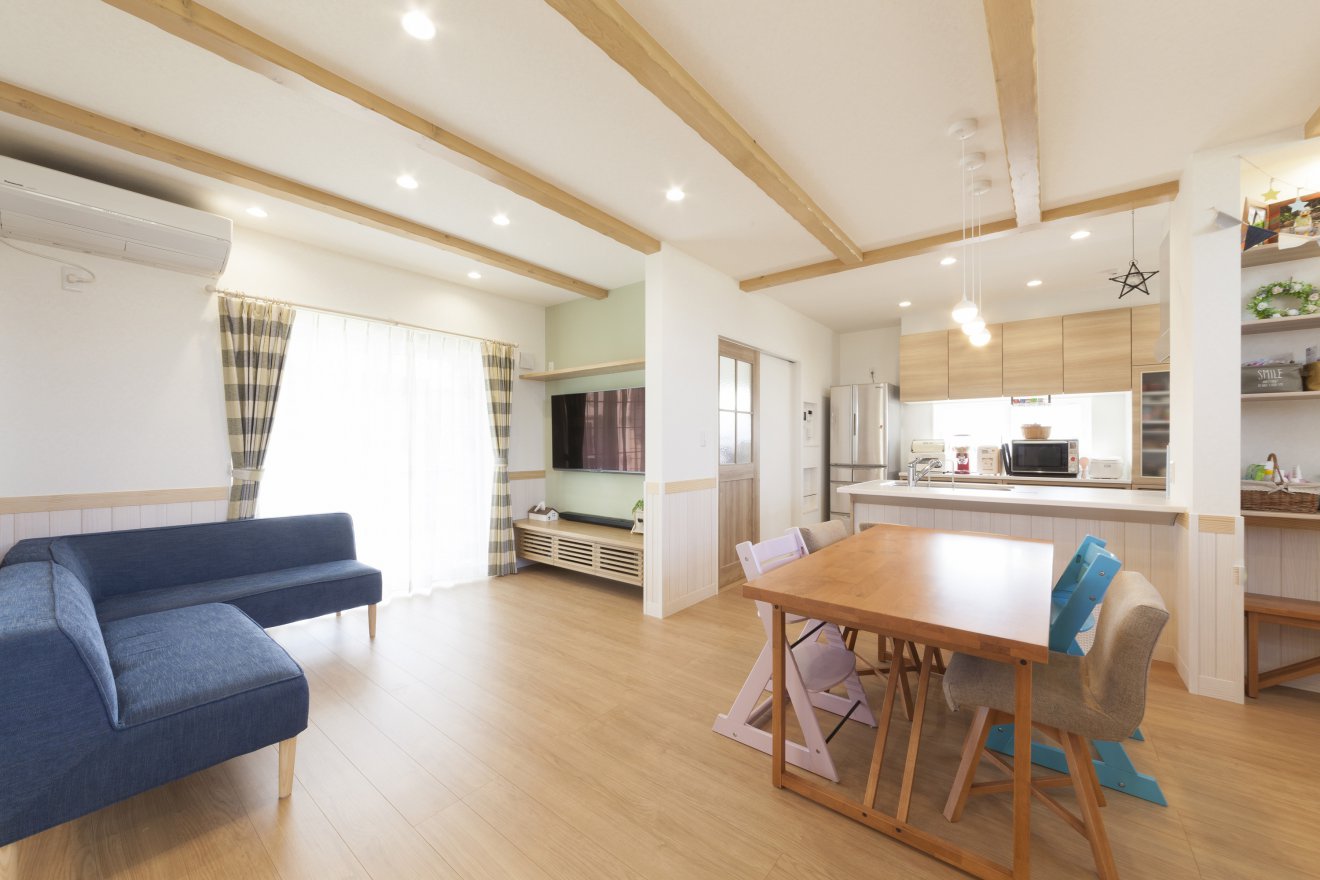 白い壁と赤い屋根が印象的なカントリースタイルの住まい。室内は無垢の羽目板と化粧梁を使用してナチュラルな雰囲気を演出しました。リビング階段の途中に設けたスキップフロアは、LDK全体を見渡せる家族のコミュニケーションスペースです。
