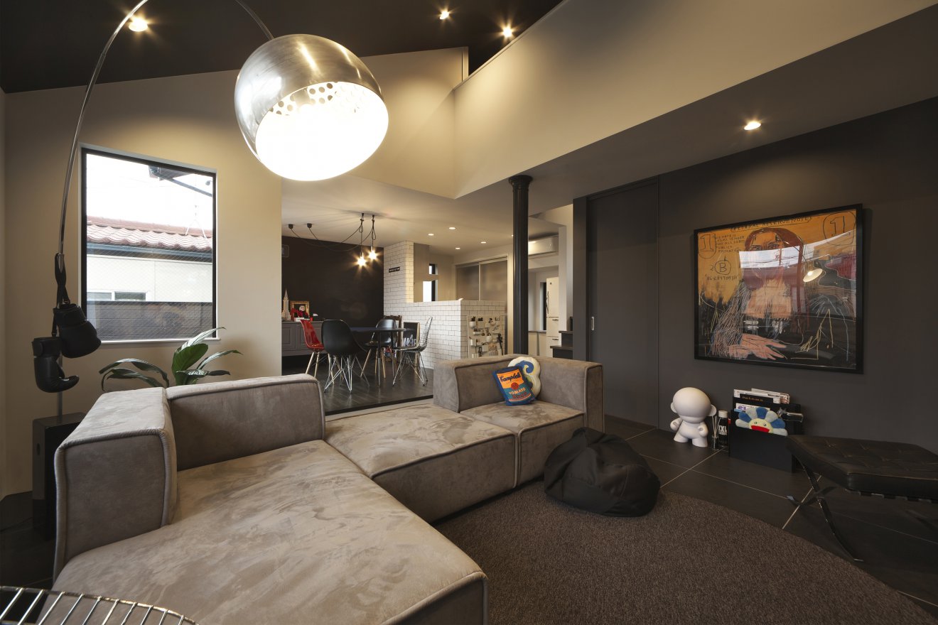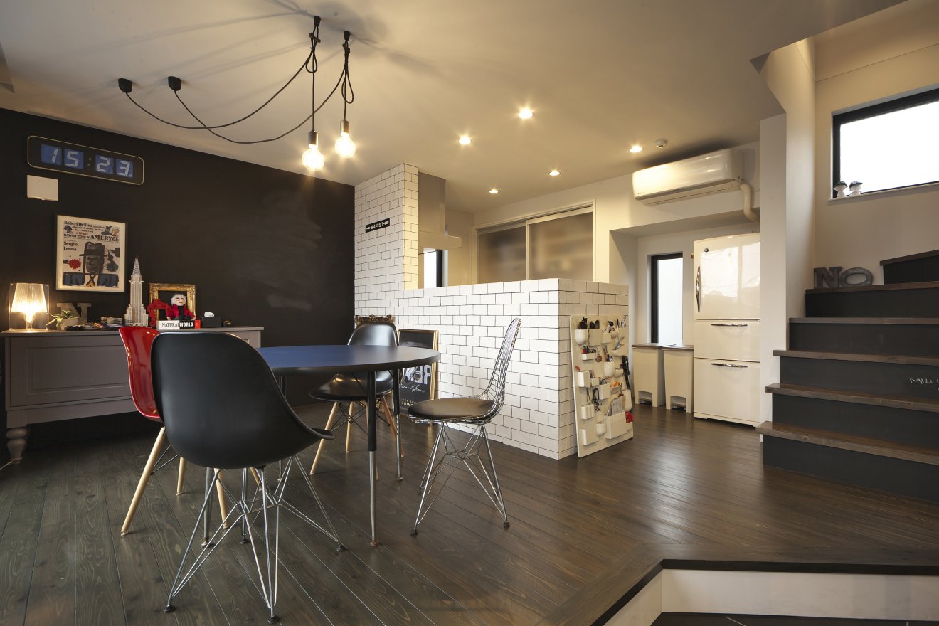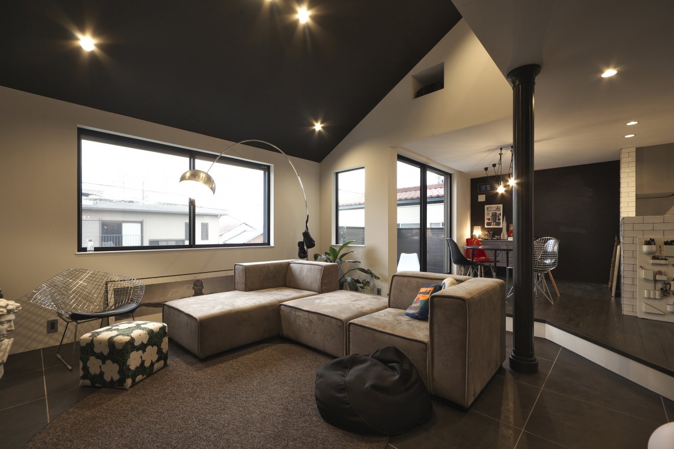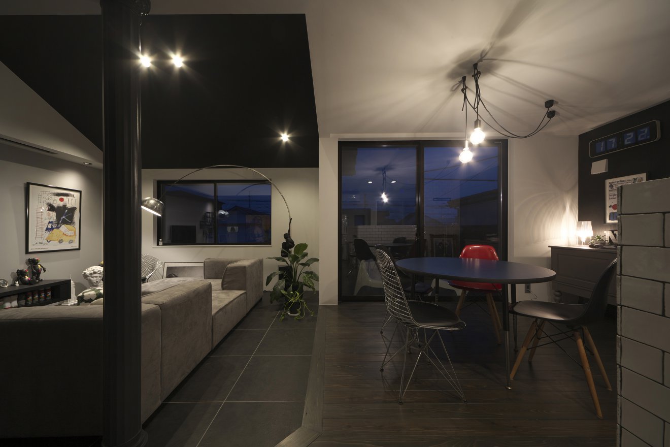 室内の壁面を塗装し、床やキッチンまわりをタイルで仕上げることで、質感にこだわったヴィンテージモダンを演出。電球色の照明が、壁とインテリアをより魅力的に見せ、かつ大人な雰囲気を醸し出しています。また、勾配天井で広がりをもたらしたリビングには、ギリシャ神殿の柱を思わせる装飾柱をポイントで使い、個性的な空間にまとめました。