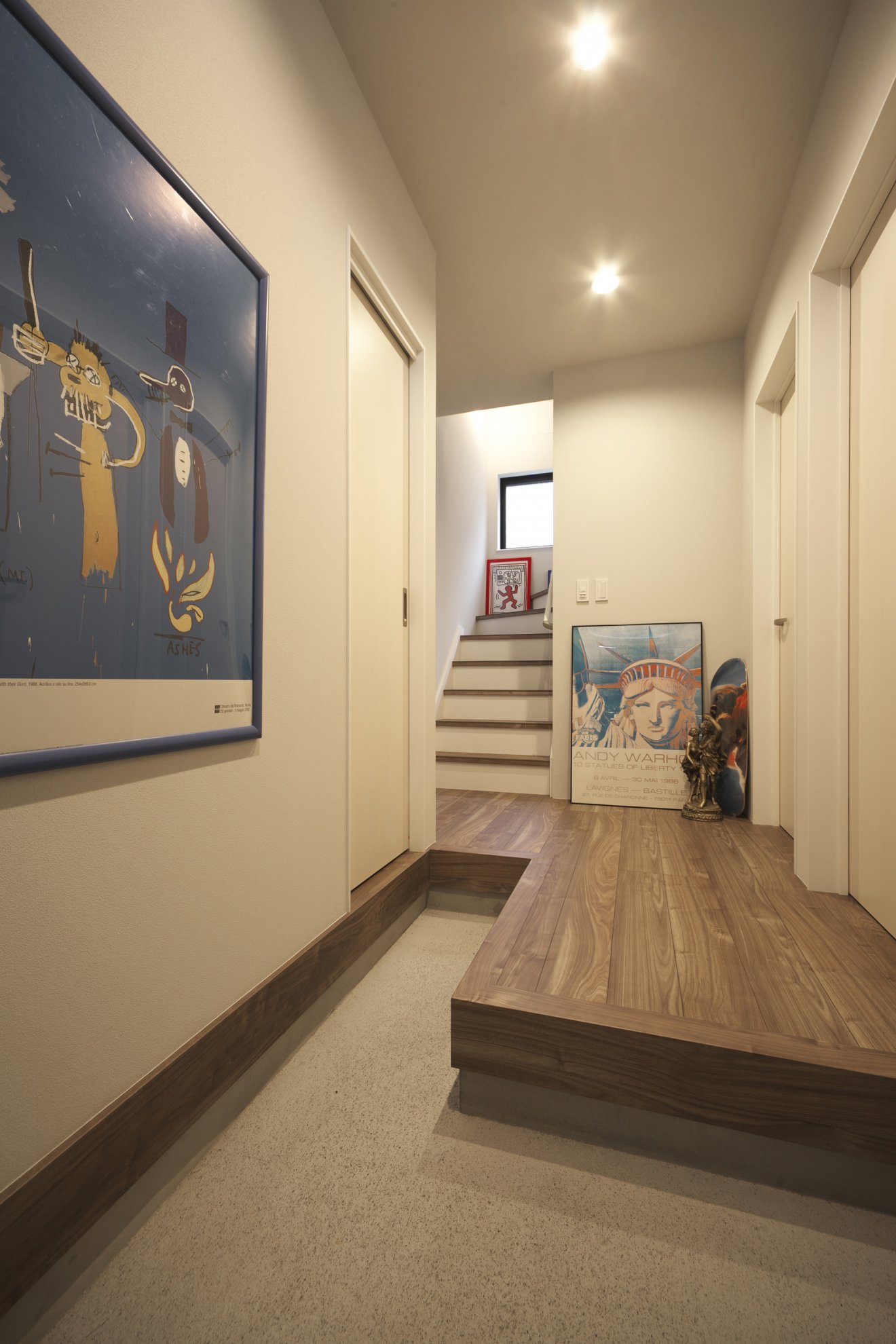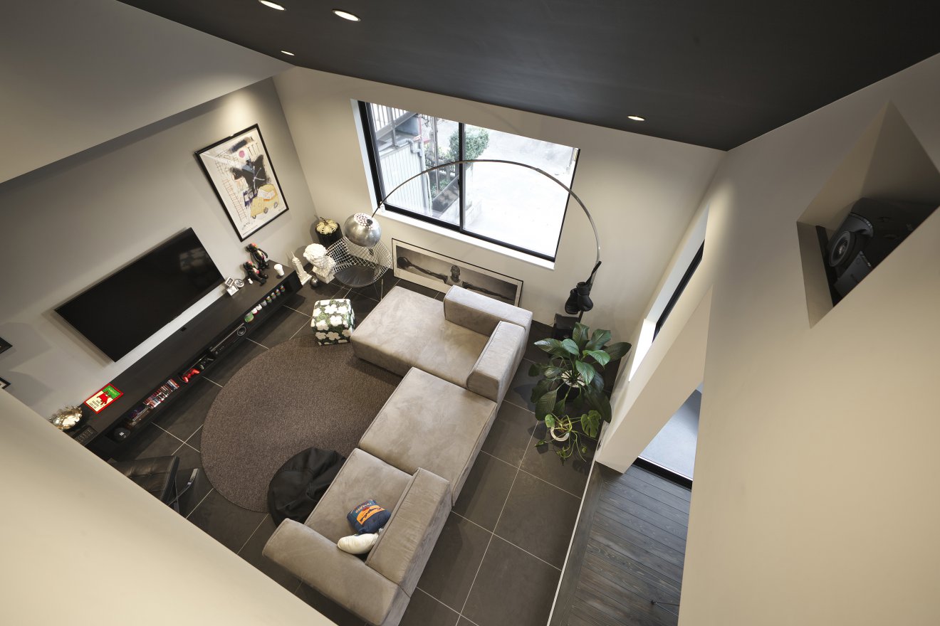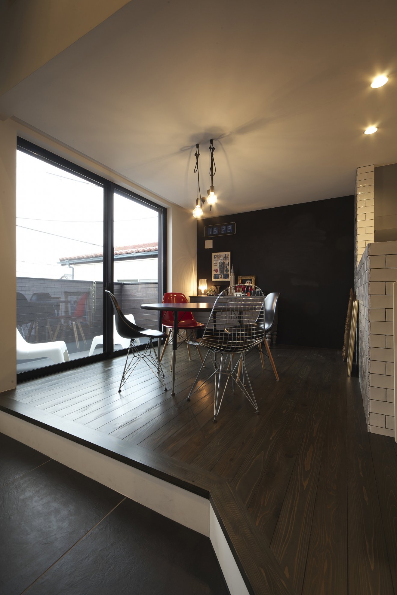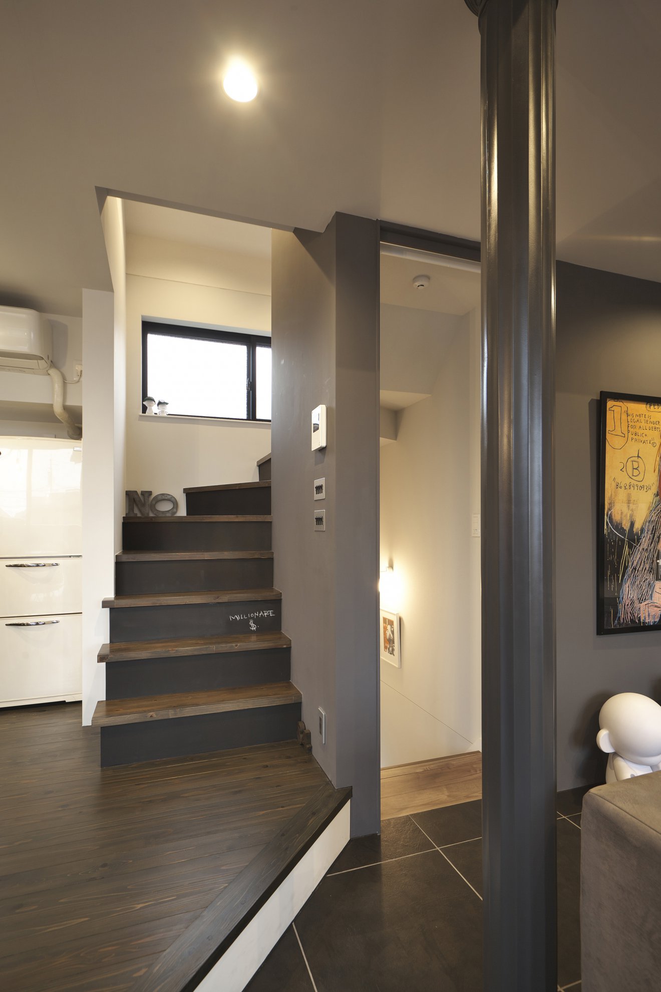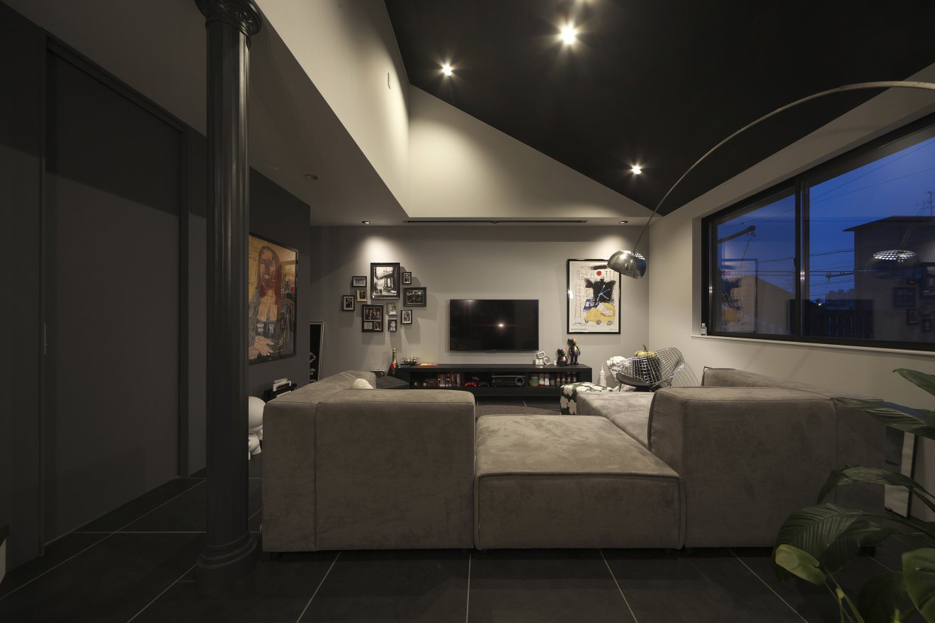 室内の壁面を塗装し、床やキッチンまわりをタイルで仕上げることで、質感にこだわったヴィンテージモダンを演出。電球色の照明が、壁とインテリアをより魅力的に見せ、かつ大人な雰囲気を醸し出しています。また、勾配天井で広がりをもたらしたリビングには、ギリシャ神殿の柱を思わせる装飾柱をポイントで使い、個性的な空間にまとめました。
