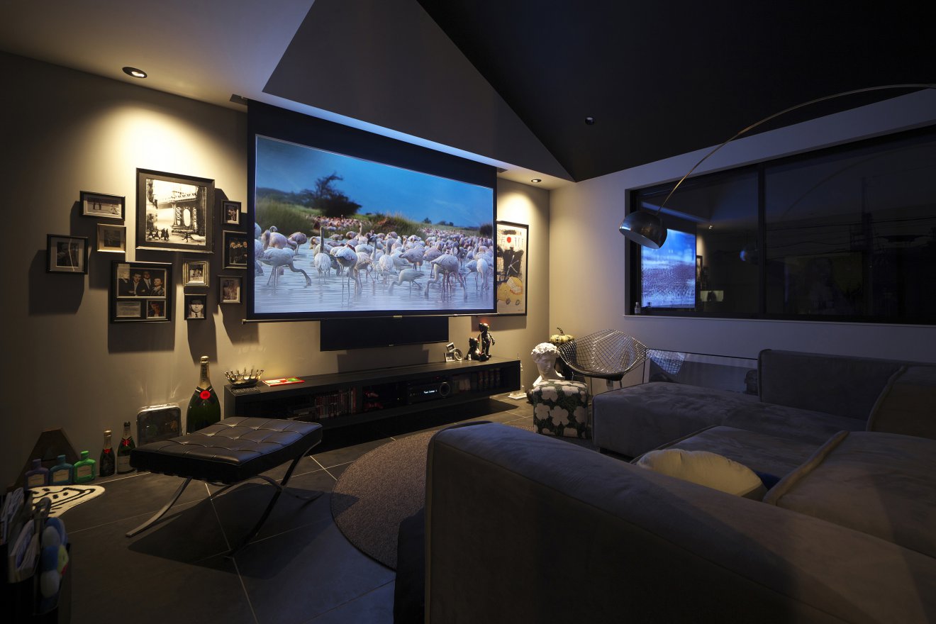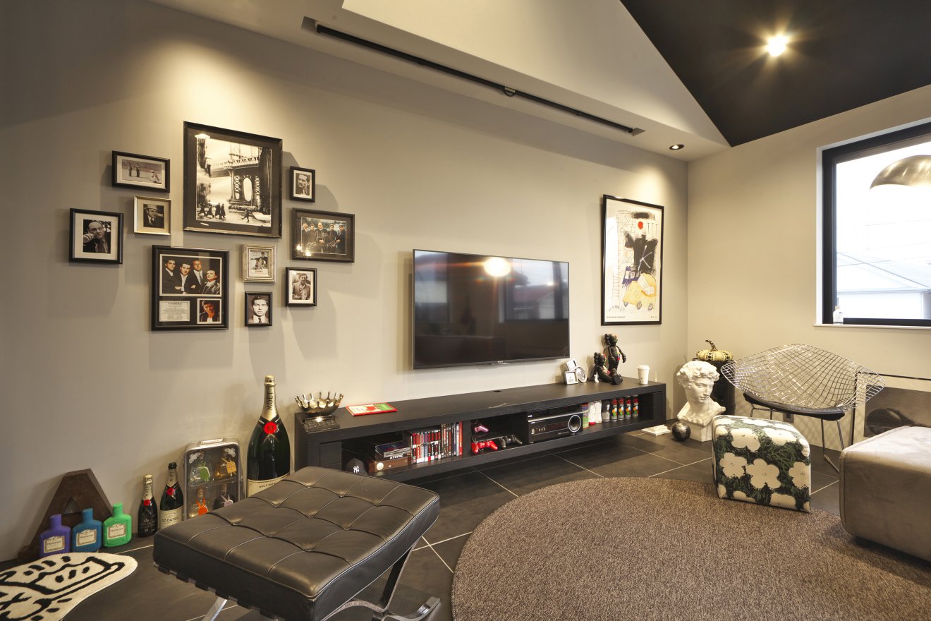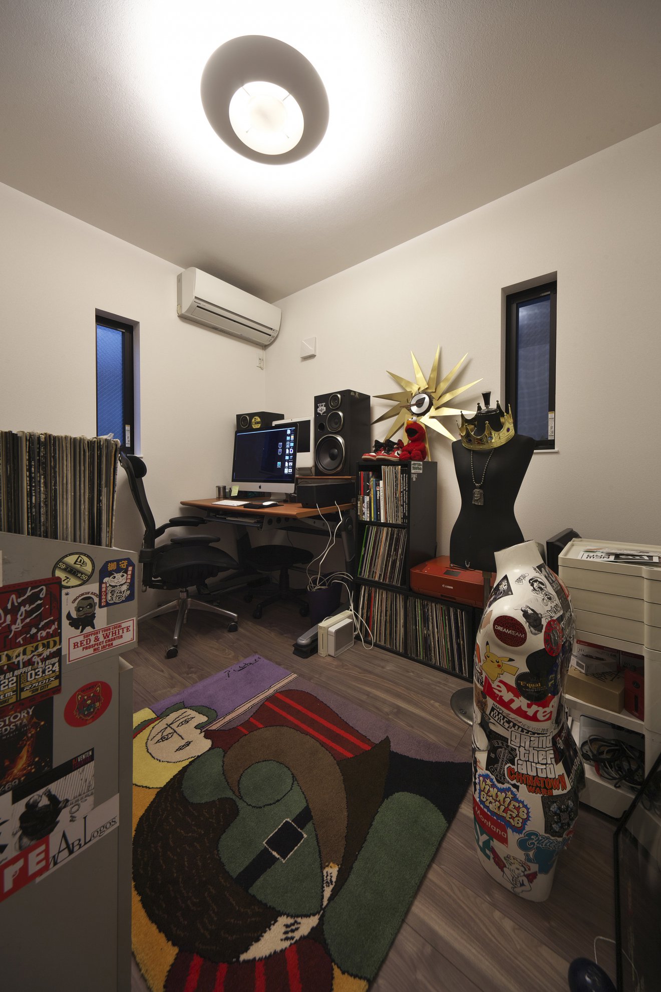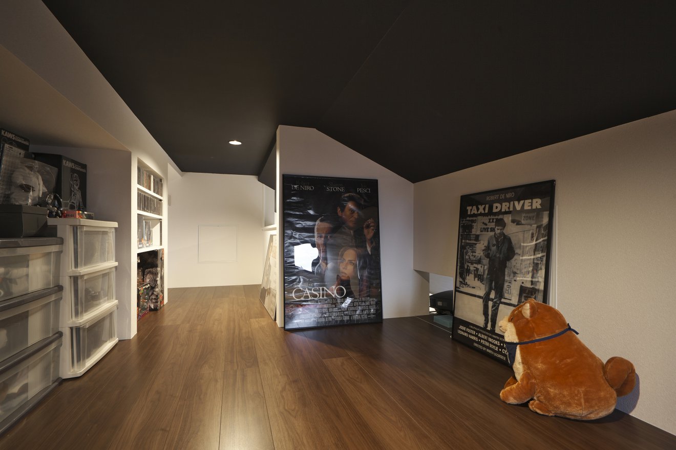 室内の壁面を塗装し、床やキッチンまわりをタイルで仕上げることで、質感にこだわったヴィンテージモダンを演出。電球色の照明が、壁とインテリアをより魅力的に見せ、かつ大人な雰囲気を醸し出しています。また、勾配天井で広がりをもたらしたリビングには、ギリシャ神殿の柱を思わせる装飾柱をポイントで使い、個性的な空間にまとめました。