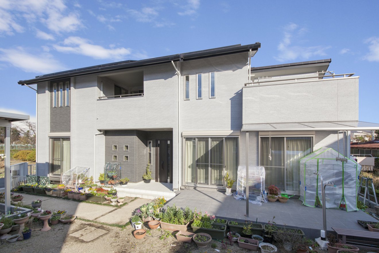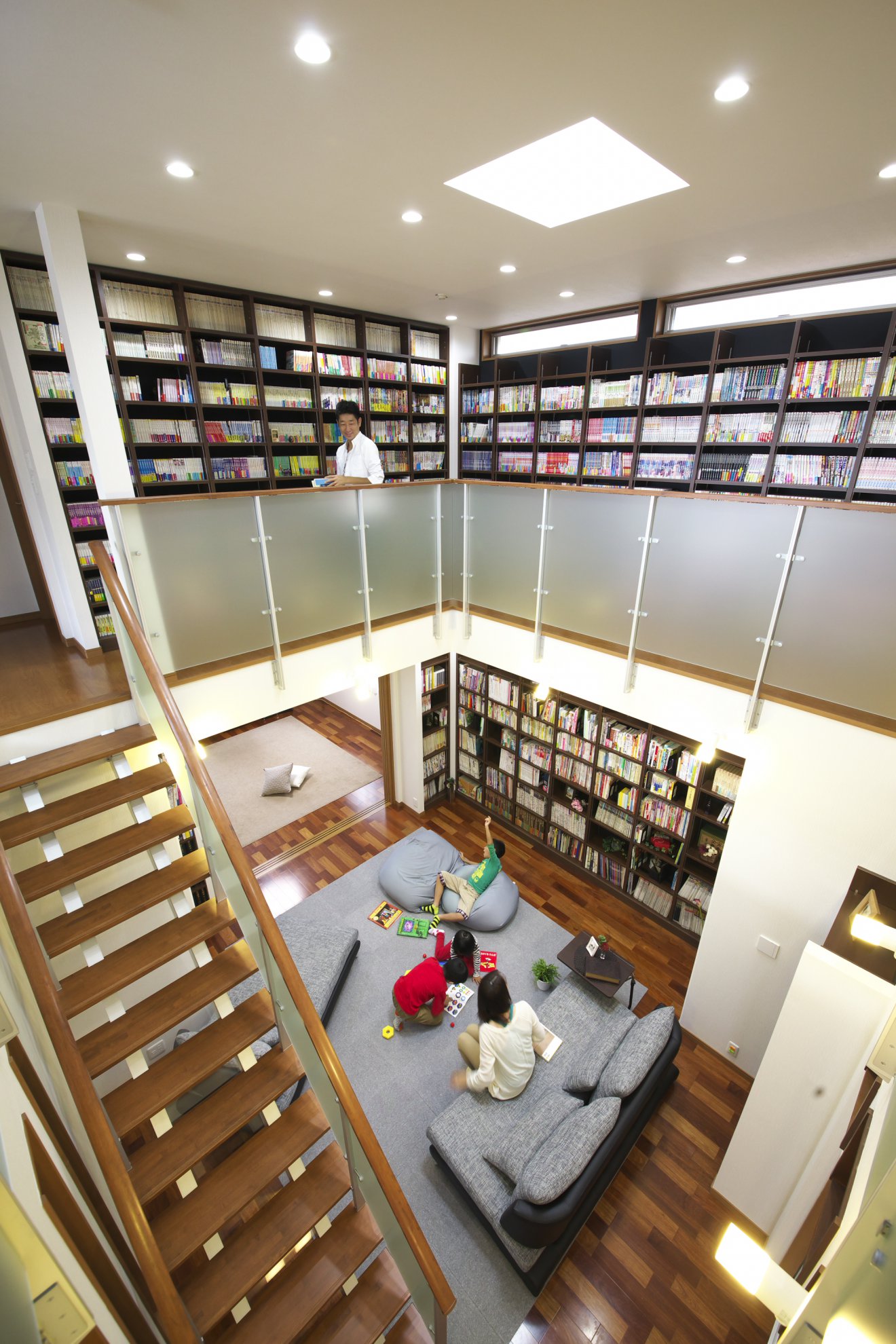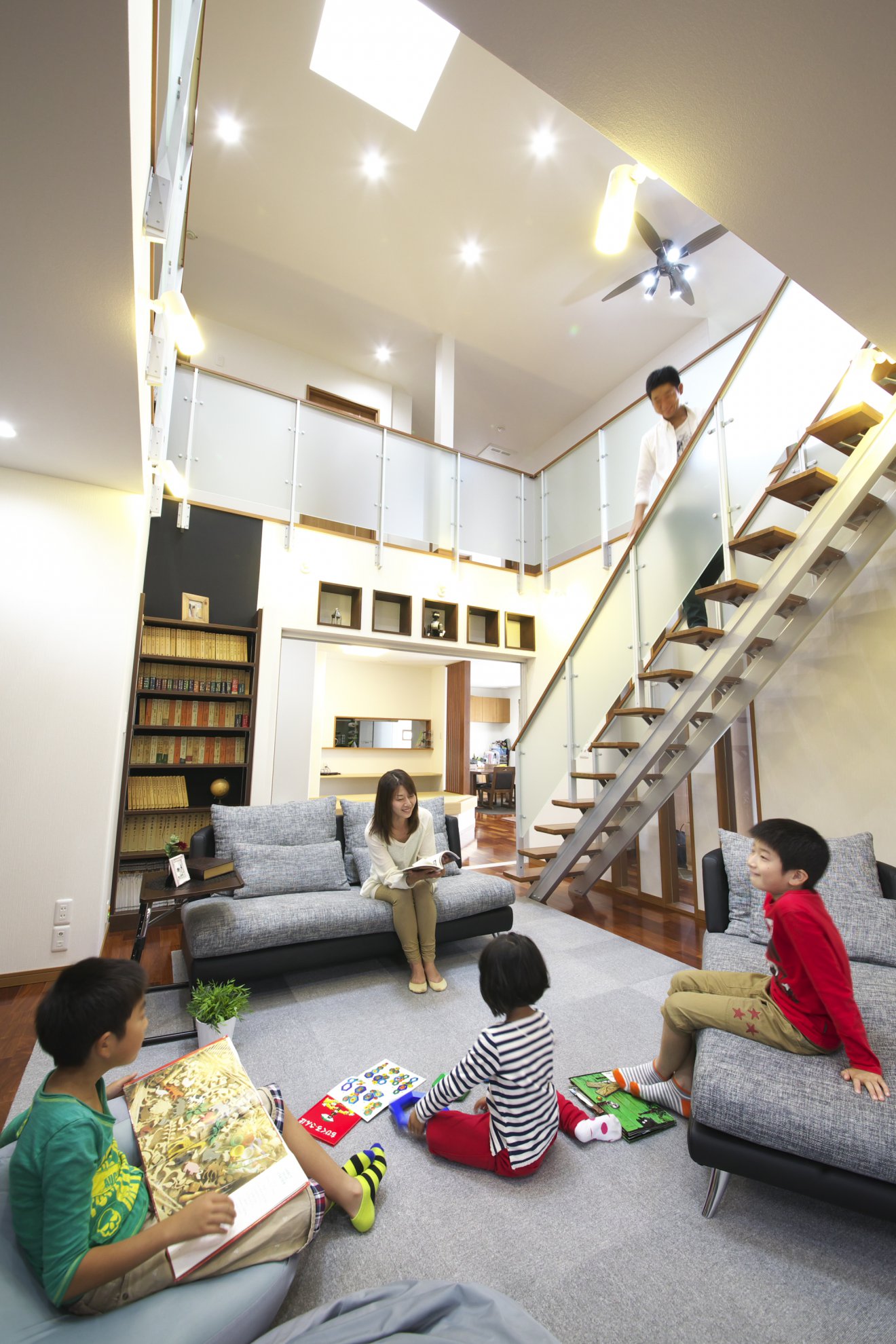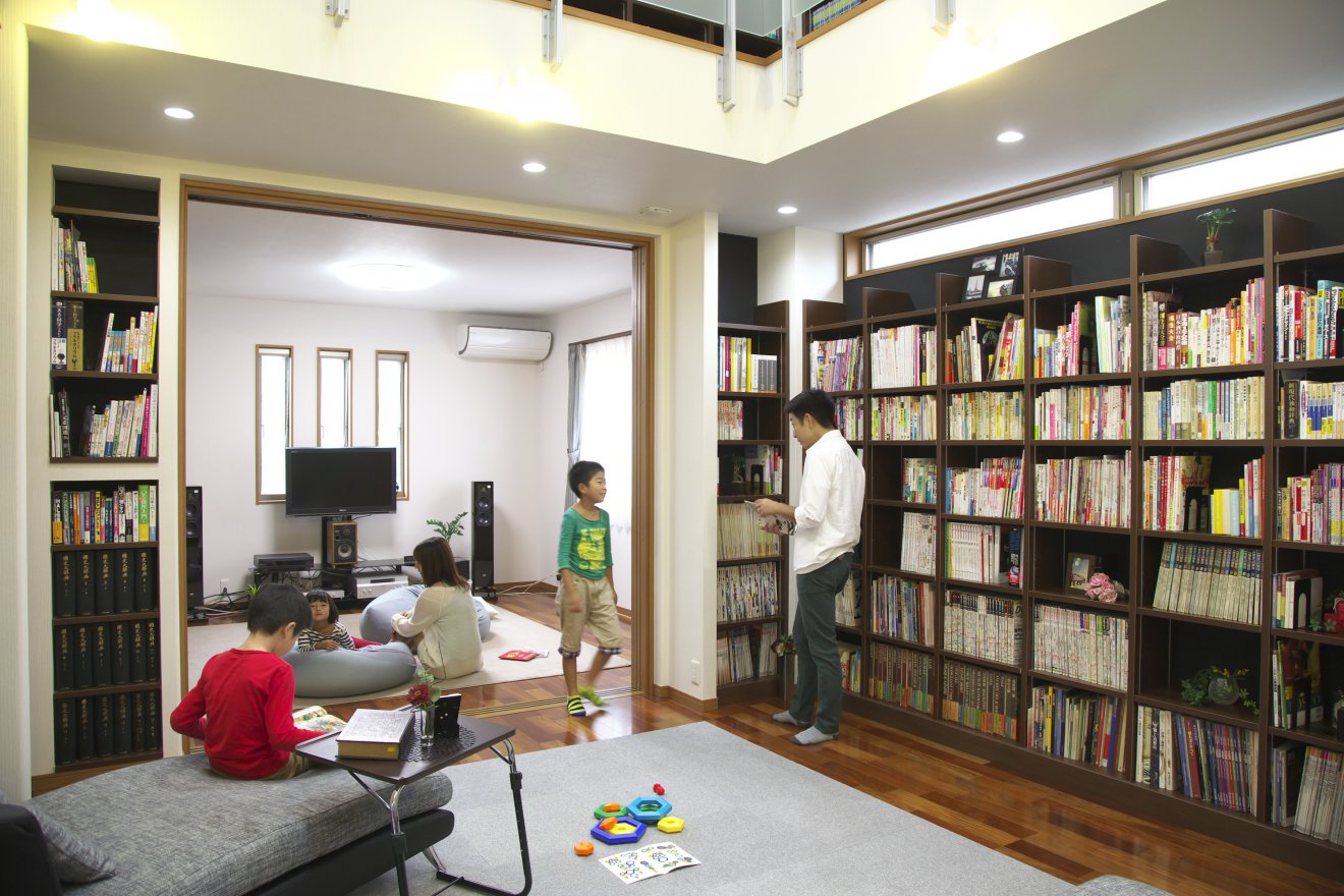 リビングを吹き抜けにし、1・2階に壁面いっぱいの書棚を設けました。見渡す限り大好きな本が並ぶ、まるで壮大な書庫のような空間が広がります。昼は高窓からの光で明るく開放的に、夜はライトアップで全く異なる雰囲気になる様に計画しました。