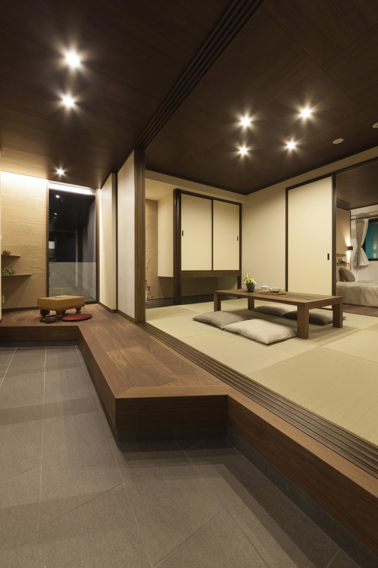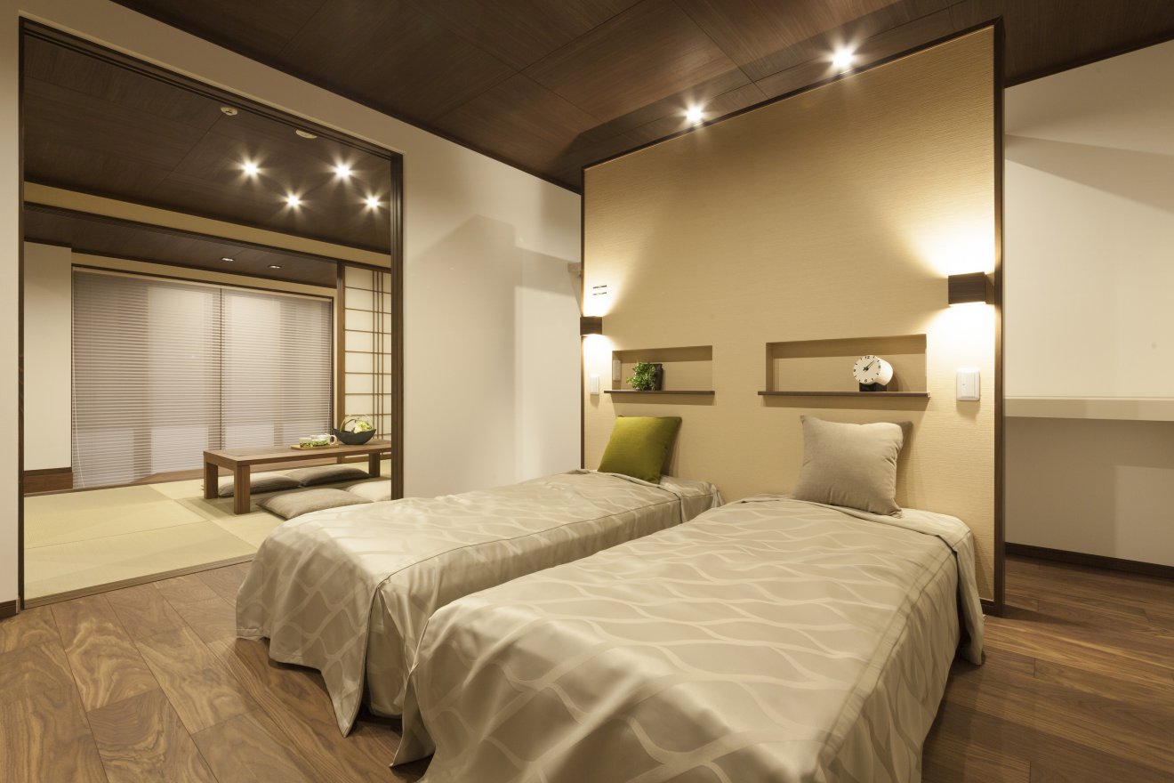 【夜景・土間】和室の土間スペースと縁側は夕涼みに最適です。薄明かりの中でその向こうの人や風景を魅力的に映し出します。 【夜景・主寝室】和室からつながる親世帯の寝室は引き戸を開けば開放的になります。ベッドの奥がオープンタイプのウォークインクロゼットです。