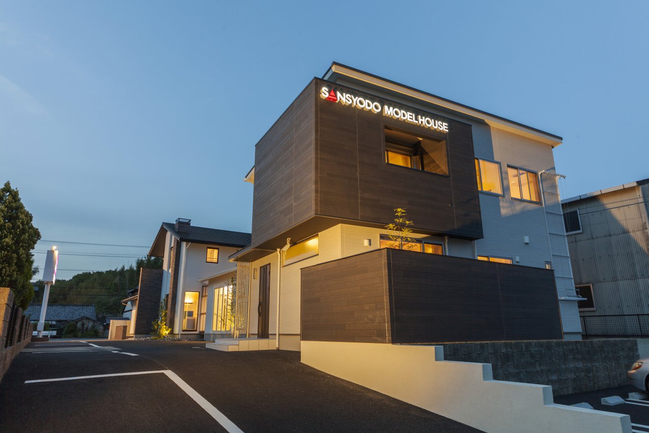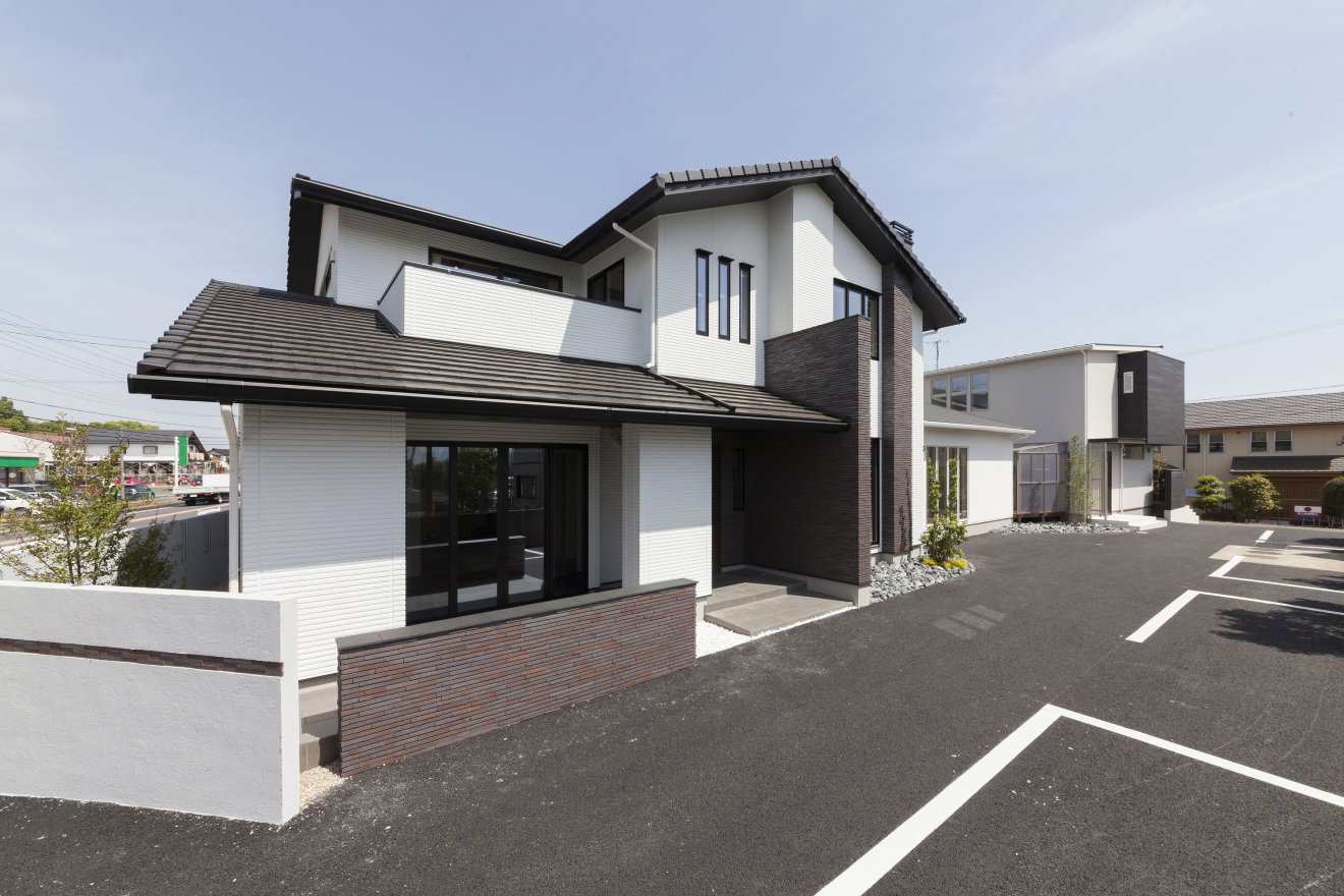 【外観】白を基調にした和モダンデザインの『二世帯の家』は、1階に親世帯、2階に子世帯を想定して、時代に合った二世帯住宅のあり方を提案をしています。