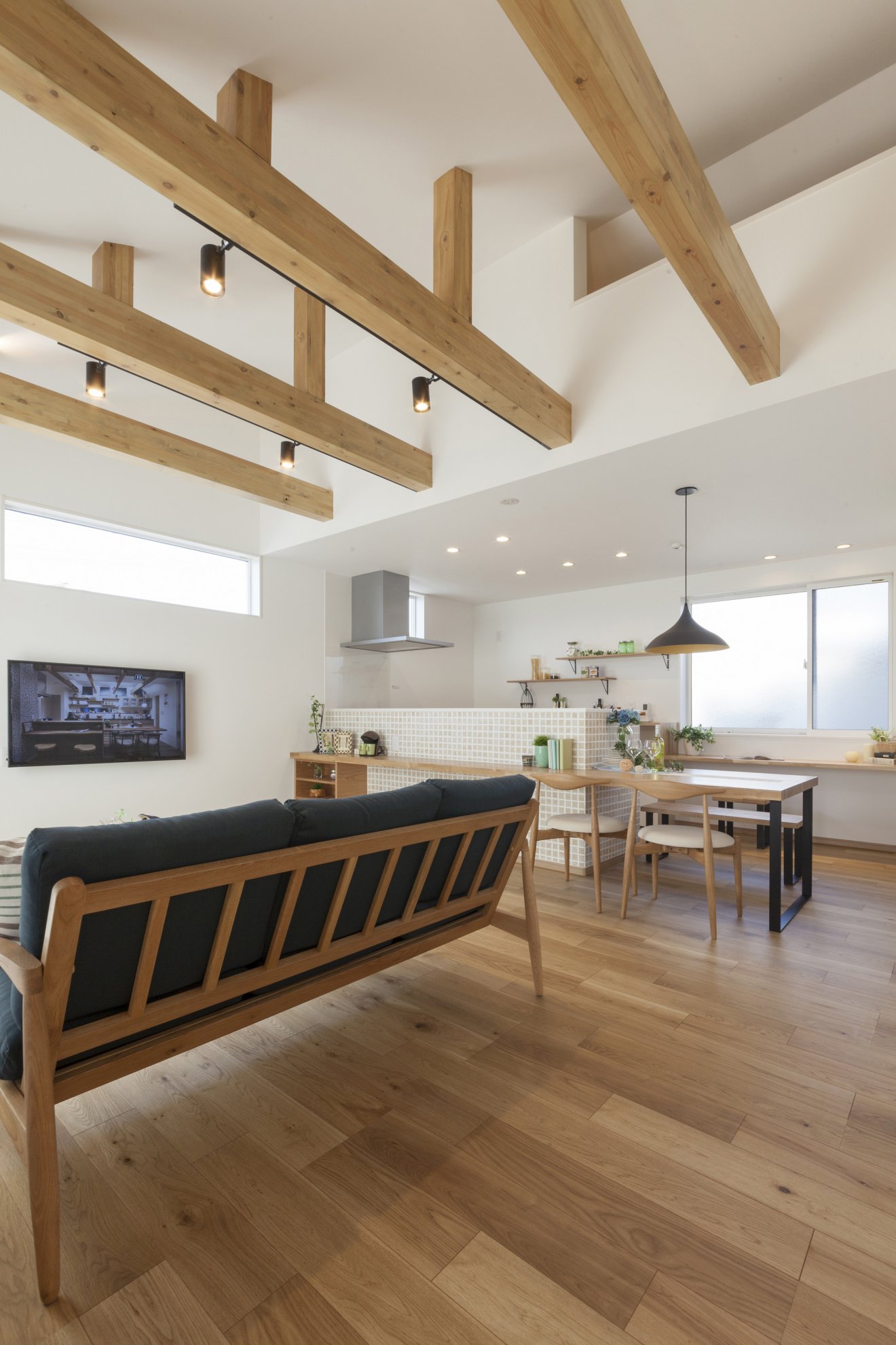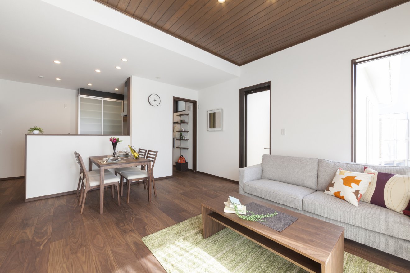 【リビング】親世帯のLDKは、世代を超えて愛される重厚感のあるウォールナット色の内装で仕上げている 【LDK】折り上げ天井の羽目板も塗装を施して、落ち着きあるシックな空間になりました。