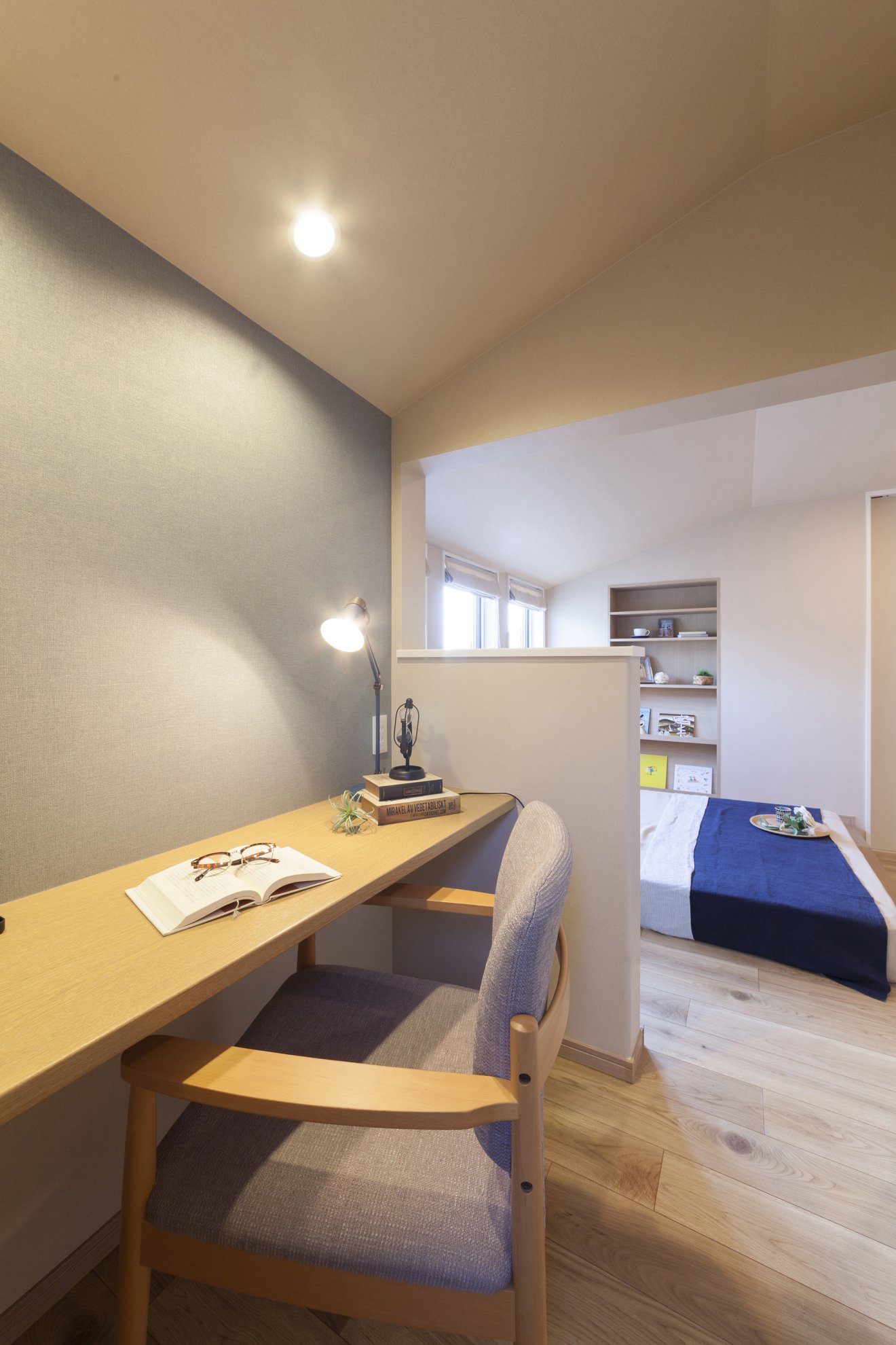 【主寝室】マットレスのみでOKというベッド不要の2階の寝室です。 【書斎】寝室の奥にある書斎は、天井を母屋下がりの勾配天井でこもり感が出て集中できる空間に仕上がりました。