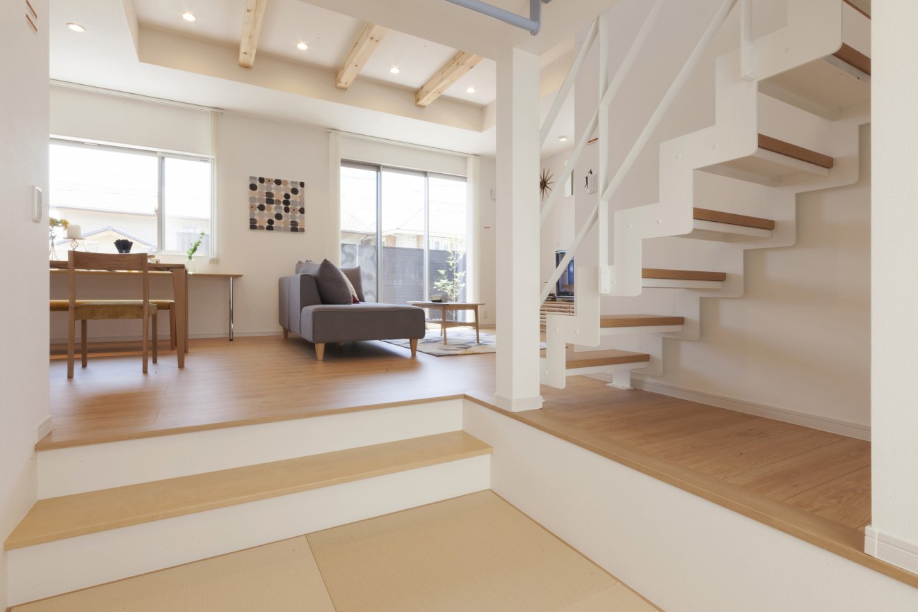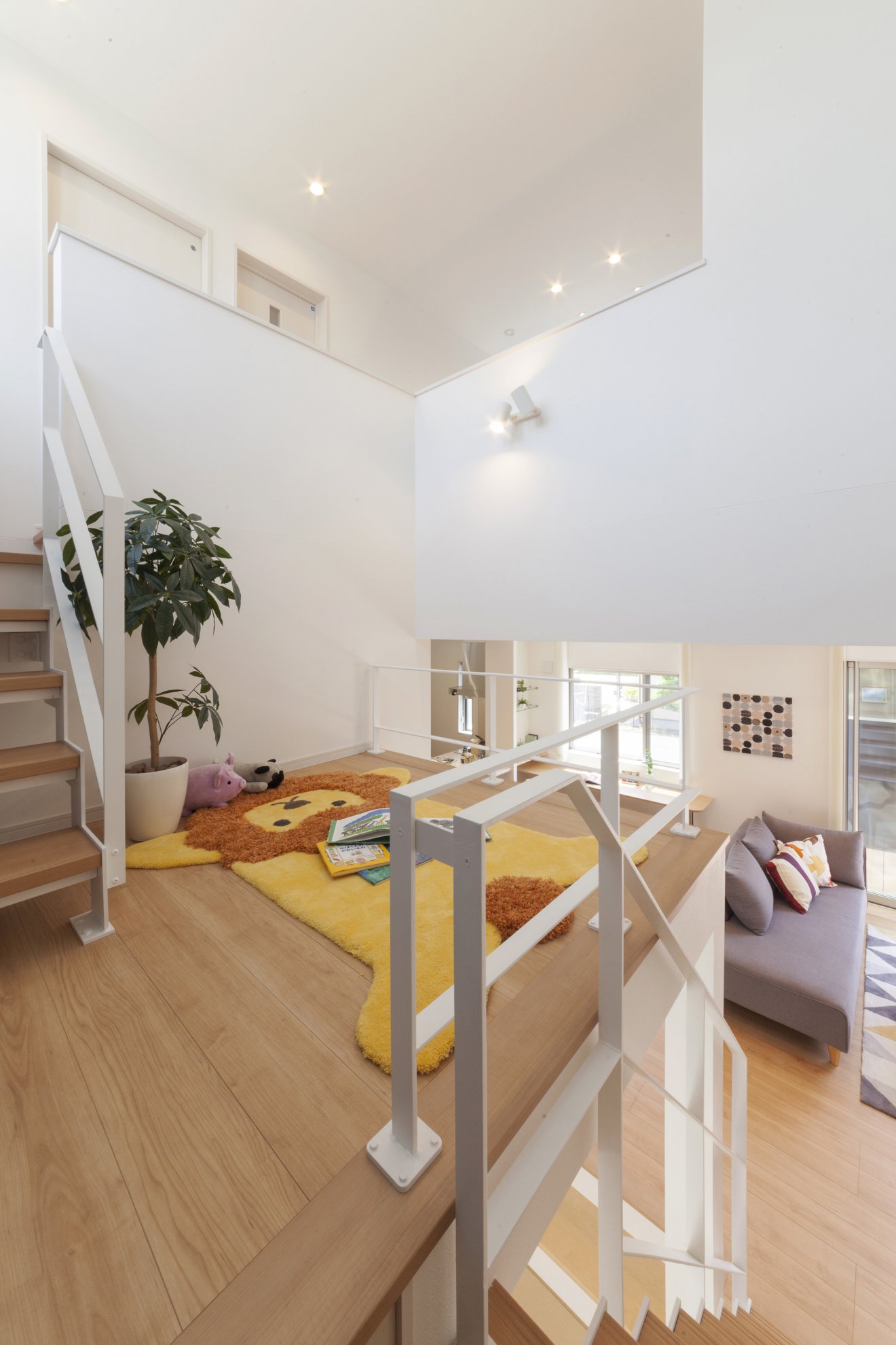 【スキップフロア】リビングの家族と丁度良い距離感で触れ合いながら過ごせるスキップフロアです。 【畳コーナー】リビングに隣接する掘り床の畳コーナー。子どもが元気に遊べる空間になっている。