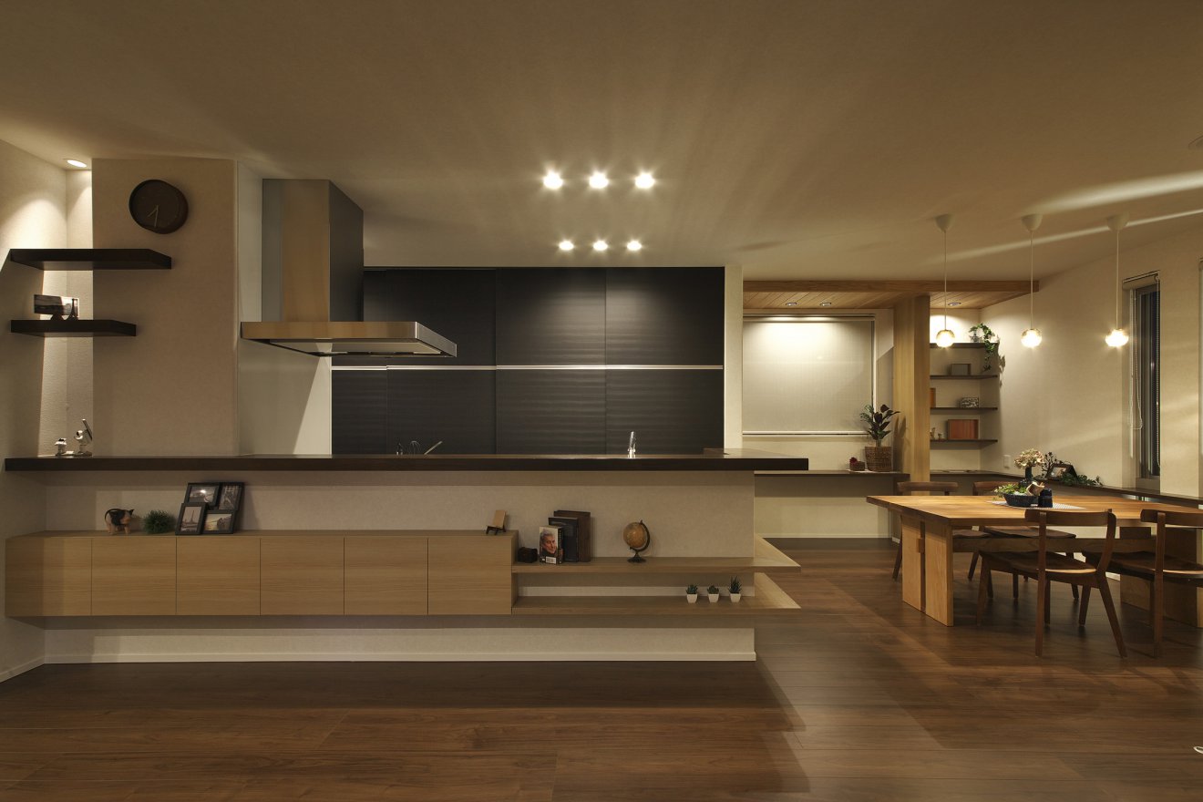 【夜景・LDK】キッチンカウンターの下に飾り棚を造作しました。飾る楽しさが日常生活を豊かしてくれます。