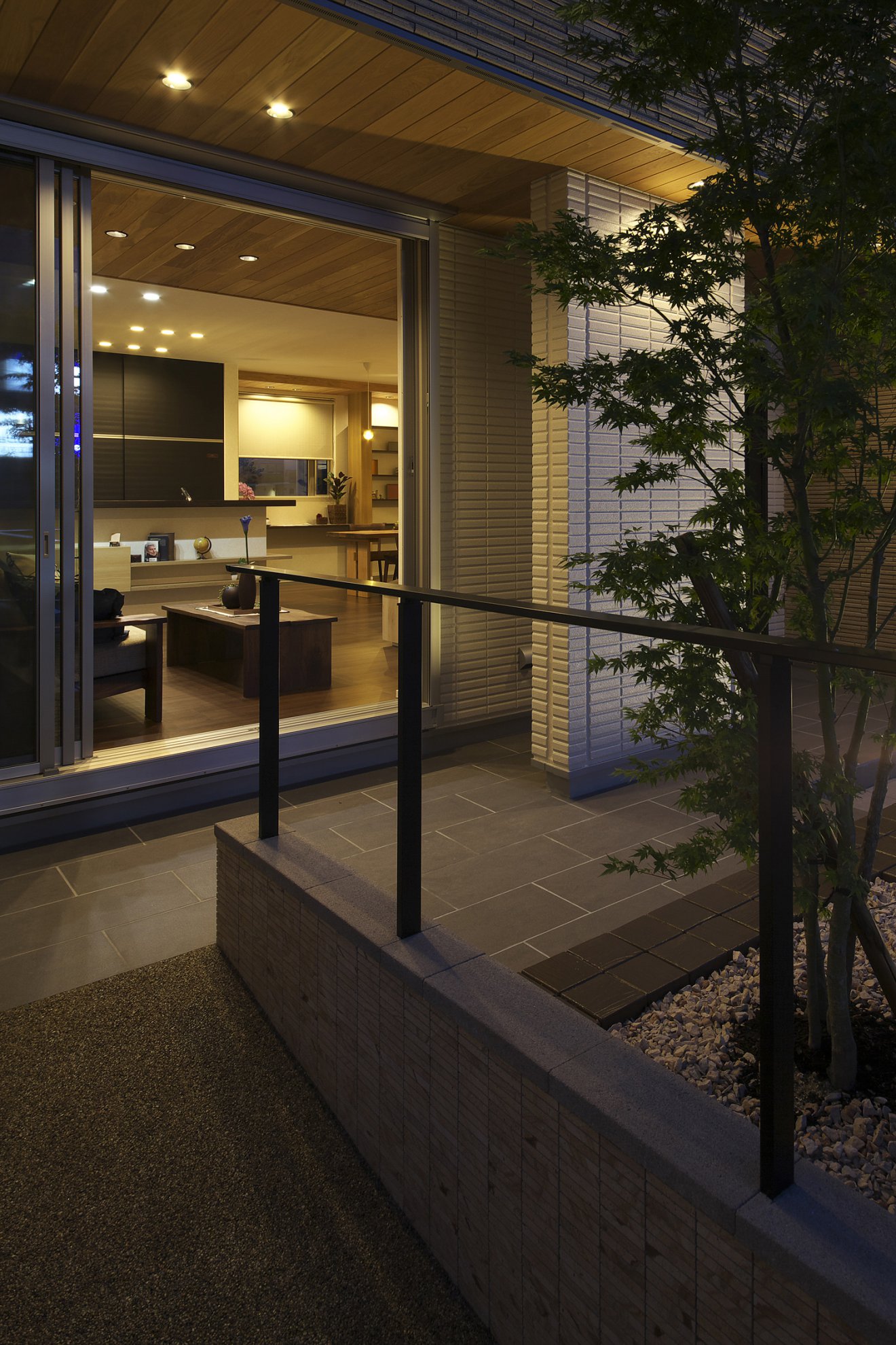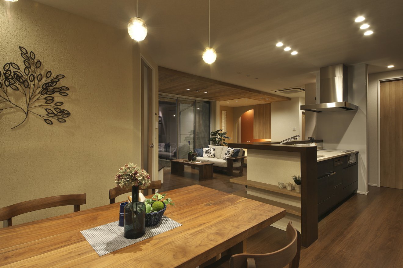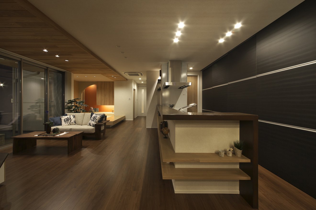【夜景・DK】視線を奥へと導いていく伸びやかで豊かな空間がここにはあります。 【夜景・スロープ】あたたかい照明とさりげない庭は、きっと憩いの場になるでしょう。
