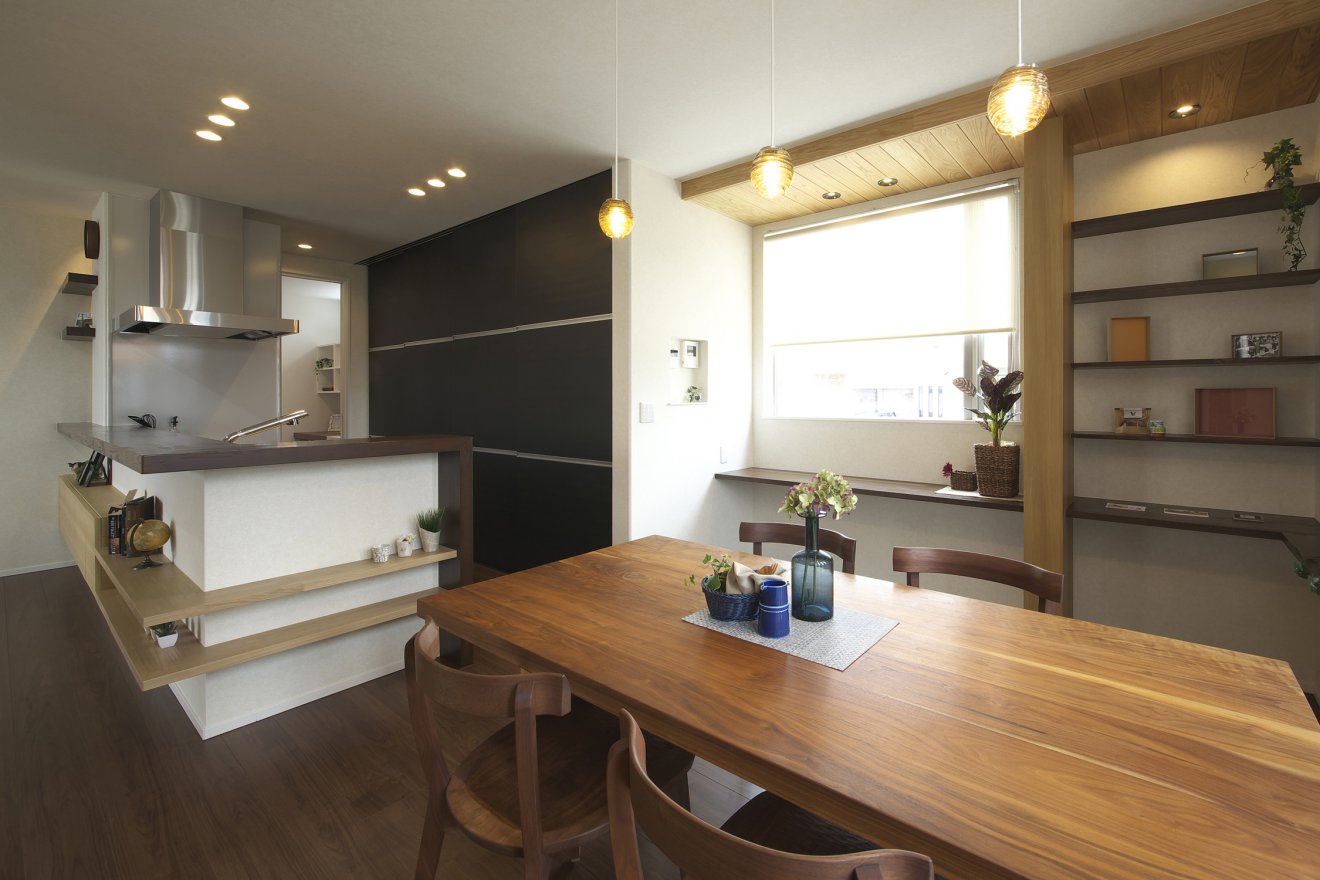 【DK】回り込まずに横移動だけでスムーズな配膳ができる横並びのダイニングとキッチンです。よくいる場所だからこそ、棚にお気に入りのアイテムを飾る。そんな空間に仕上げています。