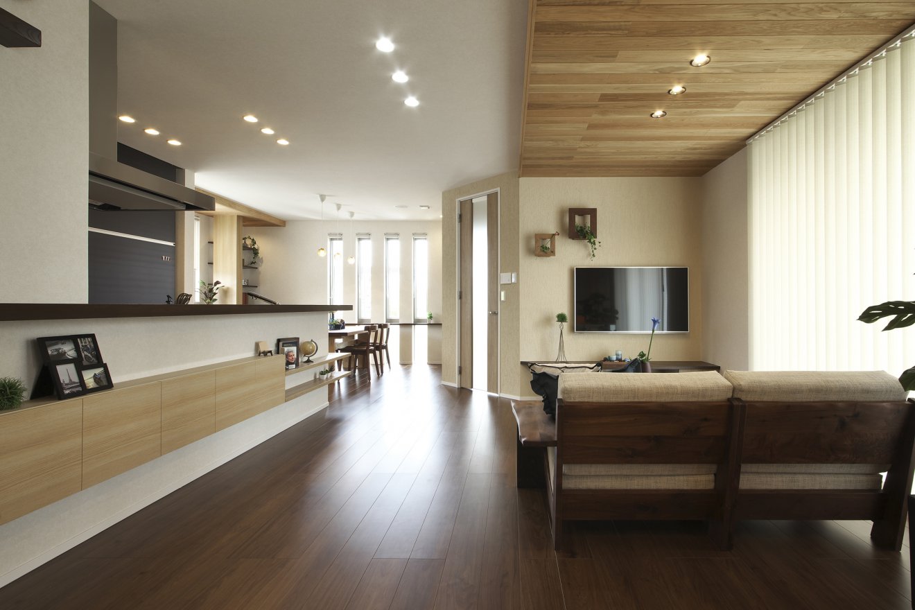 【LDK】取り込まれた陽光に浮かび上がるフロア、多方向から取り込まれた採光、考え抜かれた照明計画は、住まう人を優しく包み込みます。