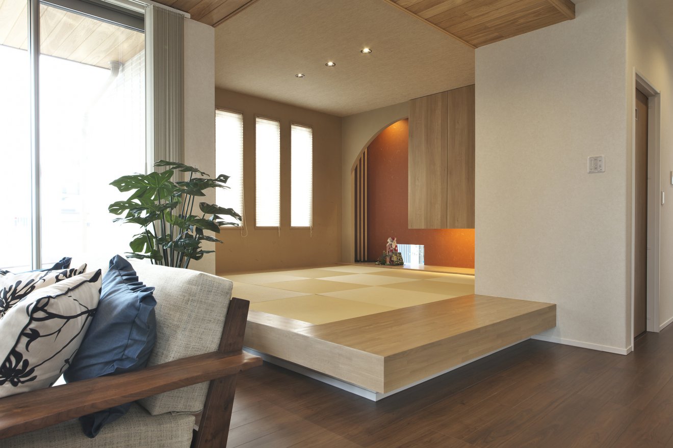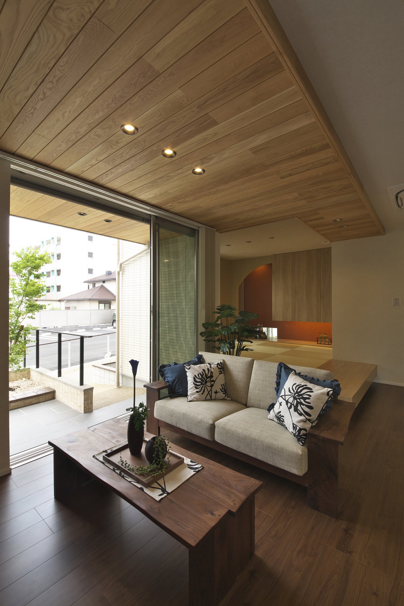 【リビング】天井はテラスと室内がつながるような印象の仕上げです。軒天井とリビング天井を同じナラの無垢板でデザインしました。 【和室】日常的に使いこなせるようにと、扉を無くしてリビングに隣接して設けた和室です。