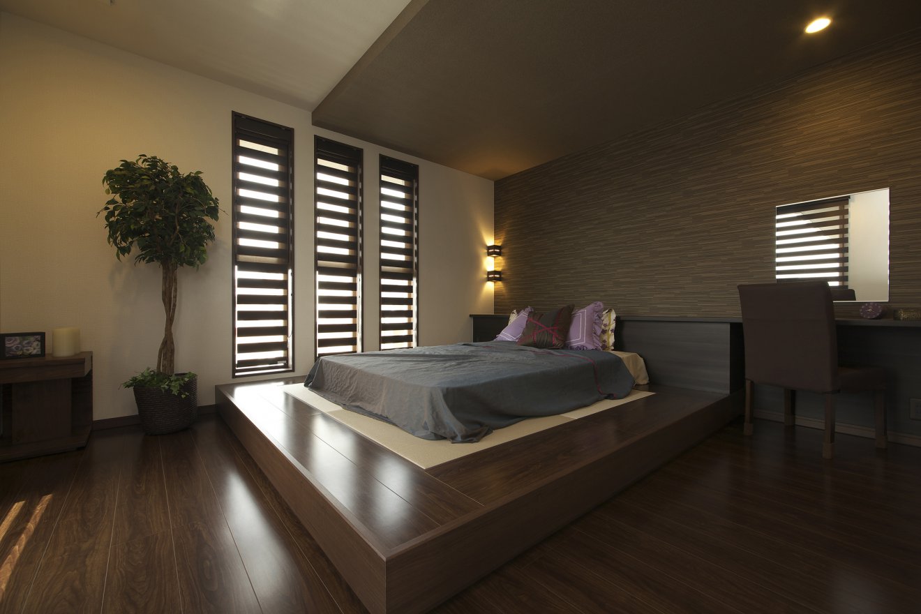【主寝室】小上がりのタタミスペースにマットレスを置きました。布団でもなく、ベッドでもない新しい提案です。