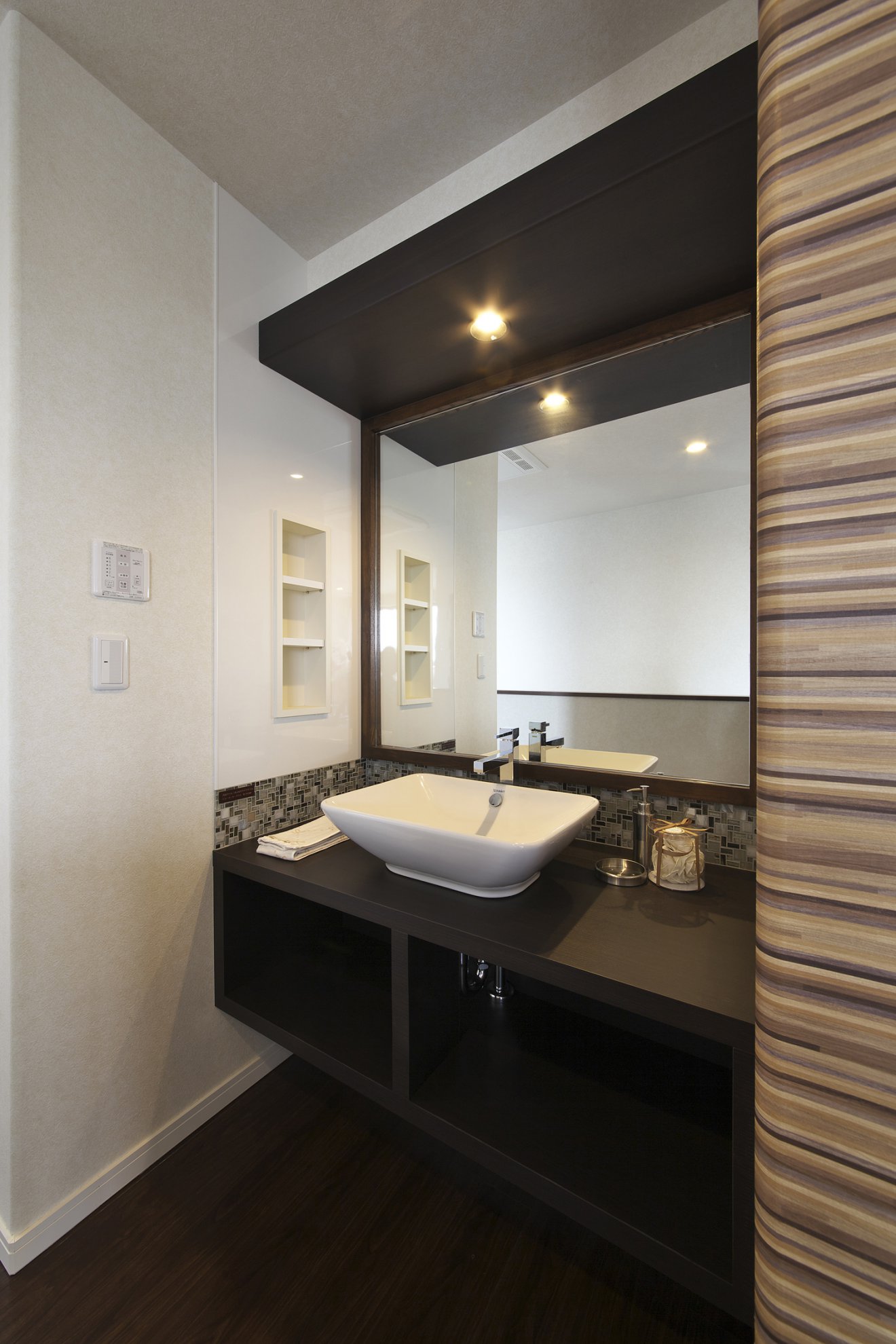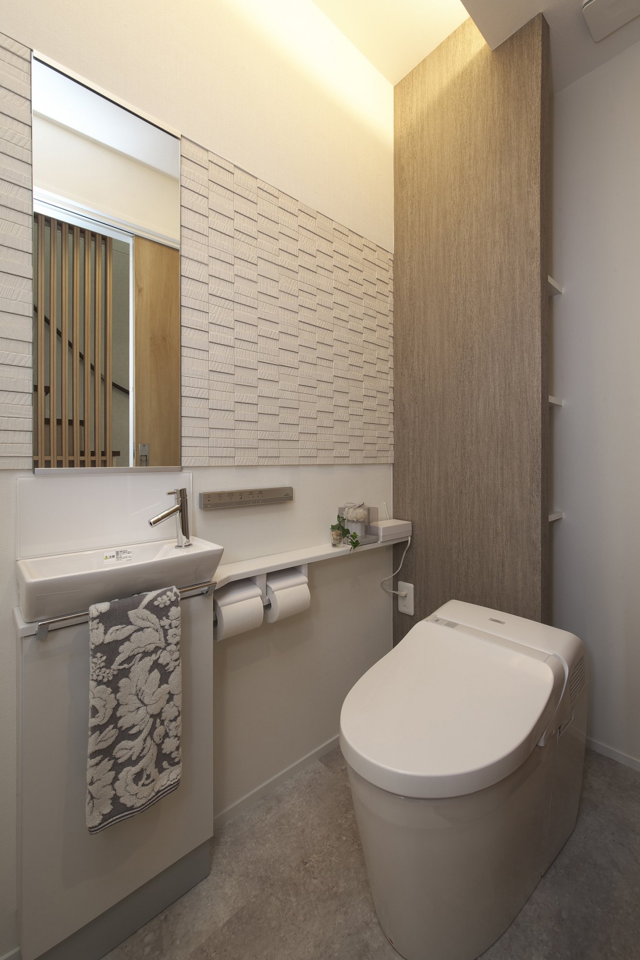 【洗面化粧台】ホテルライクな洗面化粧台で、輝きのある日常生活を送れます。 【トイレ】間接照明を有効に使ったり、調湿機能のある室内タイルを貼りました。おしゃれで快適な空間が出来ました。