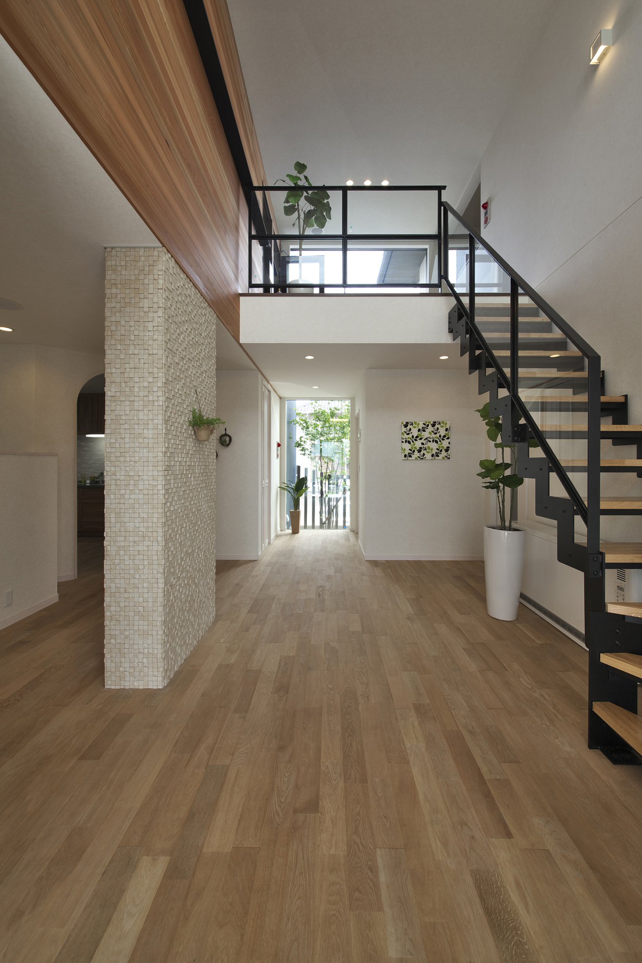 【吹き抜け】広々とした吹き抜けホールは単調な景色になりがちです。アクセントタイル・レッドシダーの壁・黒色の鉄骨階段で空間にリズムと彩りを与えました。