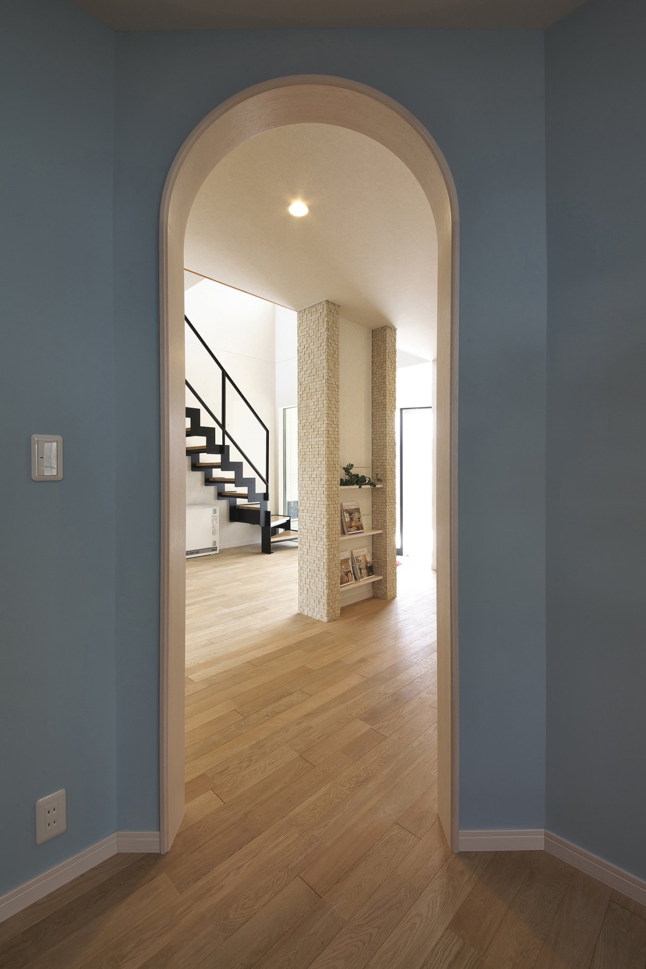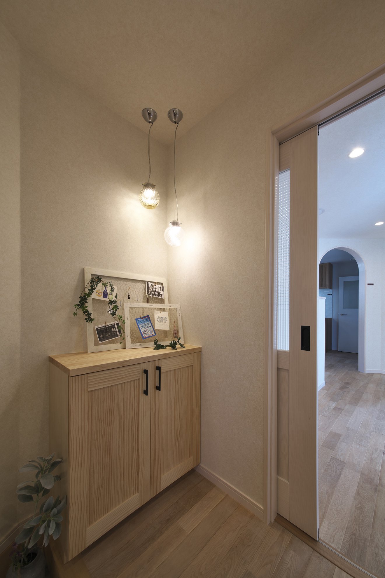 【玄関】お洒落な素朴さが魅力の玄関。無垢板床が温かい雰囲気です。 【R垂れ壁】雰囲気のあるR垂れ壁は、何気ない景色を魅力なシーンに変えてくれます。
