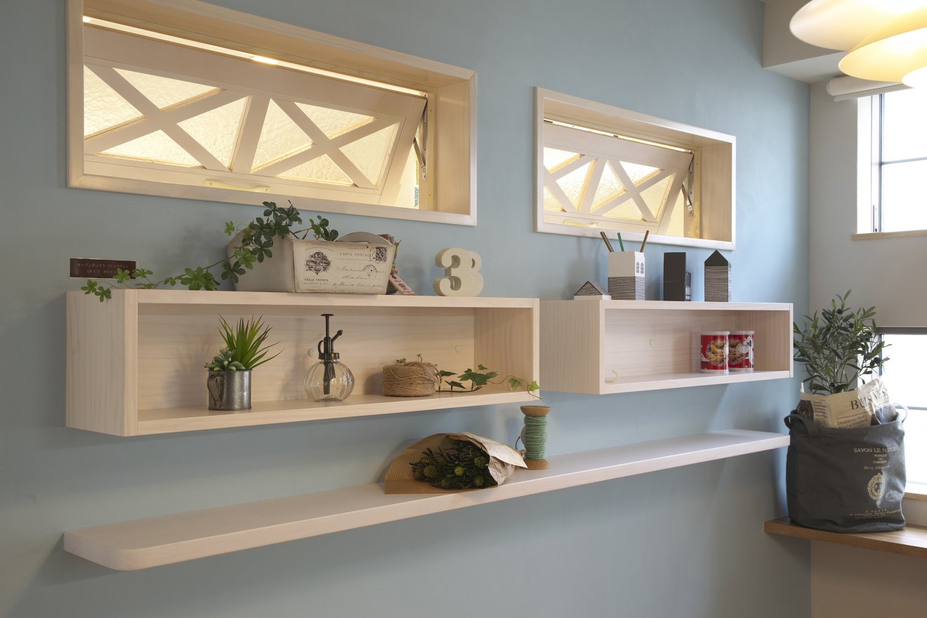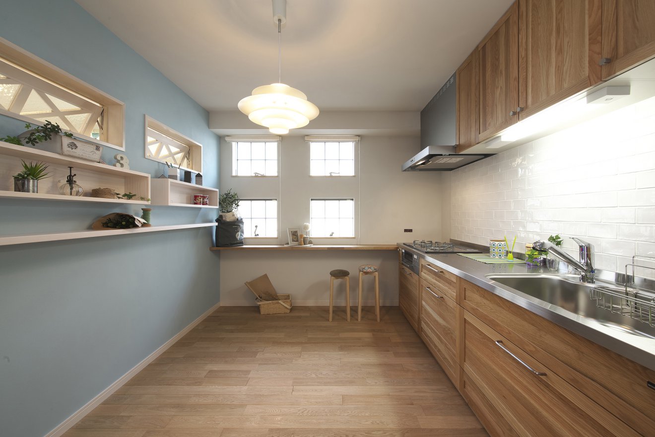 【キッチン】パステルカラーの塗り壁とホワイトタイルで仕上げられた北欧テイストのキッチンです。 【棚】魅せる収納棚と室内窓のコンビネーションは、素朴だが優しさとセンスに満ち溢れています。