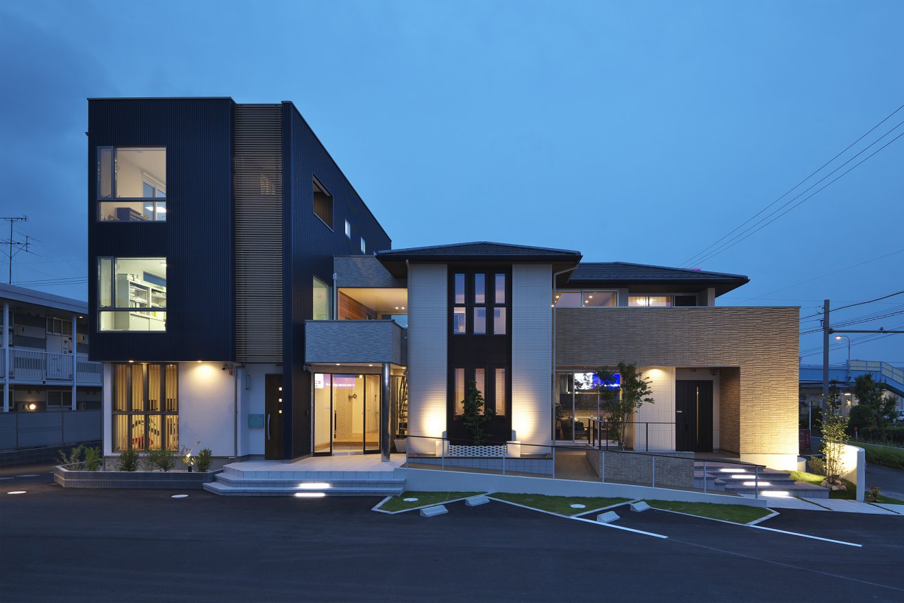 【夜景・外観】狭小地にも対応する3階建タイプと風格のある2階建タイプ。建築と照明と庭が融合して、その明かりが街の灯となり、地域の景観として周囲を照らします。
