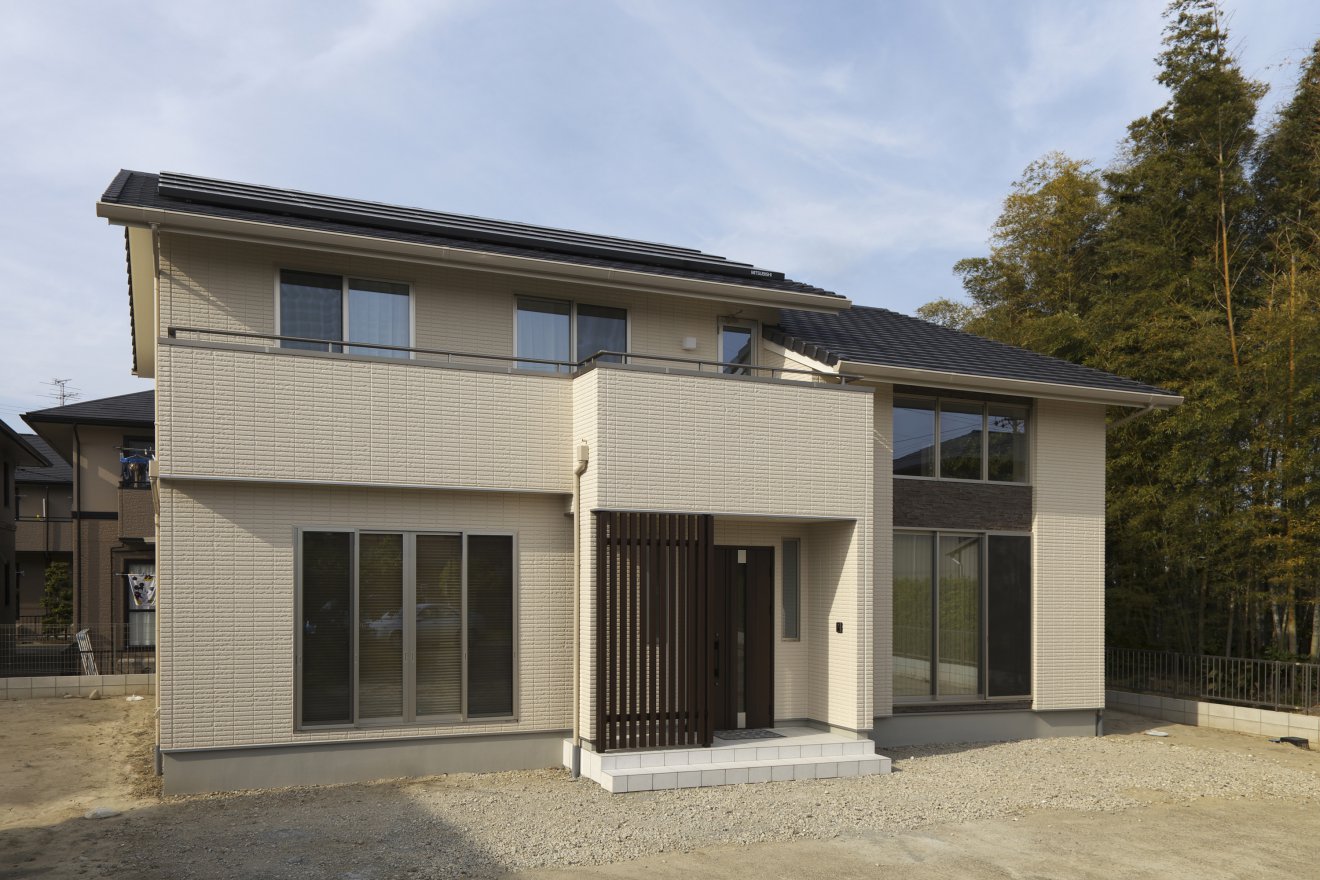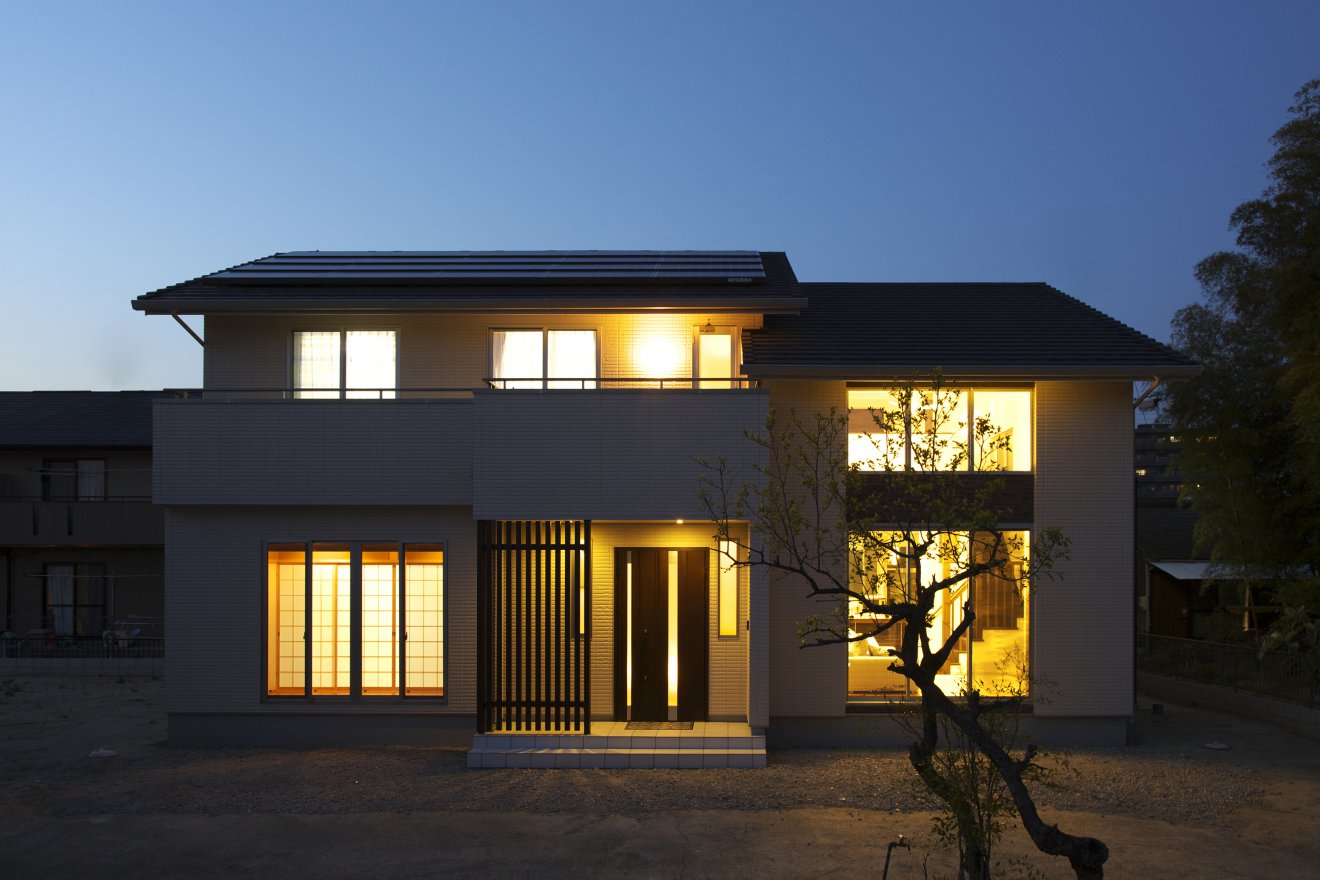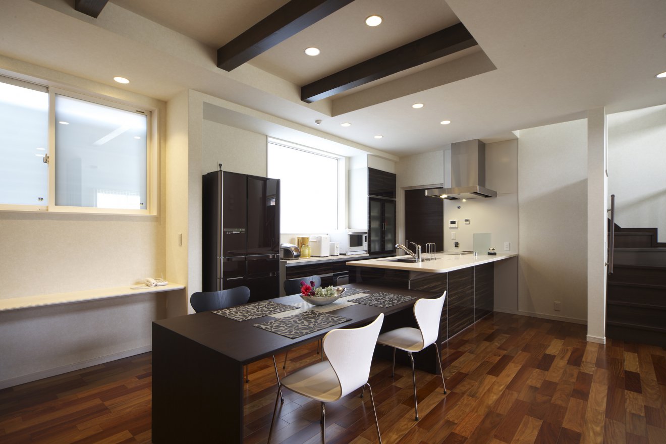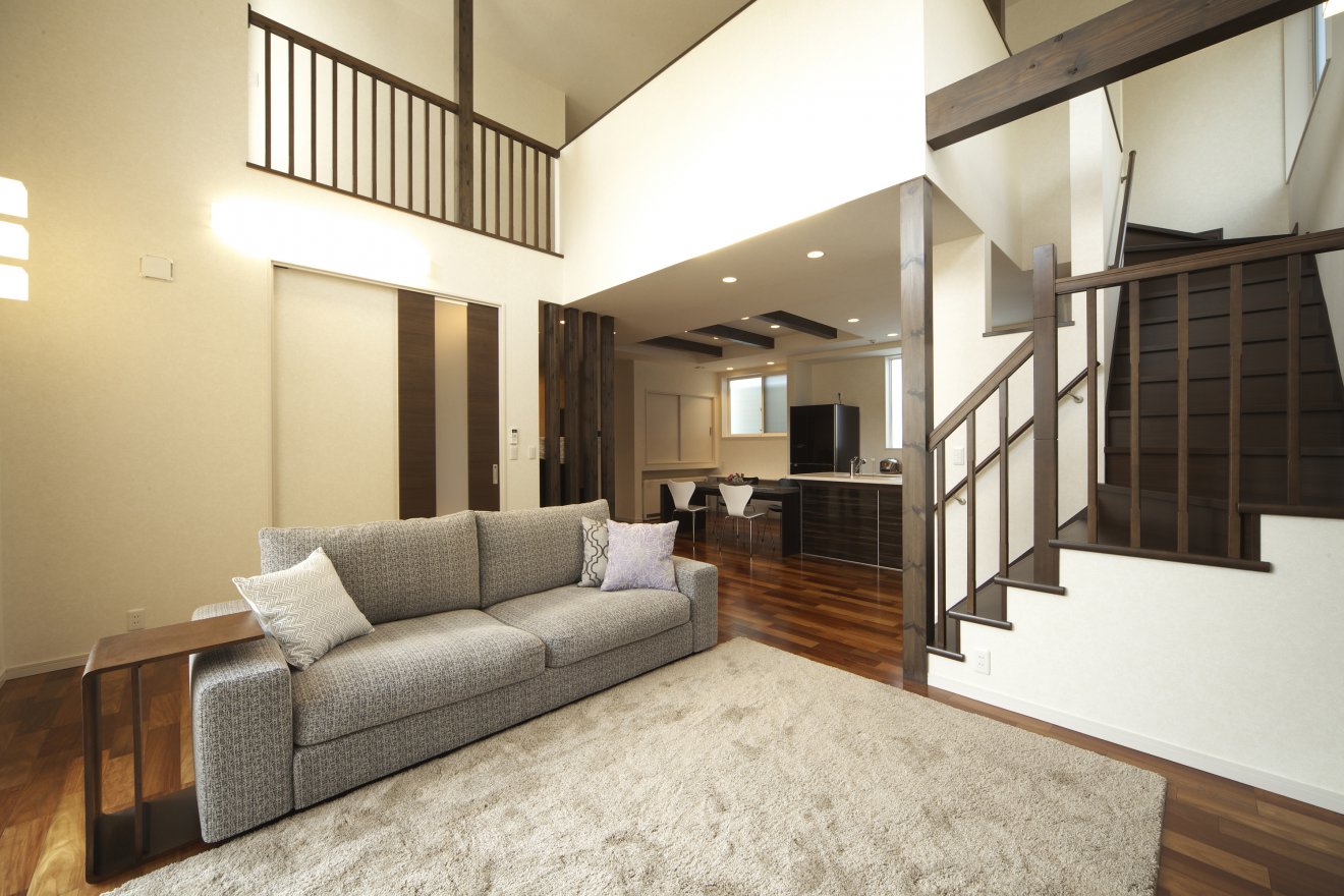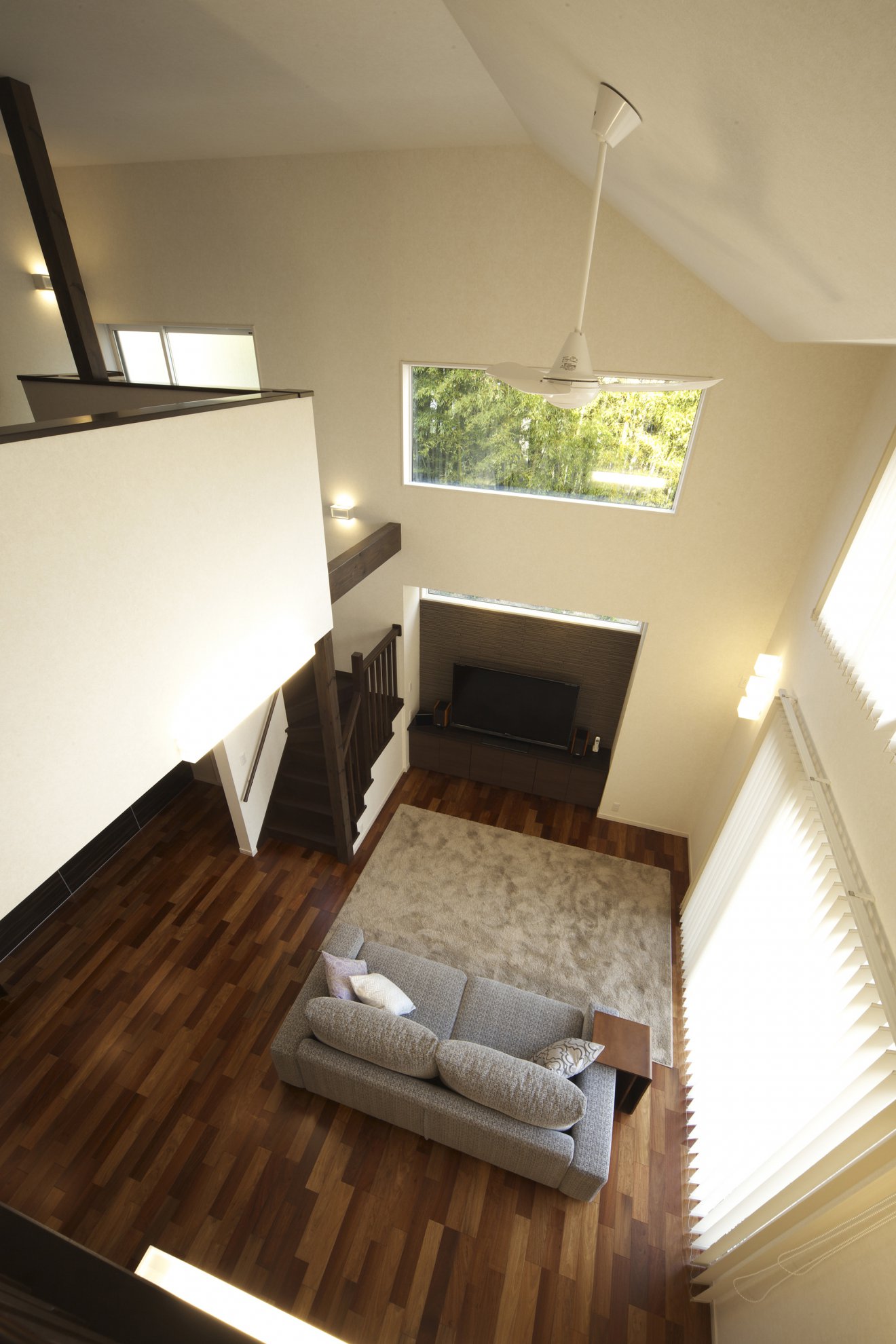 2階ホールと一体化した大空間の吹き抜けが特長の住まい。高窓から降り注ぐ光が明るくリビングを照らします。開放的な雰囲気とシーリングファンが、まるでリゾートホテルのようです。また、家族のコミュニケーションを育むために、ダイニングとリビング、和室はつながるように動線をプランニングしました。