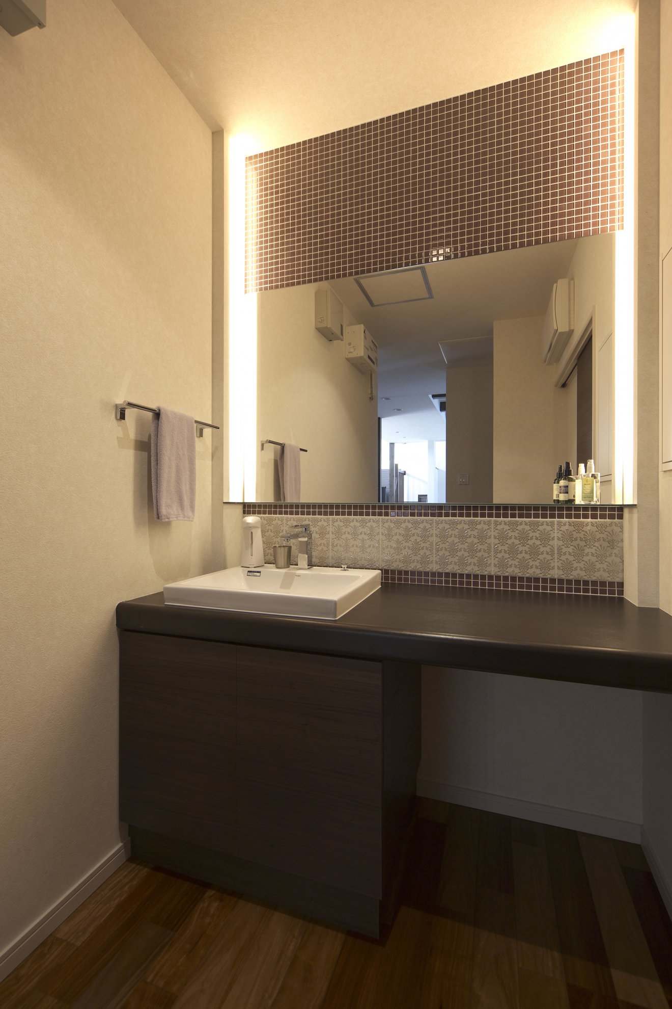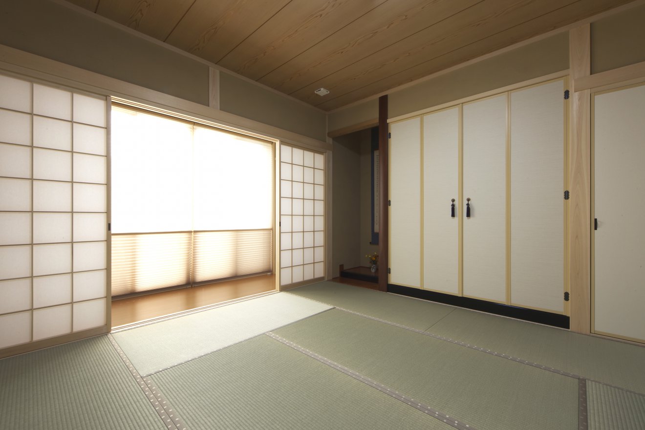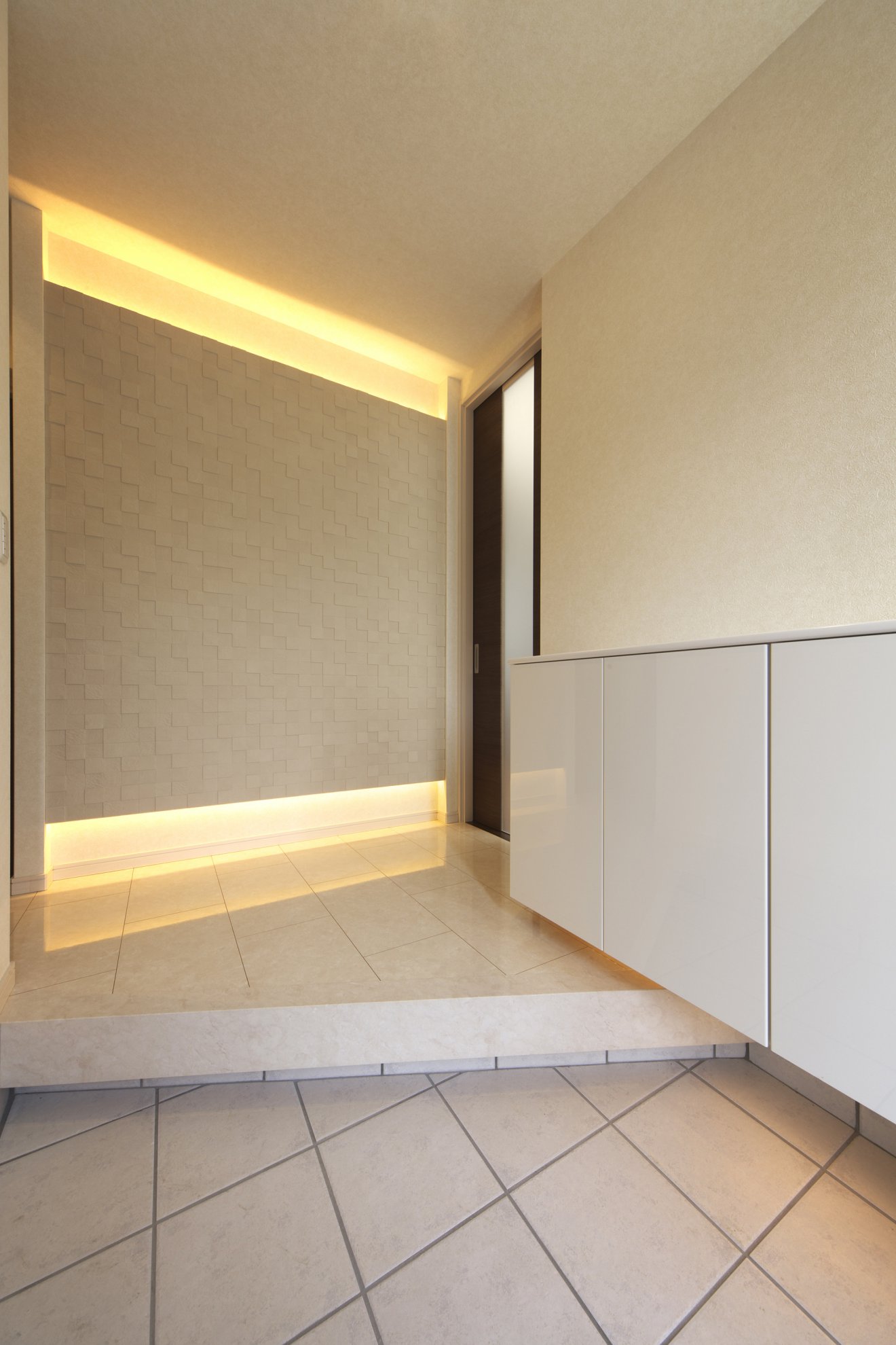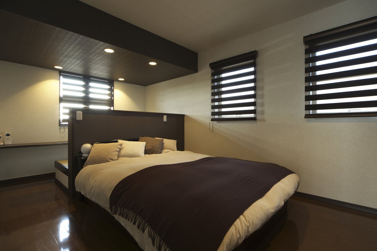 2階ホールと一体化した大空間の吹き抜けが特長の住まい。高窓から降り注ぐ光が明るくリビングを照らします。開放的な雰囲気とシーリングファンが、まるでリゾートホテルのようです。また、家族のコミュニケーションを育むために、ダイニングとリビング、和室はつながるように動線をプランニングしました。