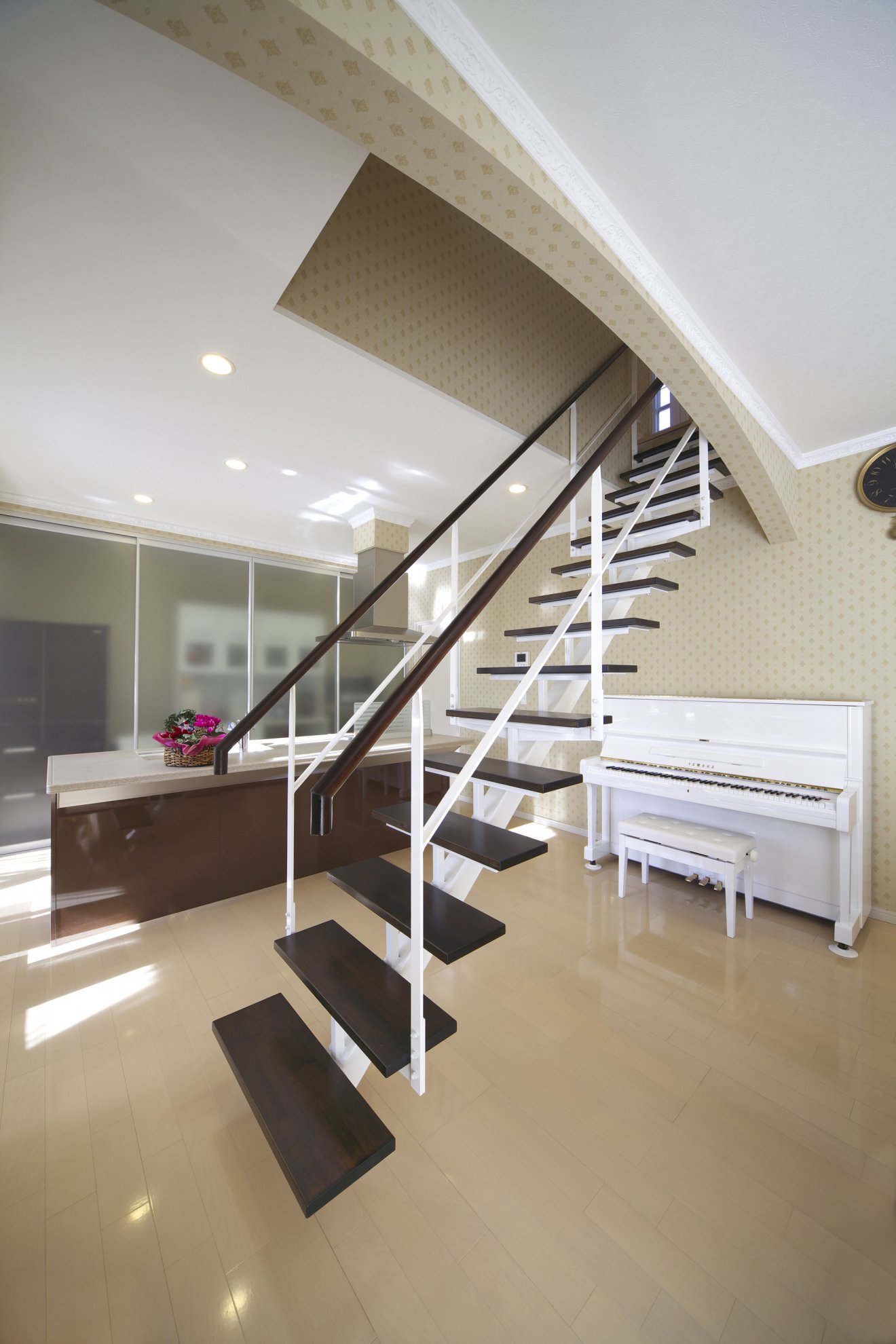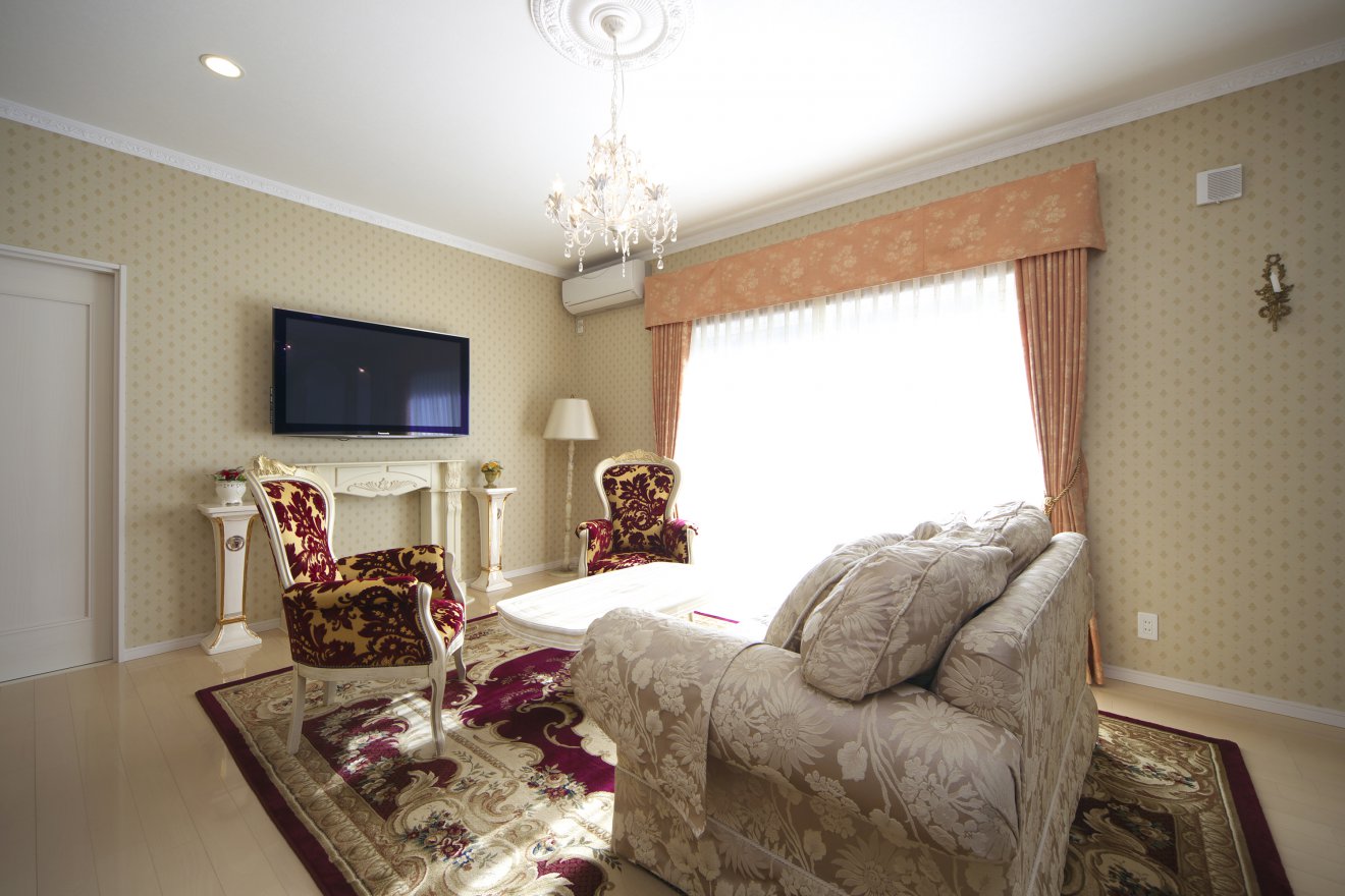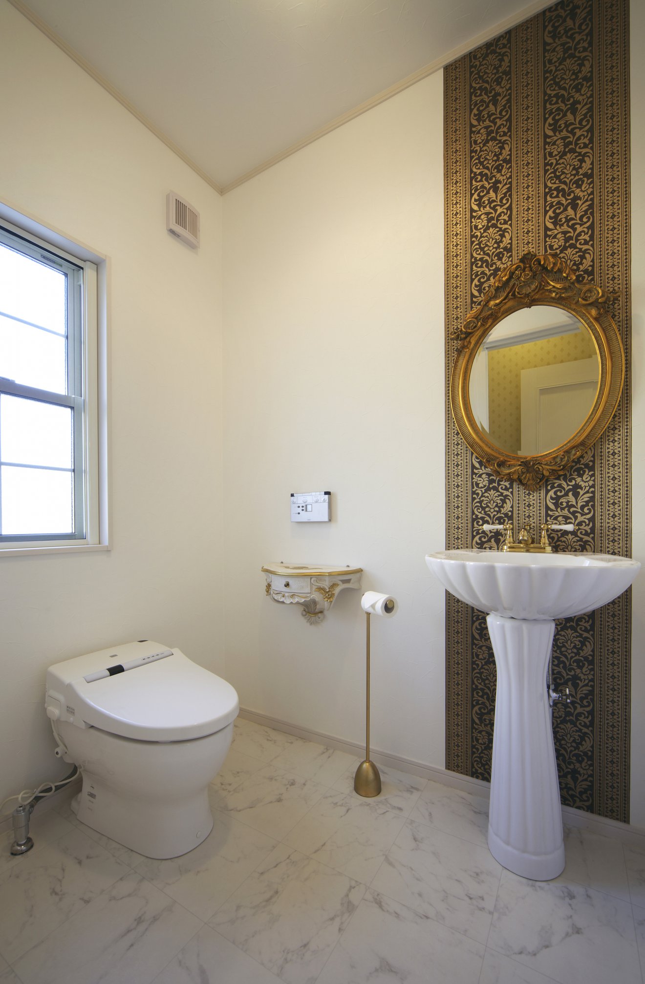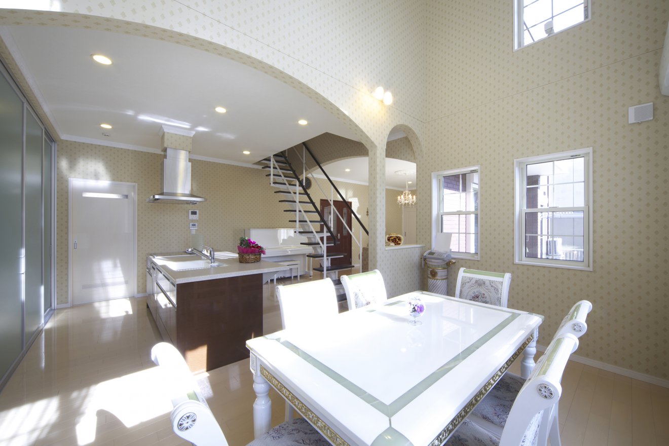 ギリシャ柱で演出した幅広のアプローチとシンメトリーで安定感あるフォルム、赤レンガ調外壁が特長のオールドアメリカンスタイルの住宅。開放的な玄関の吹き抜けも洋館スタイルのこだわりです。気品に満ちた空間づくりのために、クロスや装飾、家具選びは念入りに行いました。トイレは手洗いボウルや水洗、鏡など選び抜いた調度品も手伝って、まるでホテルのような仕上がり。約27帖、天井高2.7mの広々としたLDKには、ストリップ階段を合わせて軽やかさを演出してみました。