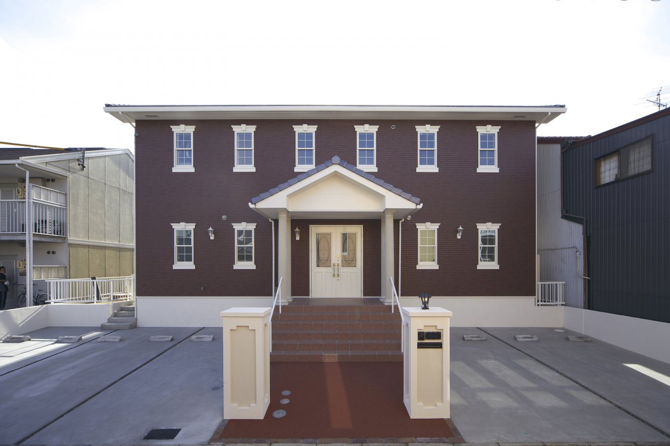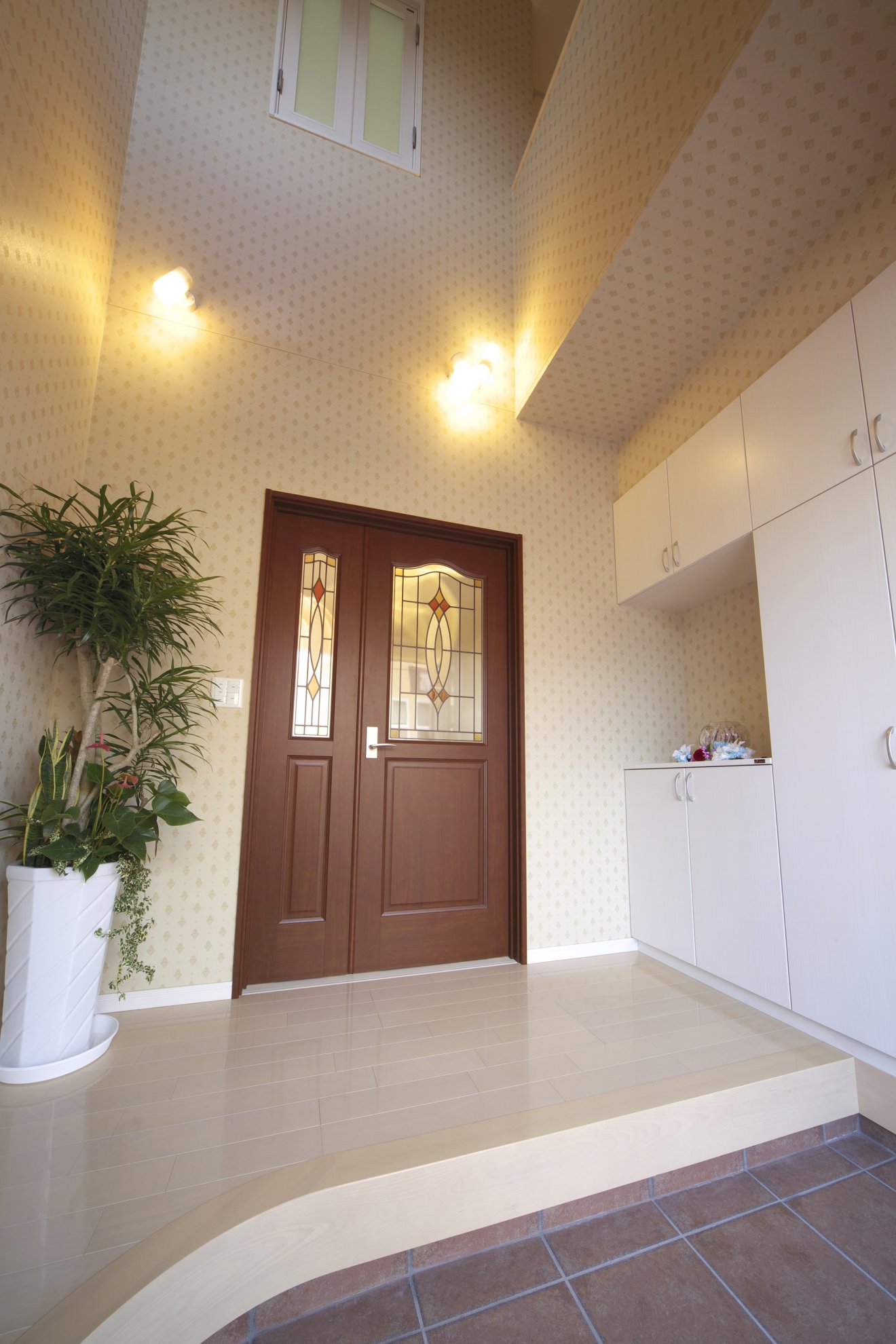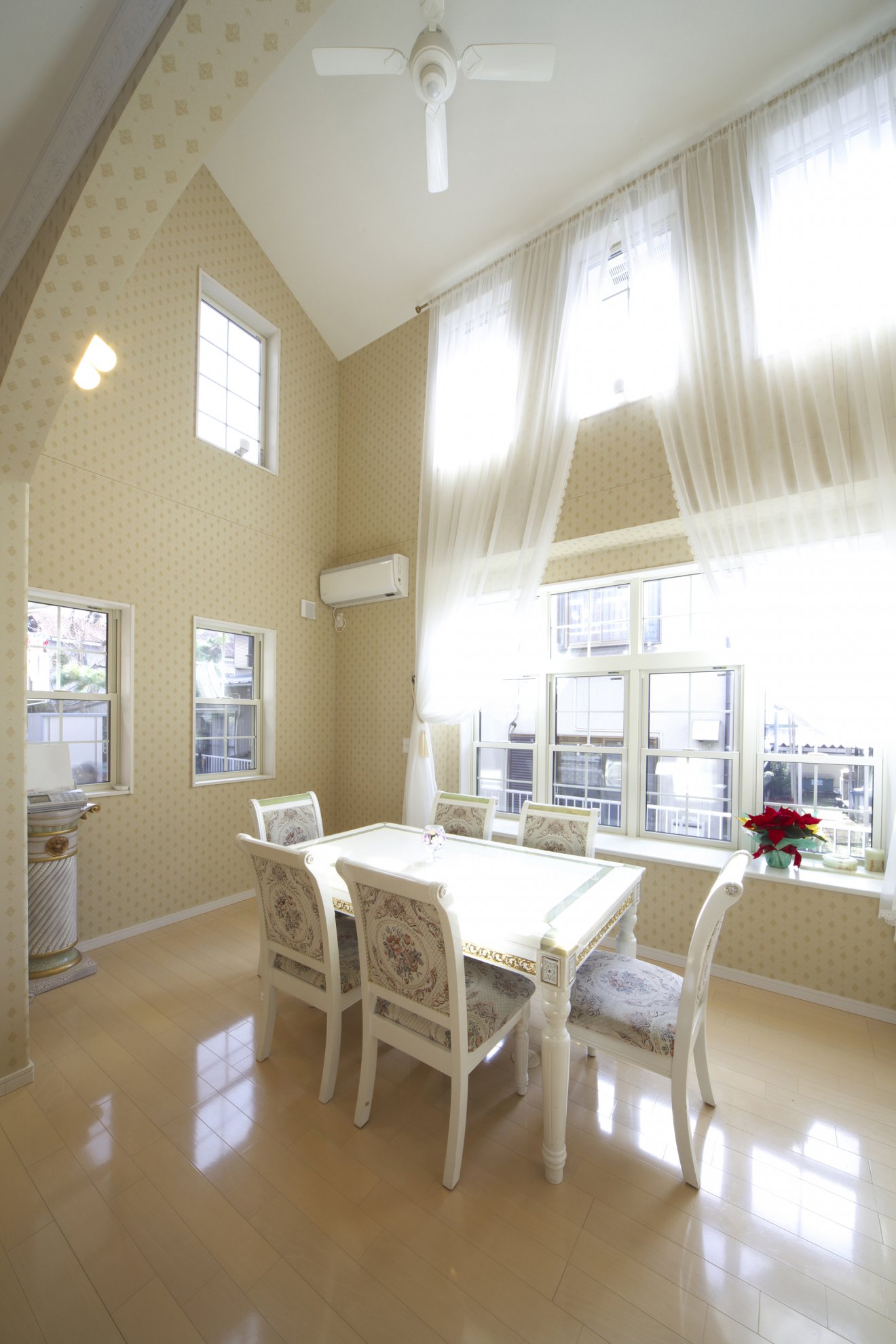 ギリシャ柱で演出した幅広のアプローチとシンメトリーで安定感あるフォルム、赤レンガ調外壁が特長のオールドアメリカンスタイルの住宅。開放的な玄関の吹き抜けも洋館スタイルのこだわりです。気品に満ちた空間づくりのために、クロスや装飾、家具選びは念入りに行いました。トイレは手洗いボウルや水洗、鏡など選び抜いた調度品も手伝って、まるでホテルのような仕上がり。約27帖、天井高2.7mの広々としたLDKには、ストリップ階段を合わせて軽やかさを演出してみました。