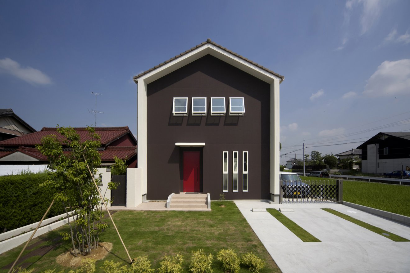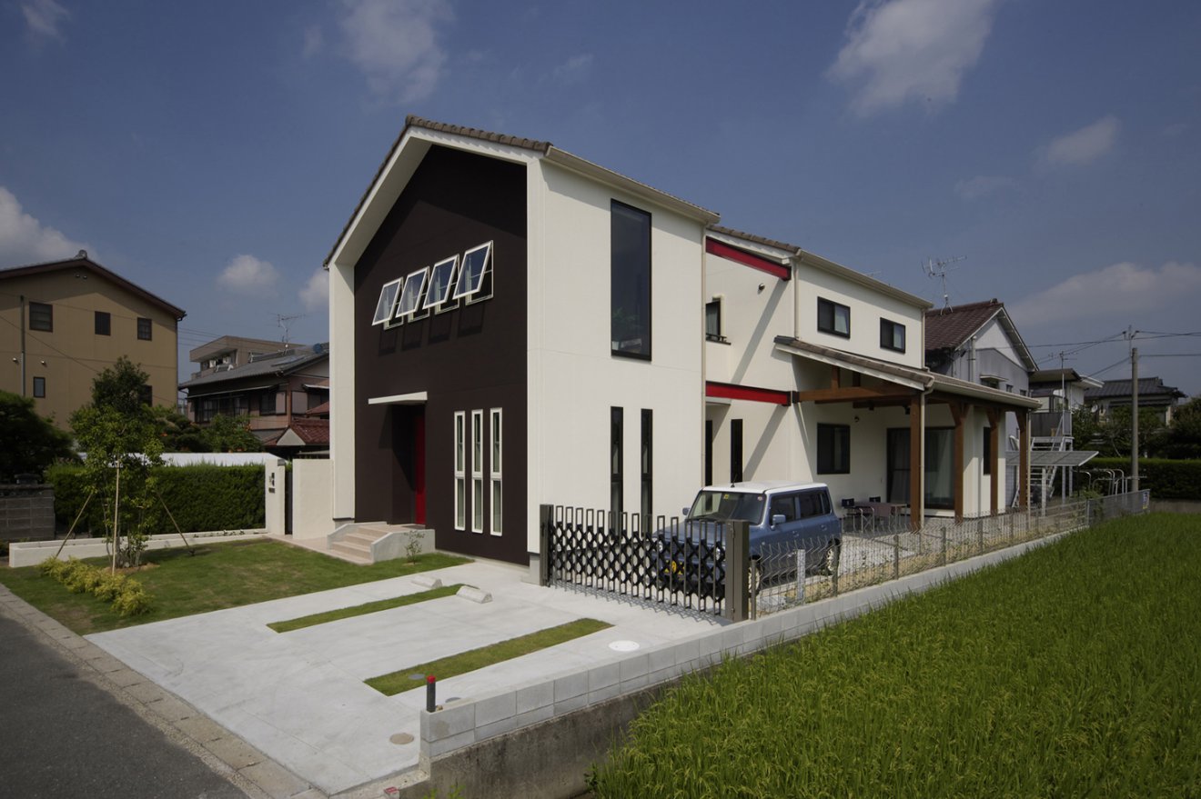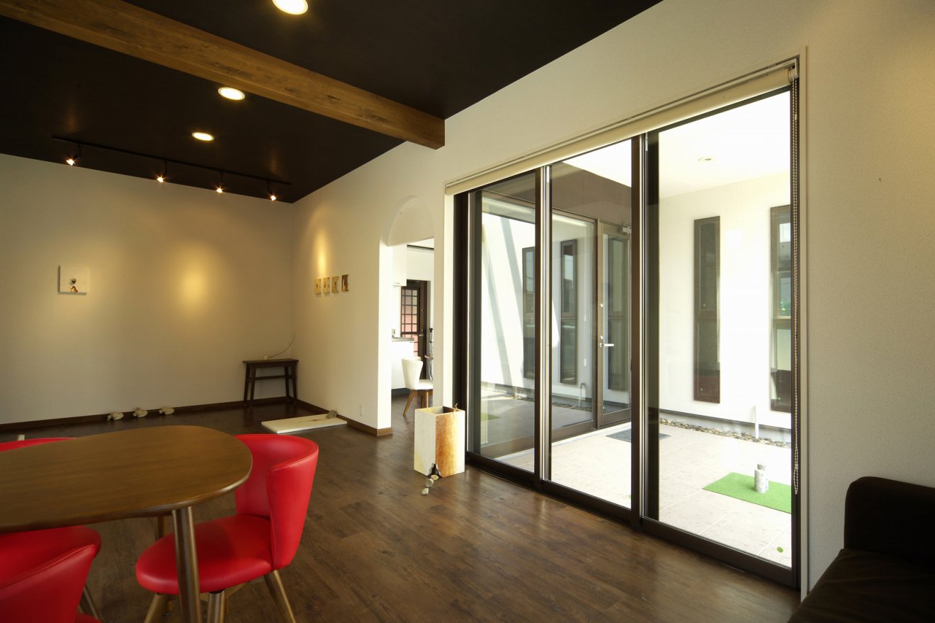 アート作家ならではの個性派住宅。赤をポイントに効かせた納屋風デザインの外観が、ひと際目を引きます。天井にあえて濃い色を持ってきたり、構造材を見せることで、生活感を感じさせない空間に仕上がりました。ディスプレイ用のニッチや照明など、細部にもギャラリー様の工夫を施しています。