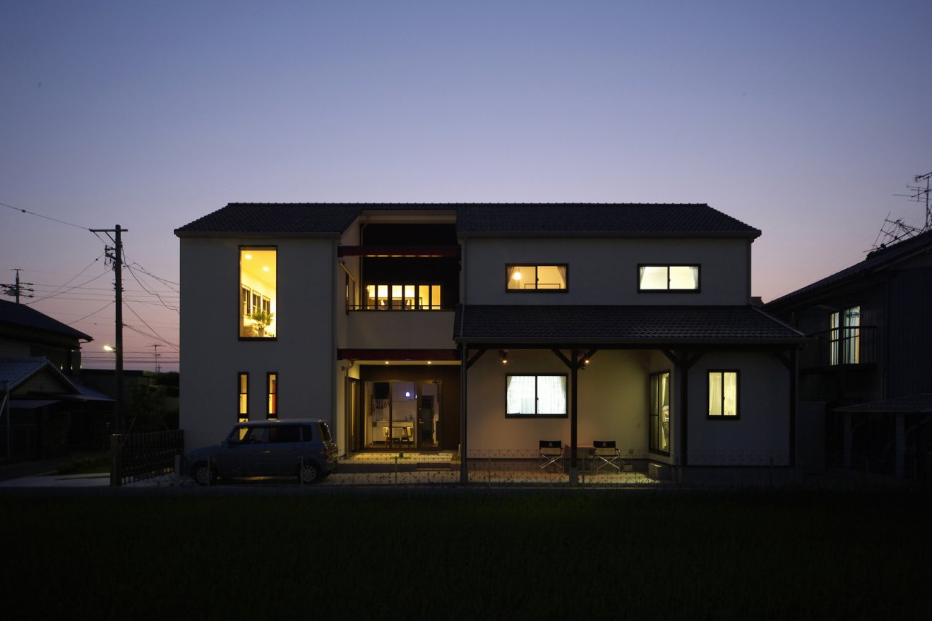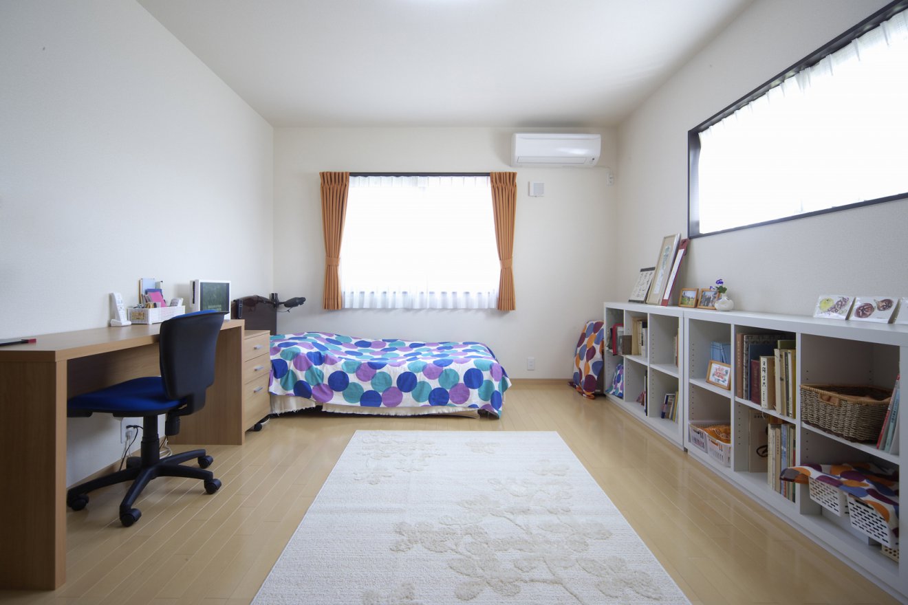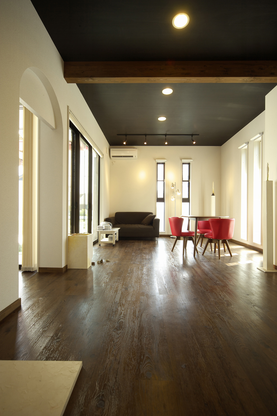 アート作家ならではの個性派住宅。赤をポイントに効かせた納屋風デザインの外観が、ひと際目を引きます。天井にあえて濃い色を持ってきたり、構造材を見せることで、生活感を感じさせない空間に仕上がりました。ディスプレイ用のニッチや照明など、細部にもギャラリー様の工夫を施しています。