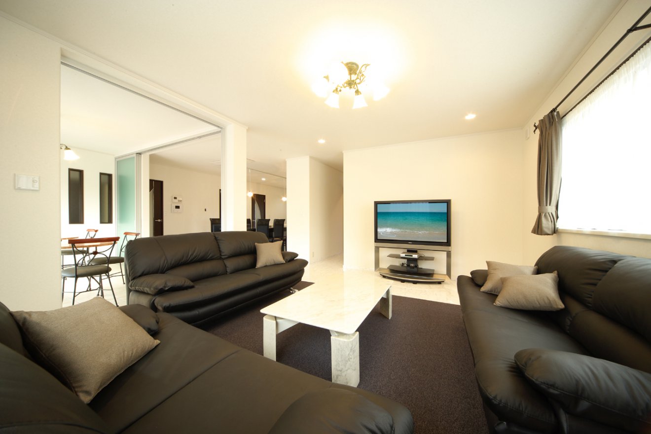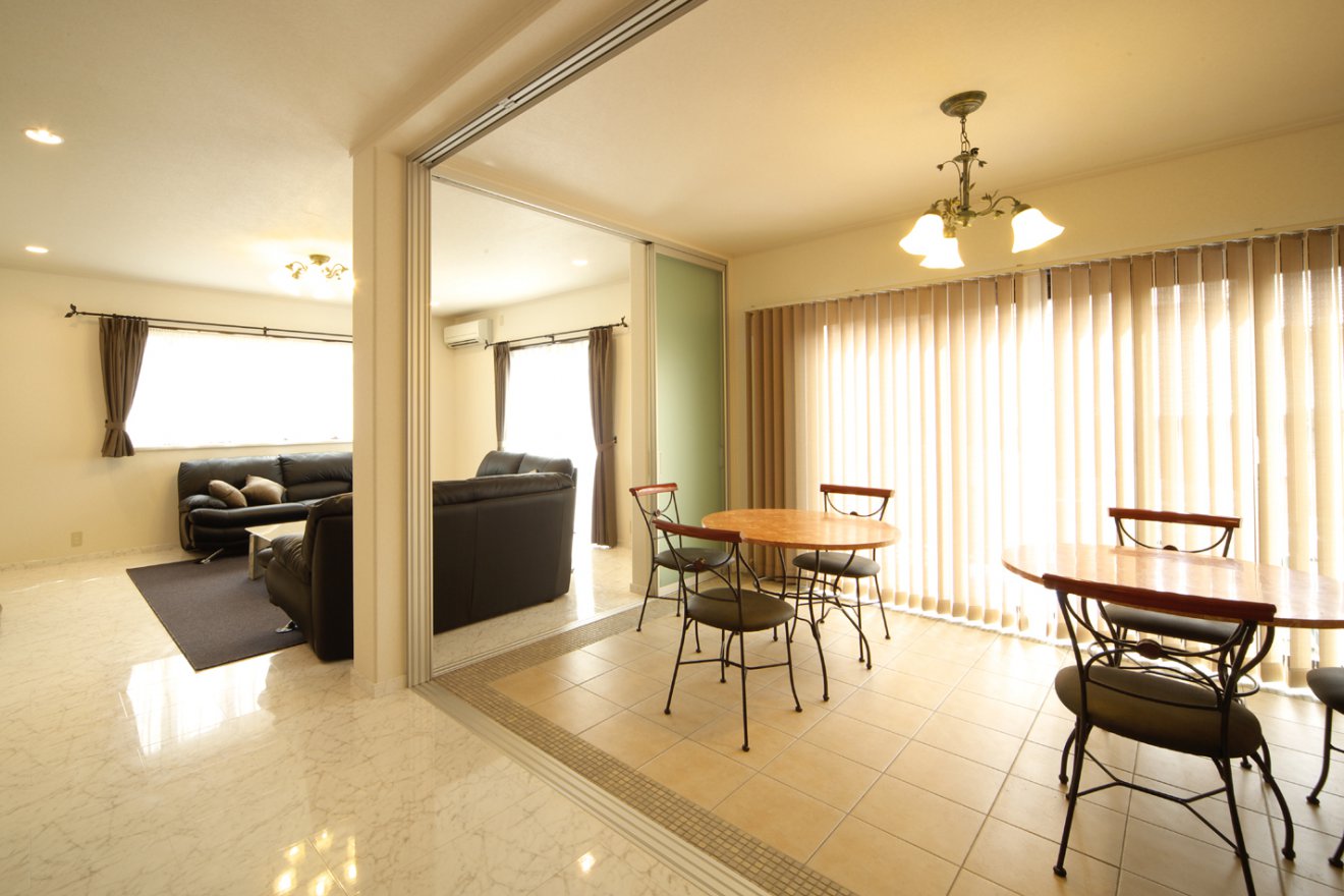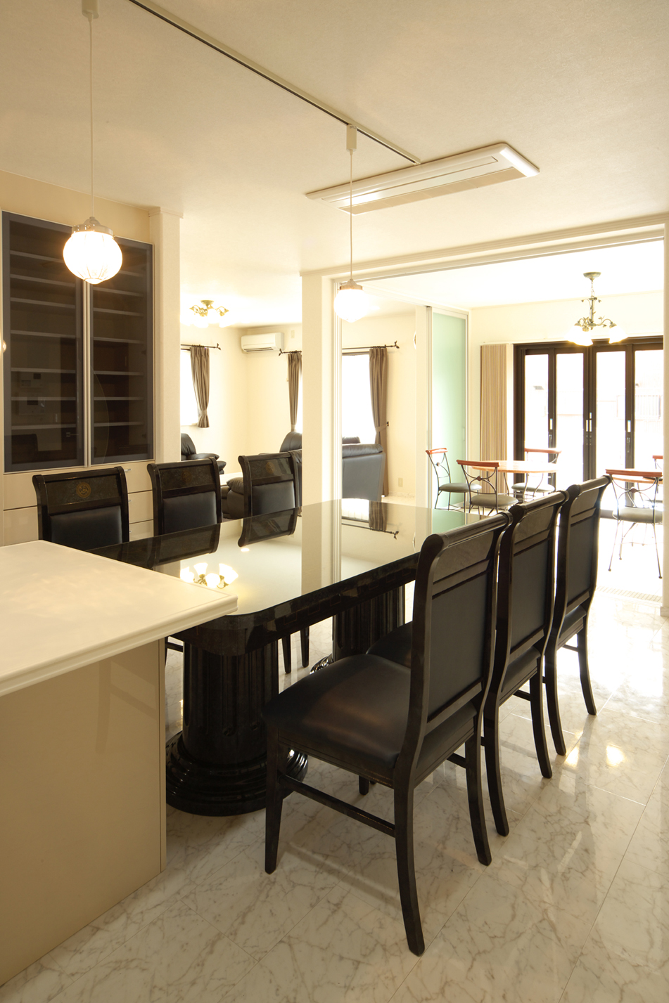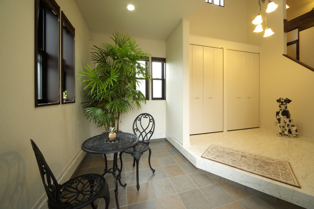 ホワイト系の石目調床材で、明るく高級感ある玄関ホールとLDK。家具もモノトーンで統一し、シックで落ち着いた印象にまとめました。