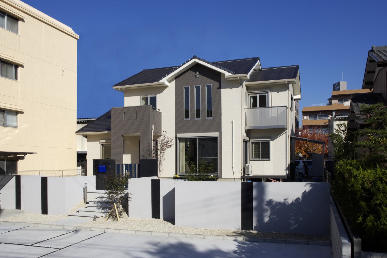 【外観】モノトーンの外壁デザインとスリットウィンドウで縦ラインを強調し、伸びやかさを表現しました。