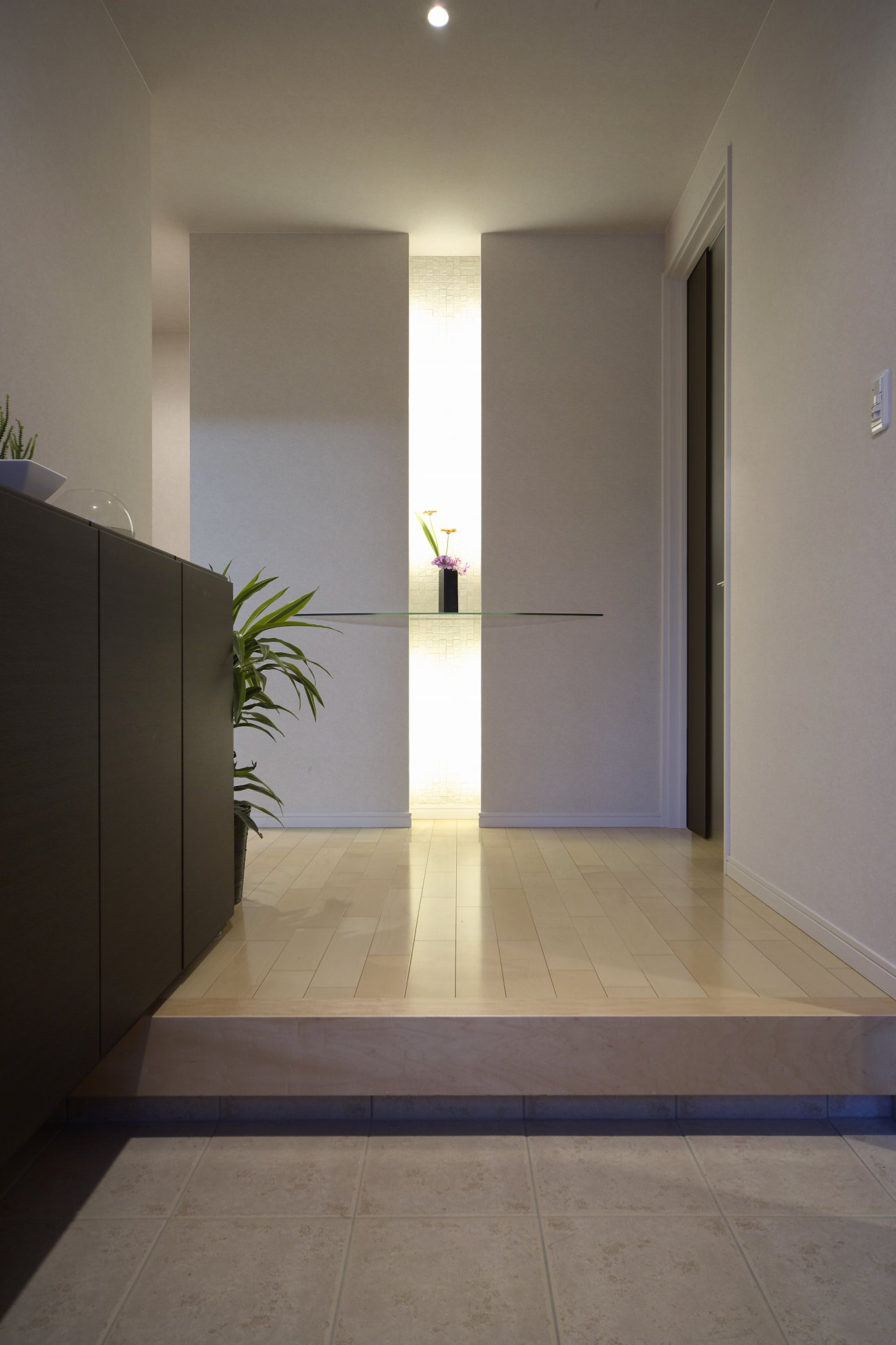 外観はモノトーンの外壁にスリットウィンドウを組み合わせ、伸びやかな縦ラインを意識しました。玄関ホールはライティングウォールでシックかつ華やかな印象に。LDKのタタミコーナーは家族の憩いの場として活躍します。