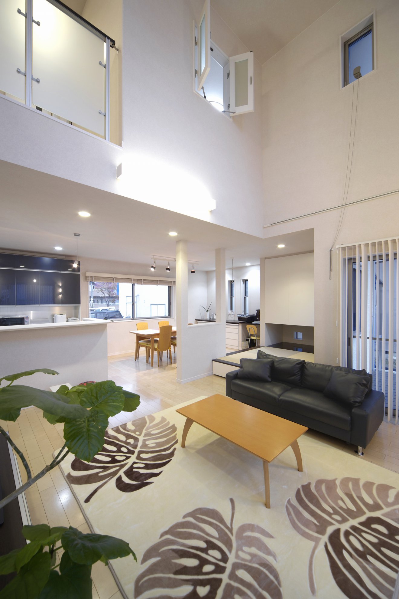 【吹抜け】迫力ある開放的な吹抜け。吹付断熱と床暖房が快適な室温を保ち、冷暖房効率を高めています。