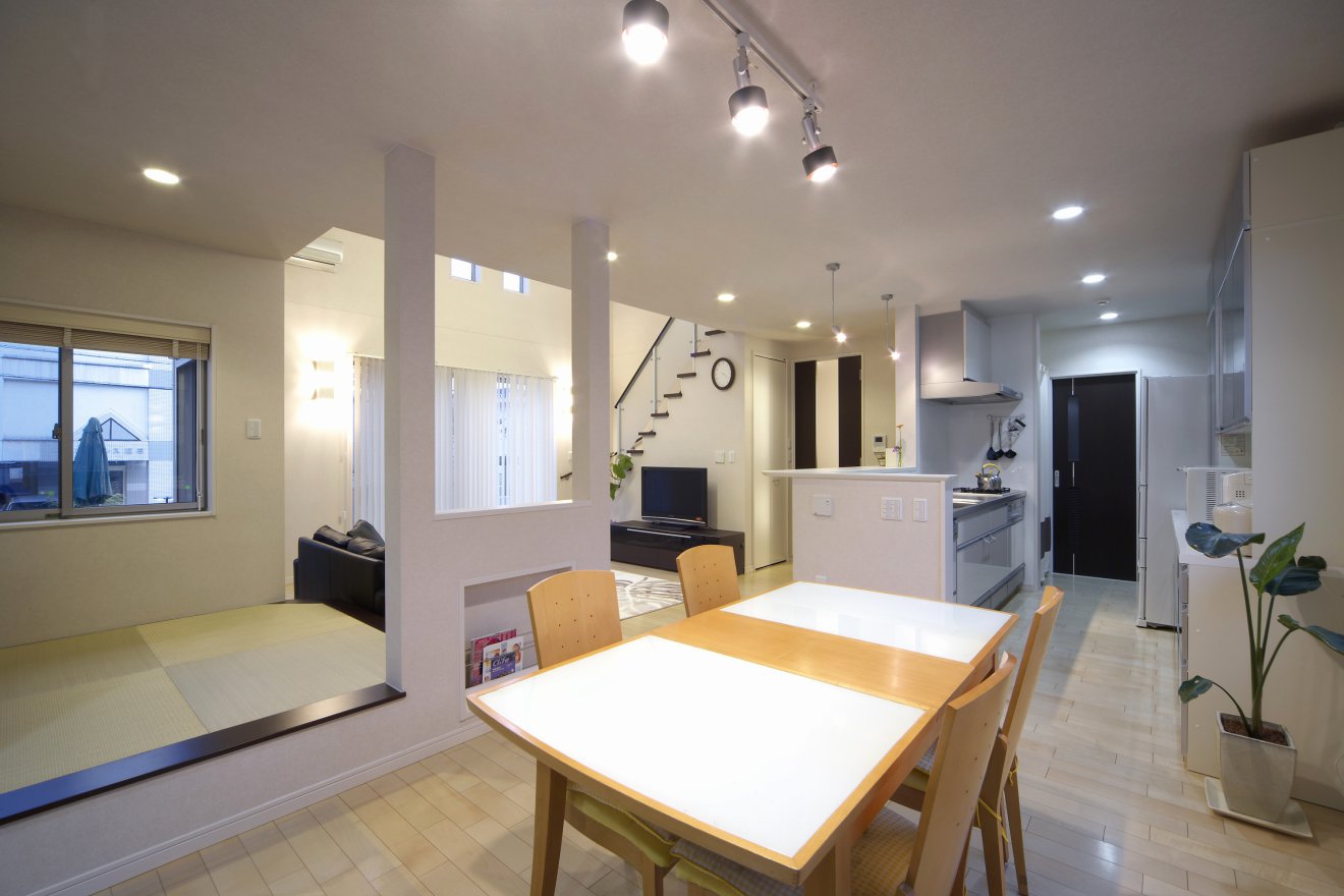 【LDK】明るいモダンテイストのインテリアで全体をコーディネート。キッチンからはリビング・ダイニング、畳コーナーまで見渡せるので、家族との会話を楽しみながらお料理ができます。